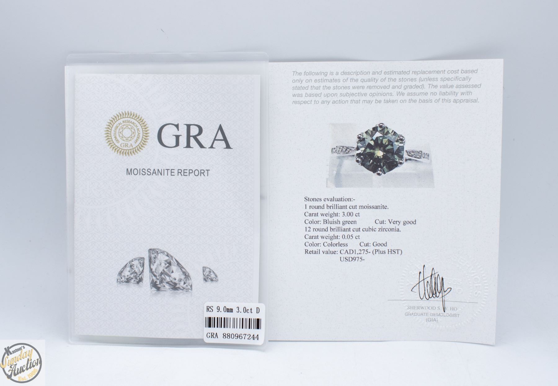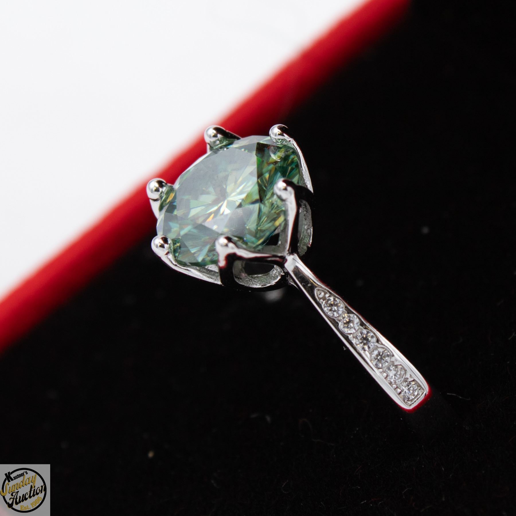 CUT MOISSANITE STONE VVS BLUISH GREEN COLOR WITH 12 ROUND BRILLIANT CUT CUBIC ZIRCONIA SET IN SHANKS SET IN 925 SILVER RING SIZE 8.25 RETAIL VALUE $1,275.00 **ALL ITEMS MUST BE REMOVED BY 5PM SATURDAY, MARCH 28TH 2026. ALL REMAINING ITEMS WILL BE SUBJECT TO A $6.00 PER DAY STORAGE CHARGE. ANY ITEMS REMAINING AFTER MONDAY, APRIL 20TH 2026 WILL BE CONSIDERED FORFEITED. NO REFUNDS WILL BE ISSUED FOR FORFEITED ITEMS. TO SCHEDULE A PICK UP APPOINTMENT CLICK HERE