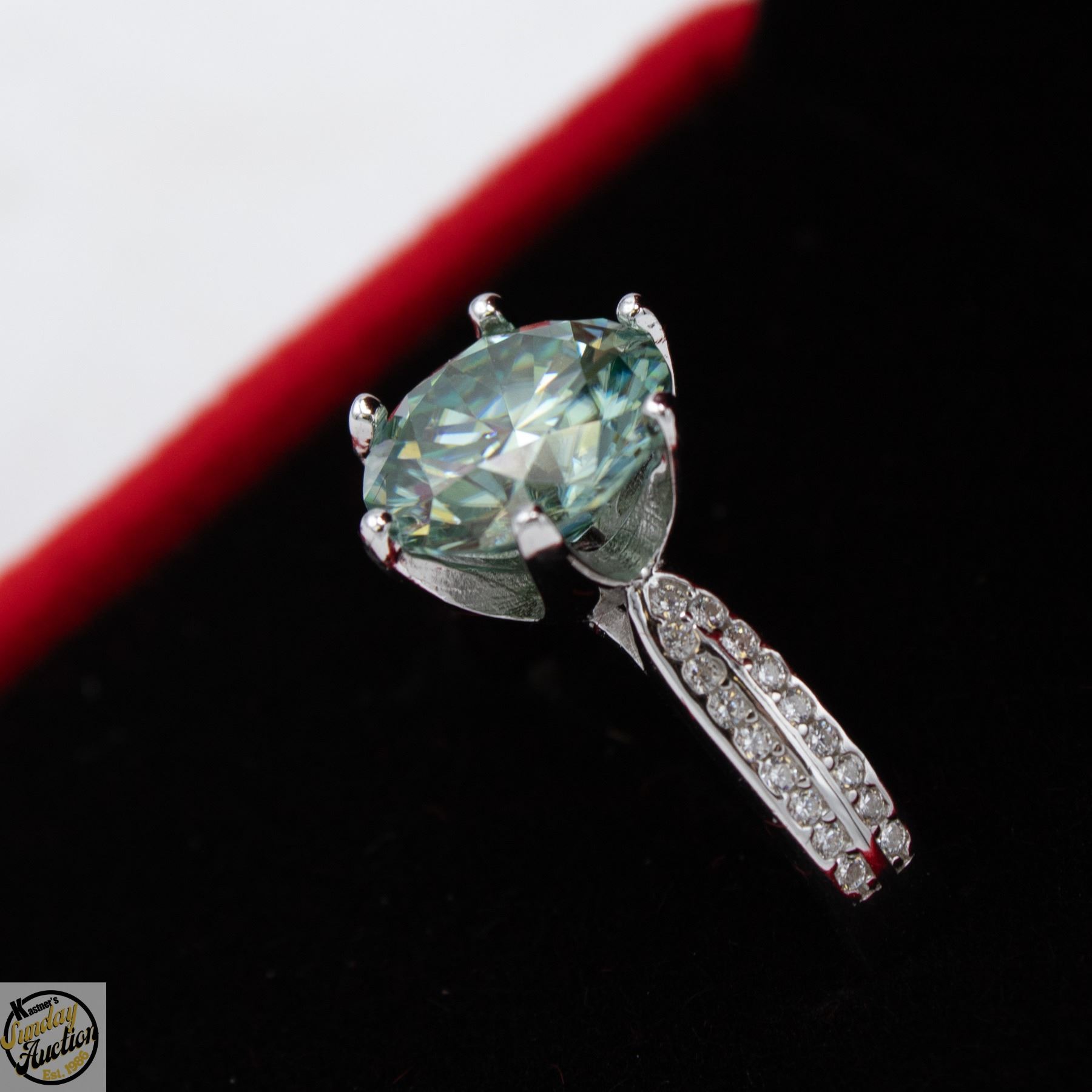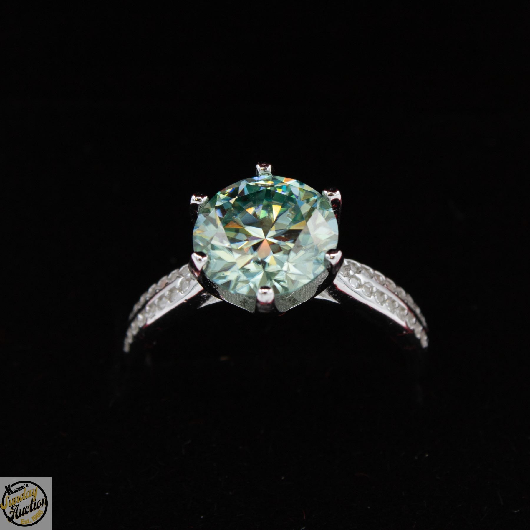 CUT MOISSANITE STONE VVS BLUE COLOR WITH 34 ROUND BRILLIANT CUT CUBIC ZIRCONIA SET IN 2 ROWS IN SHANKS SET IN 925 SILVER RING SIZE 7 RETAIL VALUE $1,275.00 **ALL ITEMS MUST BE REMOVED BY 5PM SATURDAY, MARCH 28TH 2026. ALL REMAINING ITEMS WILL BE SUBJECT TO A $6.00 PER DAY STORAGE CHARGE. ANY ITEMS REMAINING AFTER MONDAY, APRIL 20TH 2026 WILL BE CONSIDERED FORFEITED. NO REFUNDS WILL BE ISSUED FOR FORFEITED ITEMS. TO SCHEDULE A PICK UP APPOINTMENT CLICK HERE