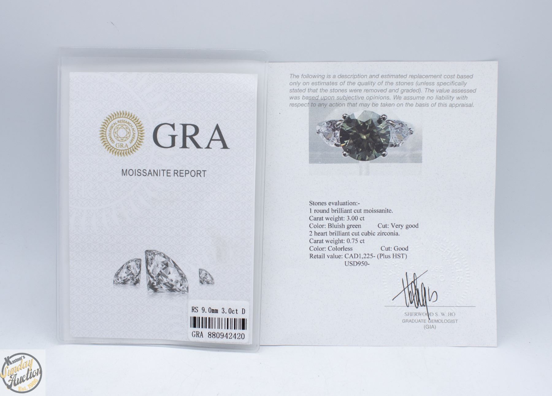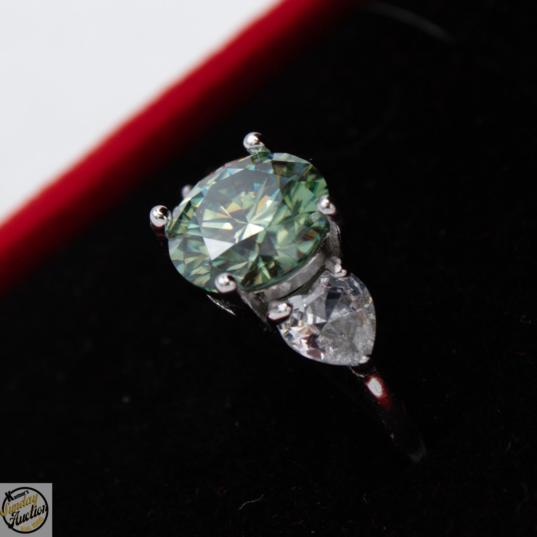 CUT MOISSANITE STONE VVS BLUISH GREEN COLOR WITH A HEART SHAPED BRILLIANT CUT CUBIC ZIRCONIA SET ON EITHER SIDE IN SHANKS SET IN 925 SILVER RING SIZE 6 RETAIL VALUE $1,225.00 **ALL ITEMS MUST BE REMOVED BY 5PM SATURDAY, MARCH 28TH 2026. ALL REMAINING ITEMS WILL BE SUBJECT TO A $6.00 PER DAY STORAGE CHARGE. ANY ITEMS REMAINING AFTER MONDAY, APRIL 20TH 2026 WILL BE CONSIDERED FORFEITED. NO REFUNDS WILL BE ISSUED FOR FORFEITED ITEMS. TO SCHEDULE A PICK UP APPOINTMENT CLICK HERE