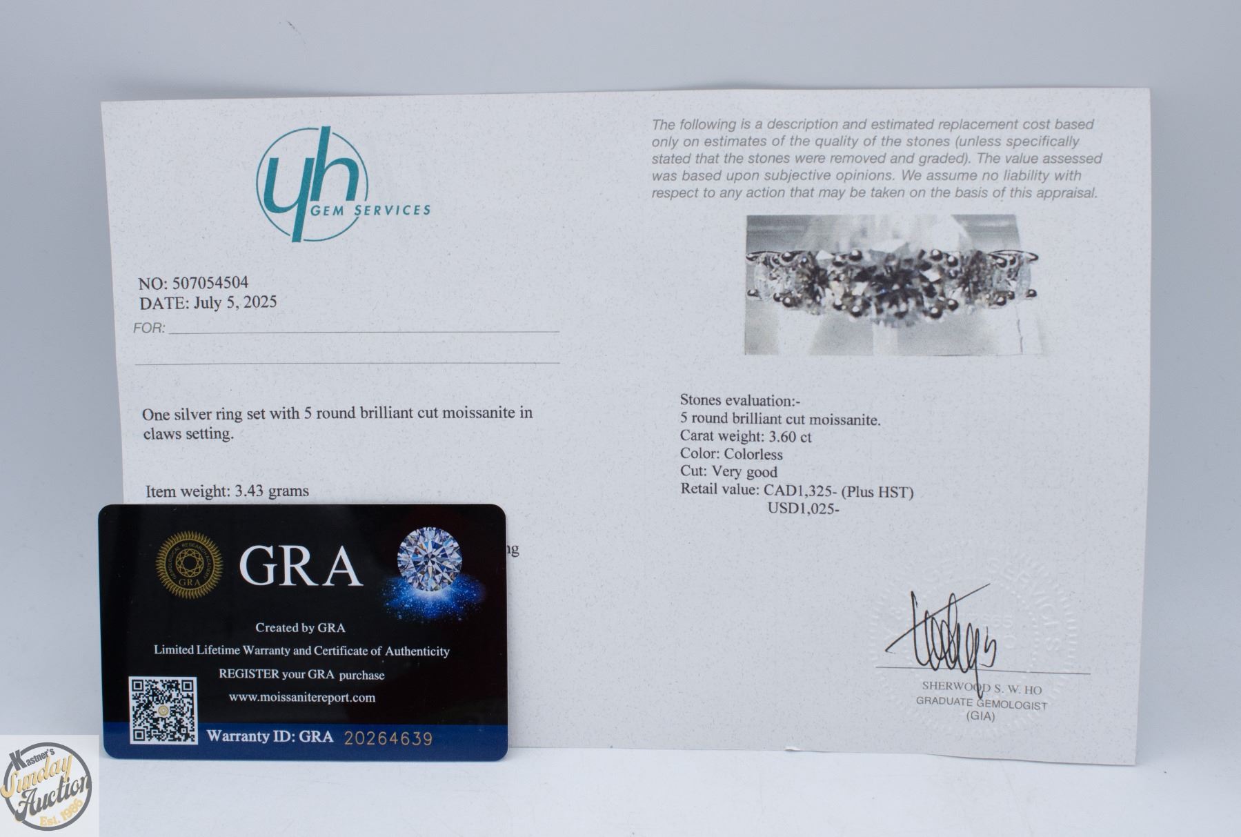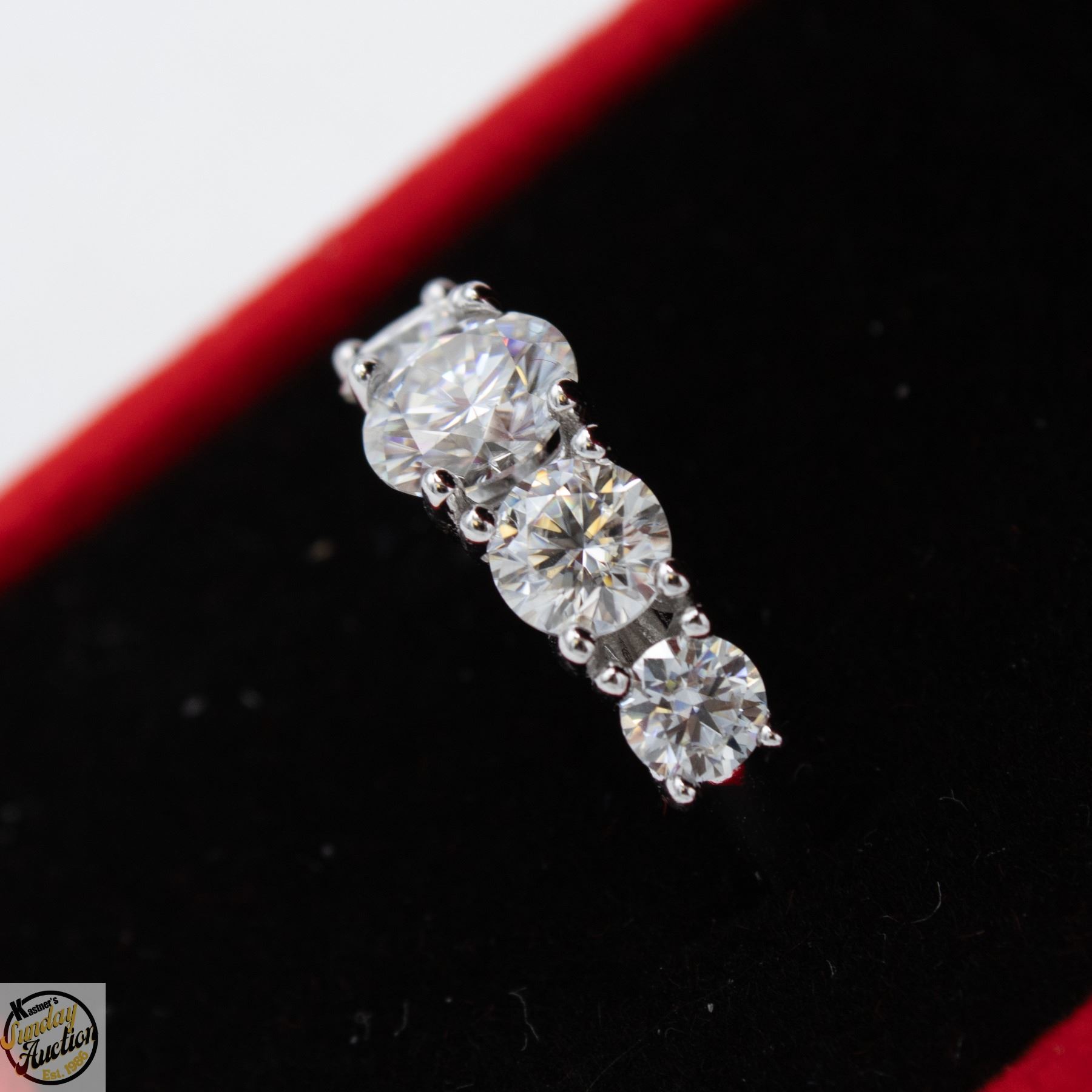 BRILLIANT CUT MOISSANITE STONE VVS D COLOR WITH THE 5 MOISSANITE STONES SET GRADUATING DOWN IN SIZE FROM CENTER SET IN 925 SILVER RING SIZE 6 RETAIL VALUE $1,325.00 **ALL ITEMS MUST BE REMOVED BY 5PM SATURDAY, MARCH 28TH 2026. ALL REMAINING ITEMS WILL BE SUBJECT TO A $6.00 PER DAY STORAGE CHARGE. ANY ITEMS REMAINING AFTER MONDAY, APRIL 20TH 2026 WILL BE CONSIDERED FORFEITED. NO REFUNDS WILL BE ISSUED FOR FORFEITED ITEMS. TO SCHEDULE A PICK UP APPOINTMENT CLICK HERE