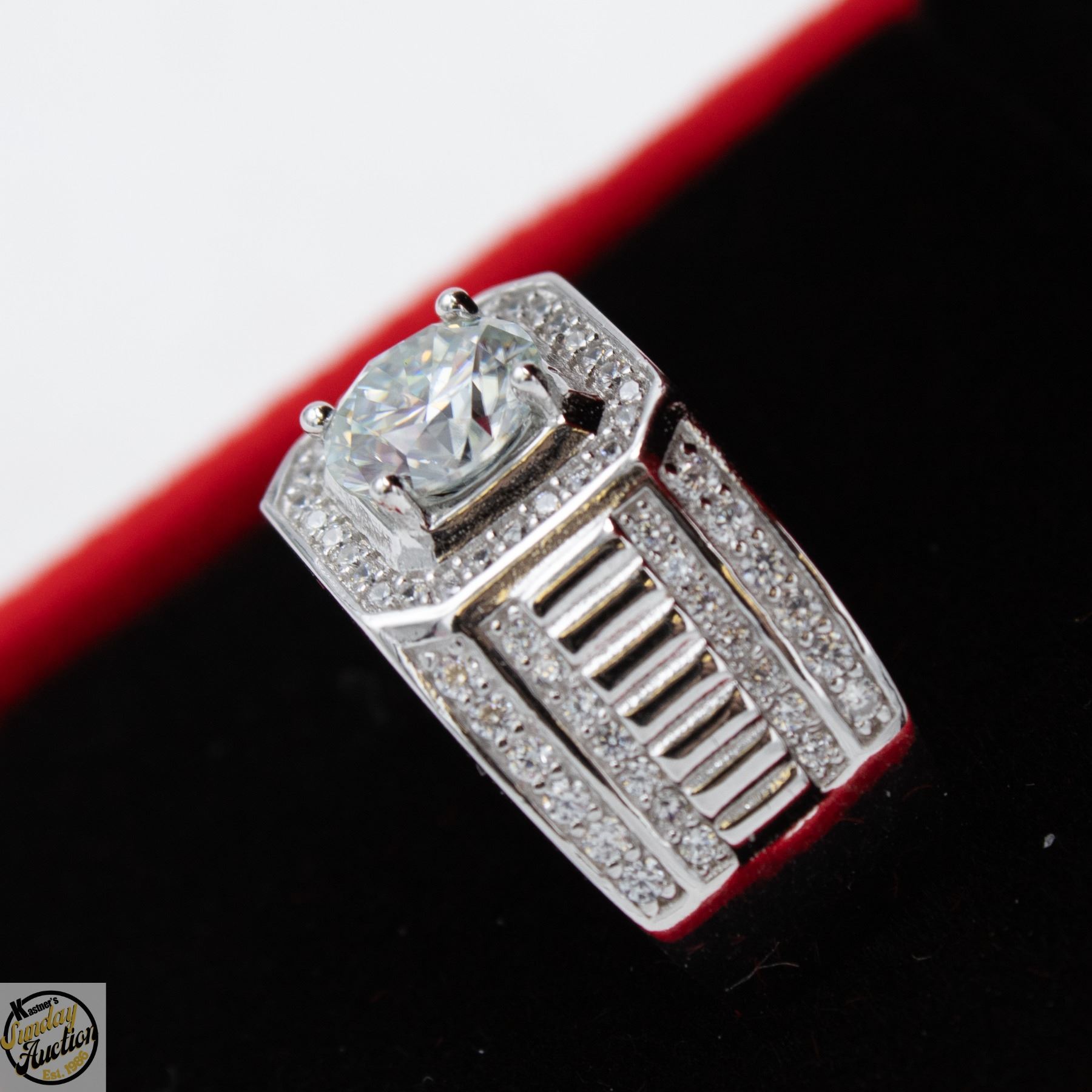 CUT MOISSANITE STONE VVS D COLOR WITH 84 ROUND BRILLIANT CUT CUBIC ZIRCONIA SET IN SQUARE HALO AND 4 ROWS IN SHANKS SET IN 925 SILVER RING SIZE 9 RETAIL VALUE $975.00 **ALL ITEMS MUST BE REMOVED BY 5PM SATURDAY, MARCH 28TH 2026. ALL REMAINING ITEMS WILL BE SUBJECT TO A $6.00 PER DAY STORAGE CHARGE. ANY ITEMS REMAINING AFTER MONDAY, APRIL 20TH 2026 WILL BE CONSIDERED FORFEITED. NO REFUNDS WILL BE ISSUED FOR FORFEITED ITEMS. TO SCHEDULE A PICK UP APPOINTMENT CLICK HERE