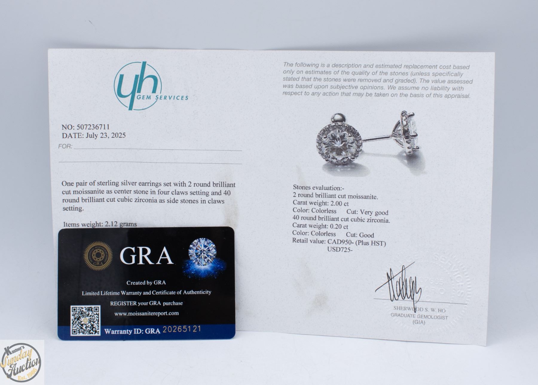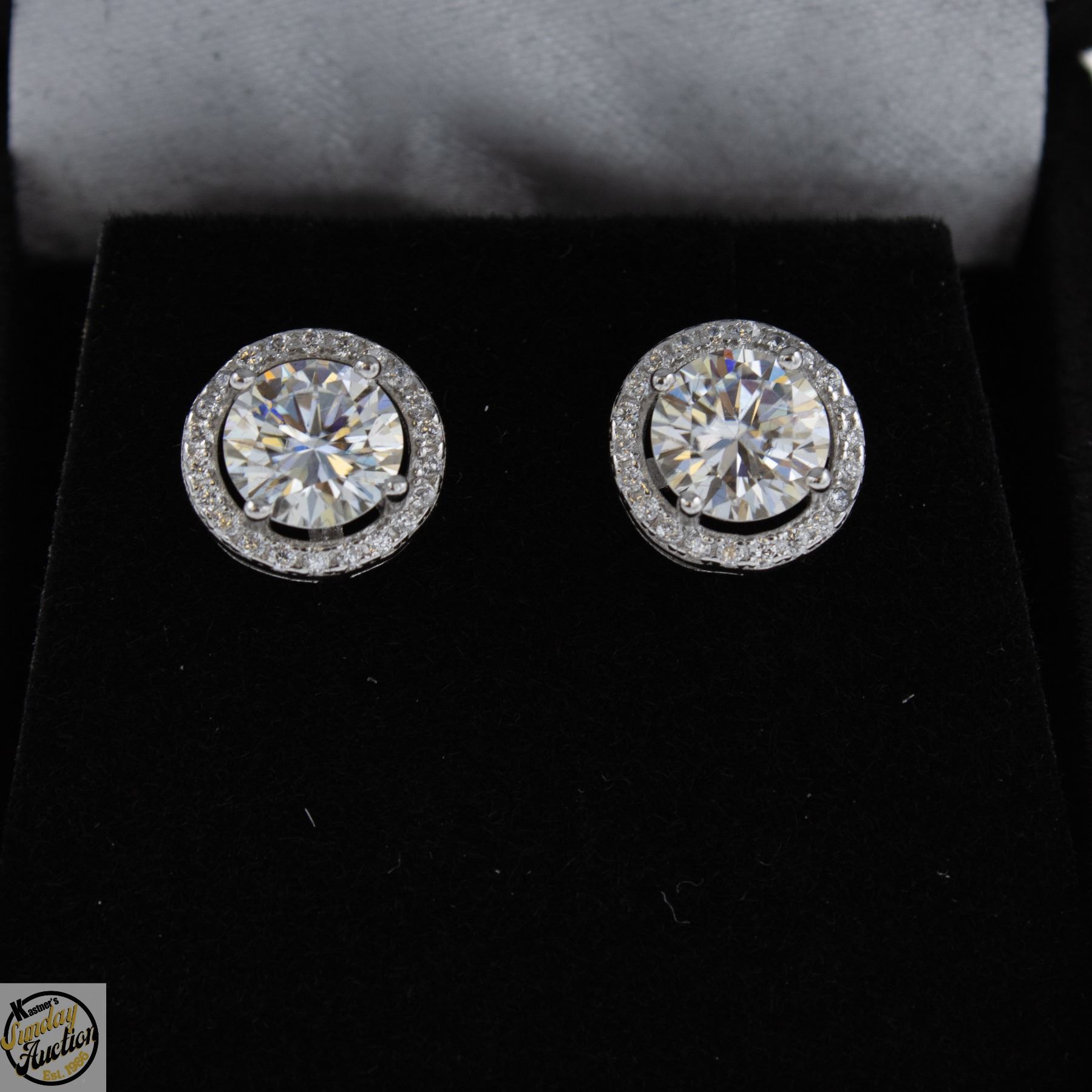 CUT MOISSANITE STONE VVS D COLOR WITH 40 ROUND BRILLIANT CUT CUBIC ZIRCONIA SET IN ROUND HALO SET IN 925 SILVER EARRINGS RETAIL VALUE $950.00 **ALL ITEMS MUST BE REMOVED BY 5PM SATURDAY, MARCH 28TH 2026. ALL REMAINING ITEMS WILL BE SUBJECT TO A $6.00 PER DAY STORAGE CHARGE. ANY ITEMS REMAINING AFTER MONDAY, APRIL 20TH 2026 WILL BE CONSIDERED FORFEITED. NO REFUNDS WILL BE ISSUED FOR FORFEITED ITEMS. TO SCHEDULE A PICK UP APPOINTMENT CLICK HERE
