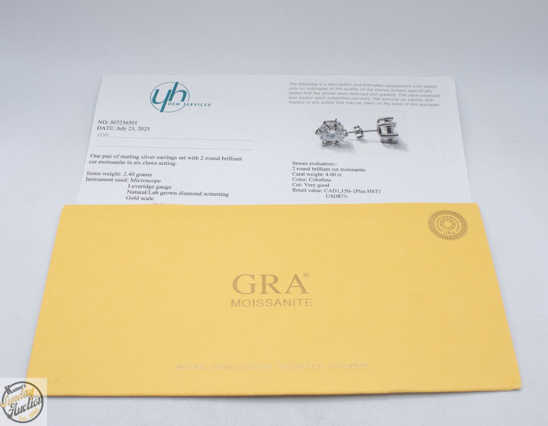 CUT MOISSANITE STONES VVS D COLOR SET IN 6 CLAW BASKET HEAD SET IN 925 SILVER EARRINGS RETAIL VALUE $1,150.00 **ALL ITEMS MUST BE REMOVED BY 5PM SATURDAY, MARCH 28TH 2026. ALL REMAINING ITEMS WILL BE SUBJECT TO A $6.00 PER DAY STORAGE CHARGE. ANY ITEMS REMAINING AFTER MONDAY, APRIL 20TH 2026 WILL BE CONSIDERED FORFEITED. NO REFUNDS WILL BE ISSUED FOR FORFEITED ITEMS. TO SCHEDULE A PICK UP APPOINTMENT CLICK HERE