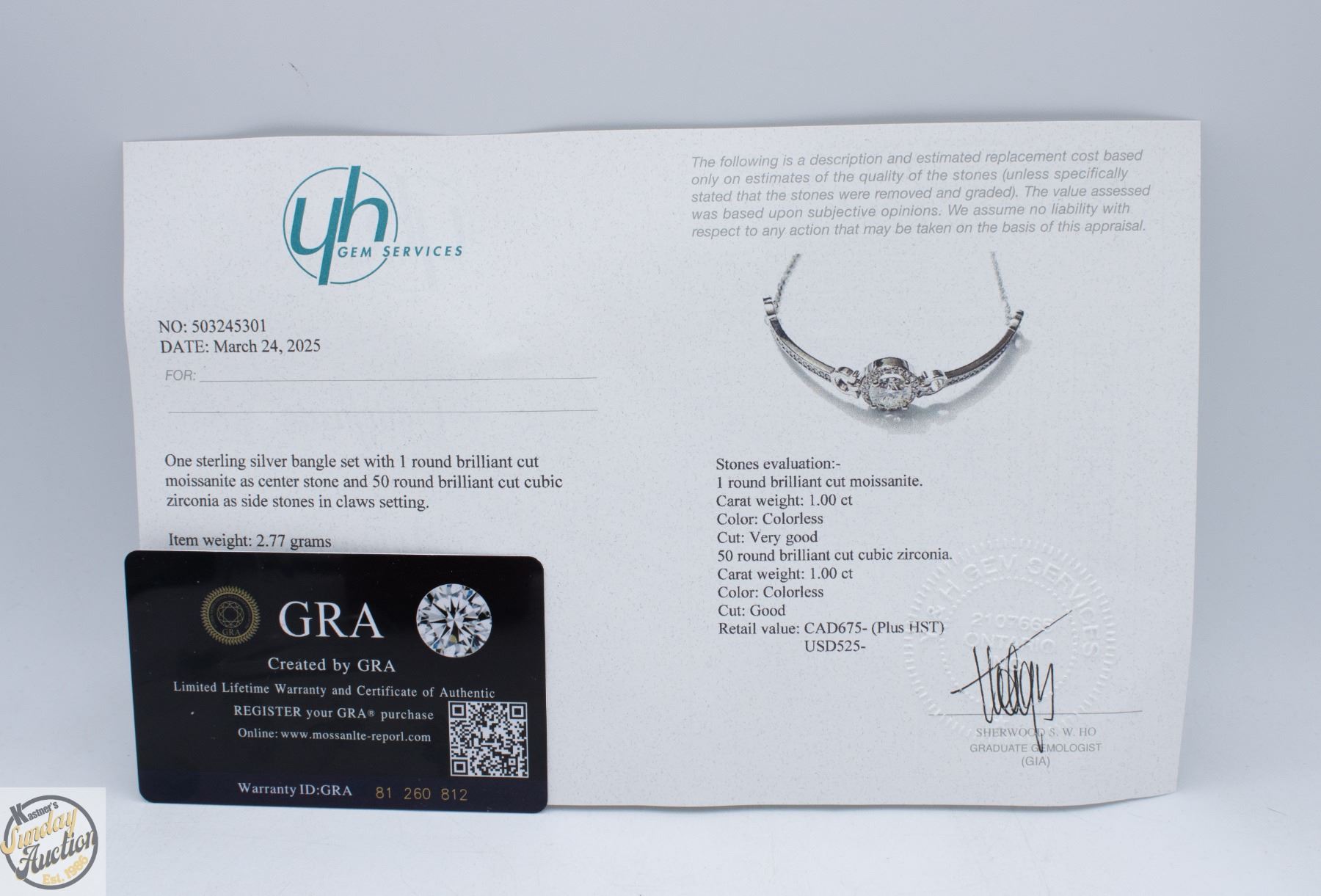 CUT MOISSANITE STONE VVS D COLOR WITH 50 ROUND BRILLIANT CUT CUBIC ZIRCONIA SET IN ROUND HALO WITH MORE IN BRACELET ARMS SET IN 925 SILVER BRACELET RETAIL VALUE $675.00 **ALL ITEMS MUST BE REMOVED BY 5PM SATURDAY, MARCH 28TH 2026. ALL REMAINING ITEMS WILL BE SUBJECT TO A $6.00 PER DAY STORAGE CHARGE. ANY ITEMS REMAINING AFTER MONDAY, APRIL 20TH 2026 WILL BE CONSIDERED FORFEITED. NO REFUNDS WILL BE ISSUED FOR FORFEITED ITEMS. TO SCHEDULE A PICK UP APPOINTMENT CLICK HERE