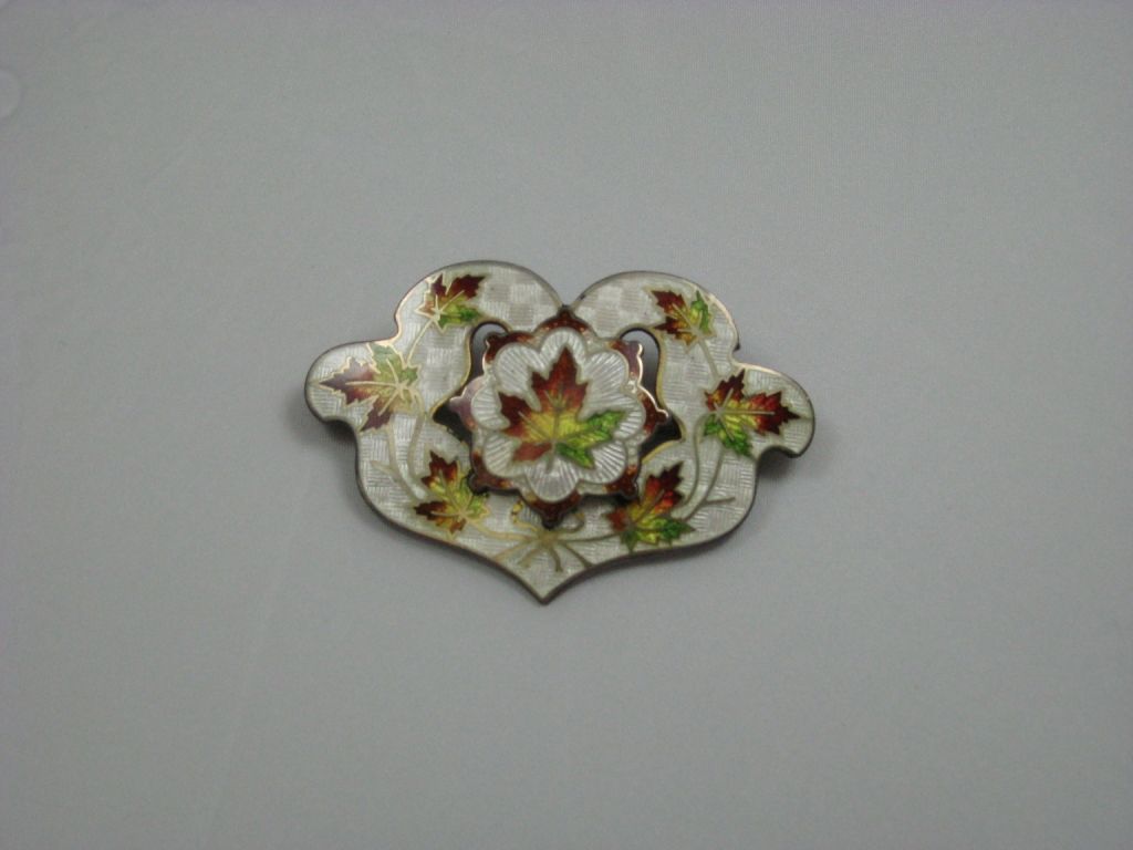 4038 - Sterling Hallmarked Cloisonne brooch of Maples on white background Circa 1920-1930white background Circa 1920-1930