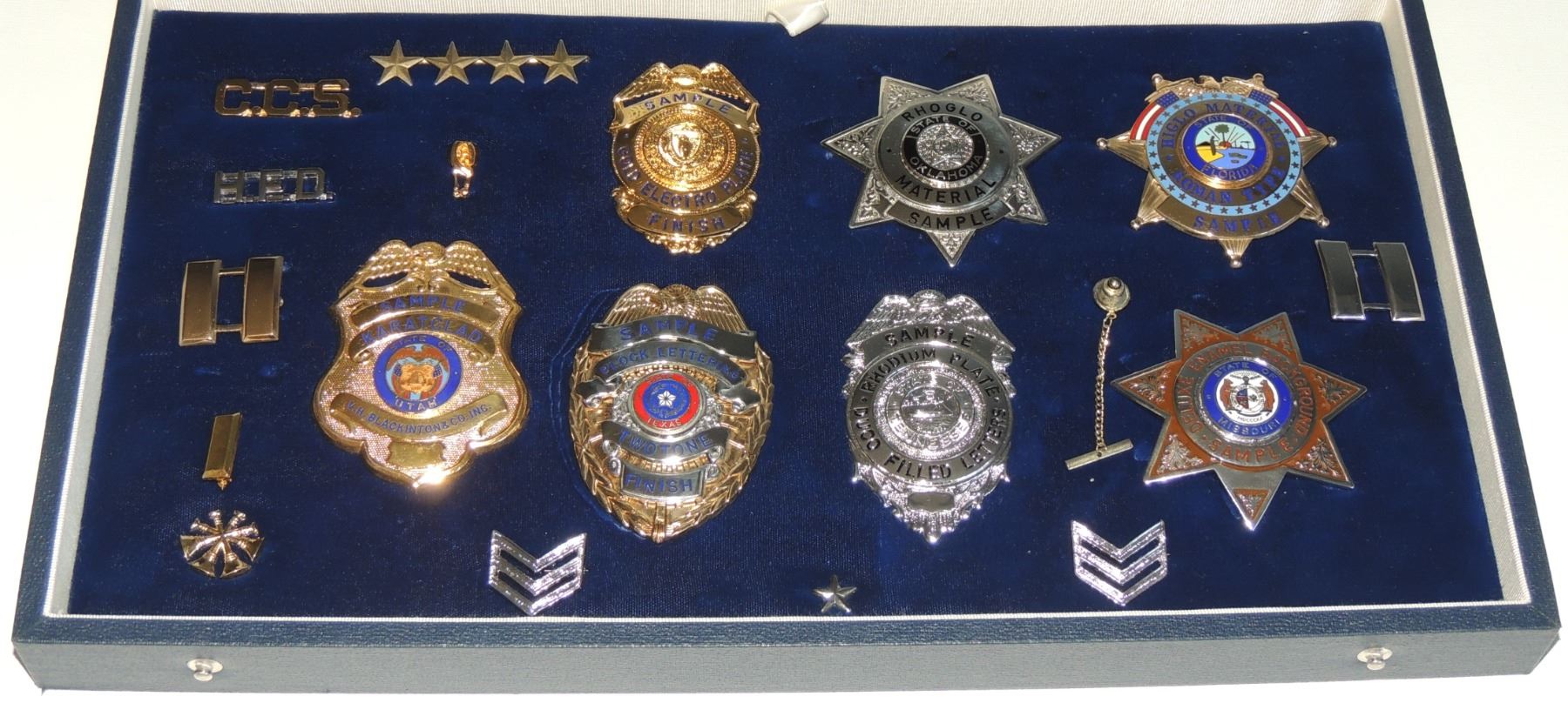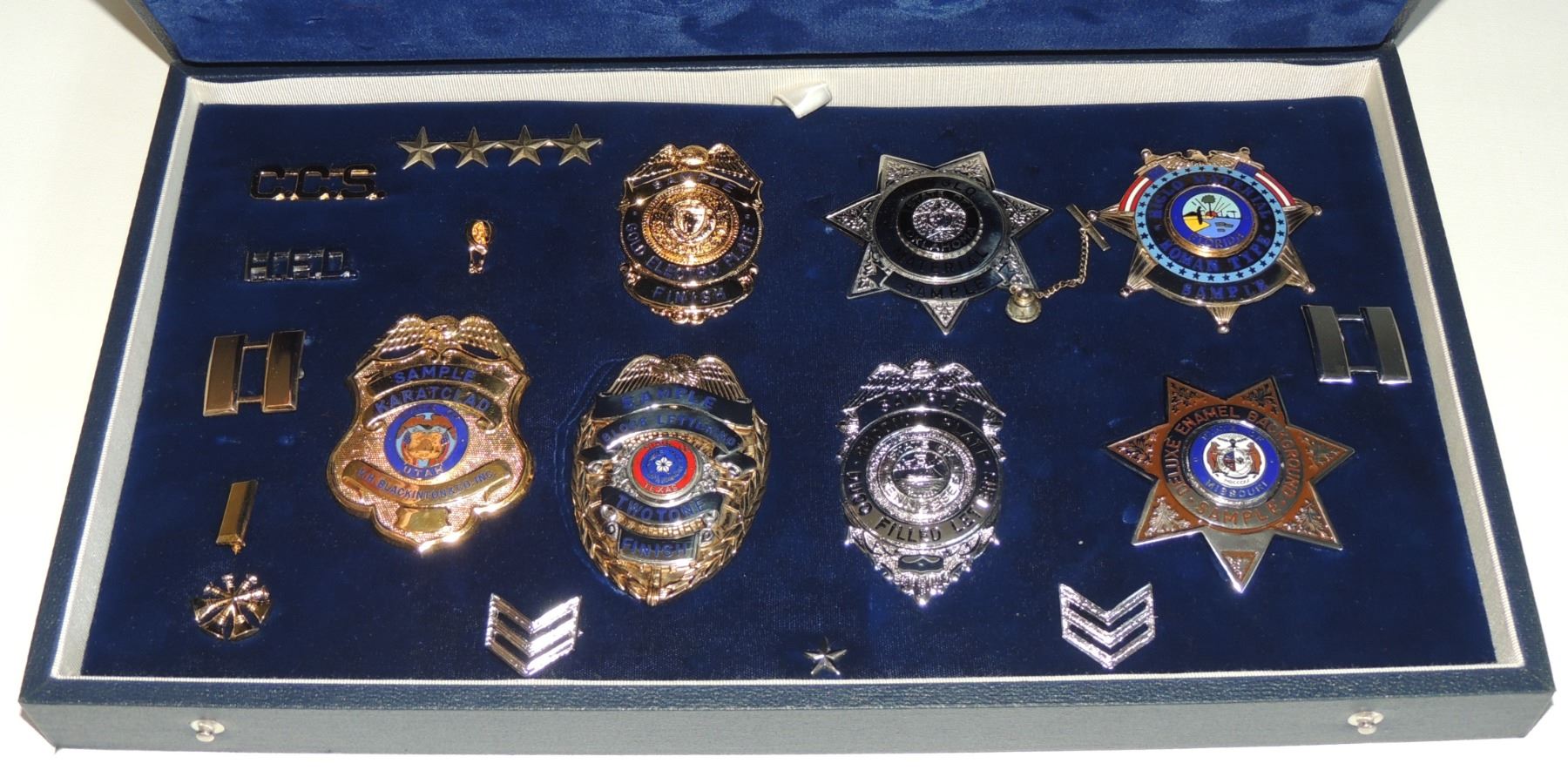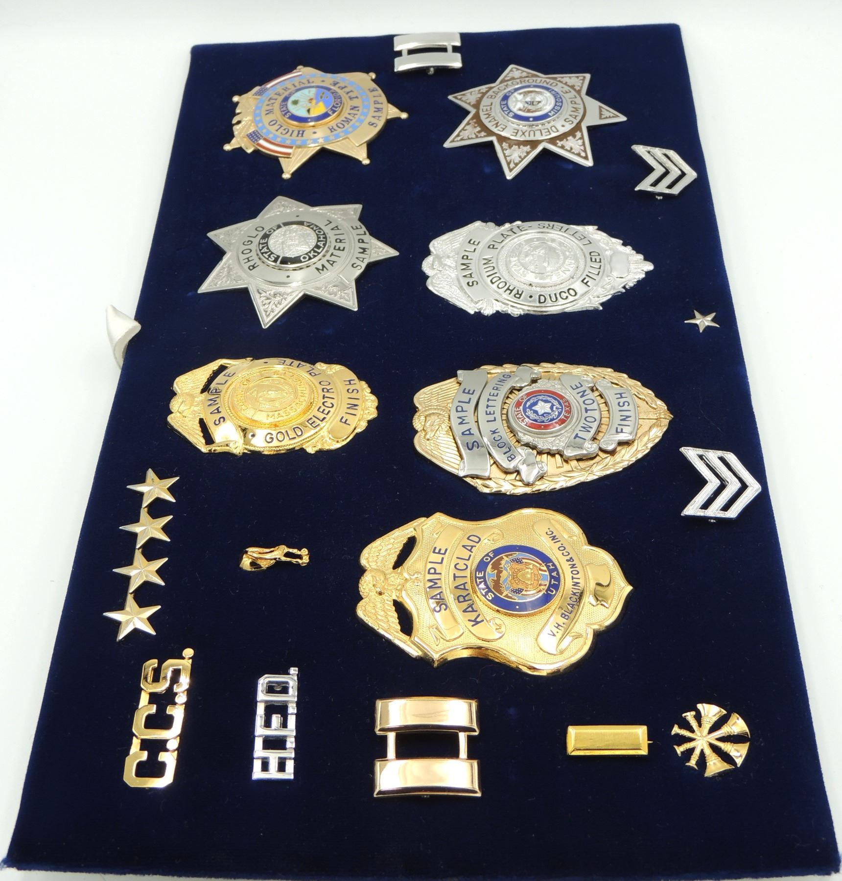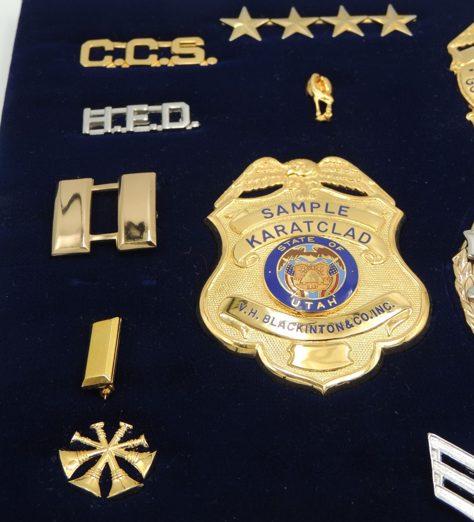 V.H. BLACKINTON & CO. INC ATTLEBORO FALLS MASSACHUSETTES USA. INCLUDES FOLDING CASE W/ 7 FULL SIZE POLICE BADGE AND SHIELD VARIATIONS, WITH ADDITIONAL 11 RANK INSIGNIA AND COLLAR BADGES PRODUCED BY THE COMPANY. BADGES AND INSIGNIA CAN BE REMOVED OFF BLUE BOARD TO REVEAL REVERSE PINS AND MARKINGS. EACH BADGE DESCRIBLES FINISH/STYLE/VARIATION BADGE TYPE. EXCELLENT QUALITY AND RARE SALESMAN SAMPLE CASE WITH POLICE INSIGNIA, TO FAMOUS LAW ENFORCEMENT BADGE PRODUCER BLACKINTON & CO.