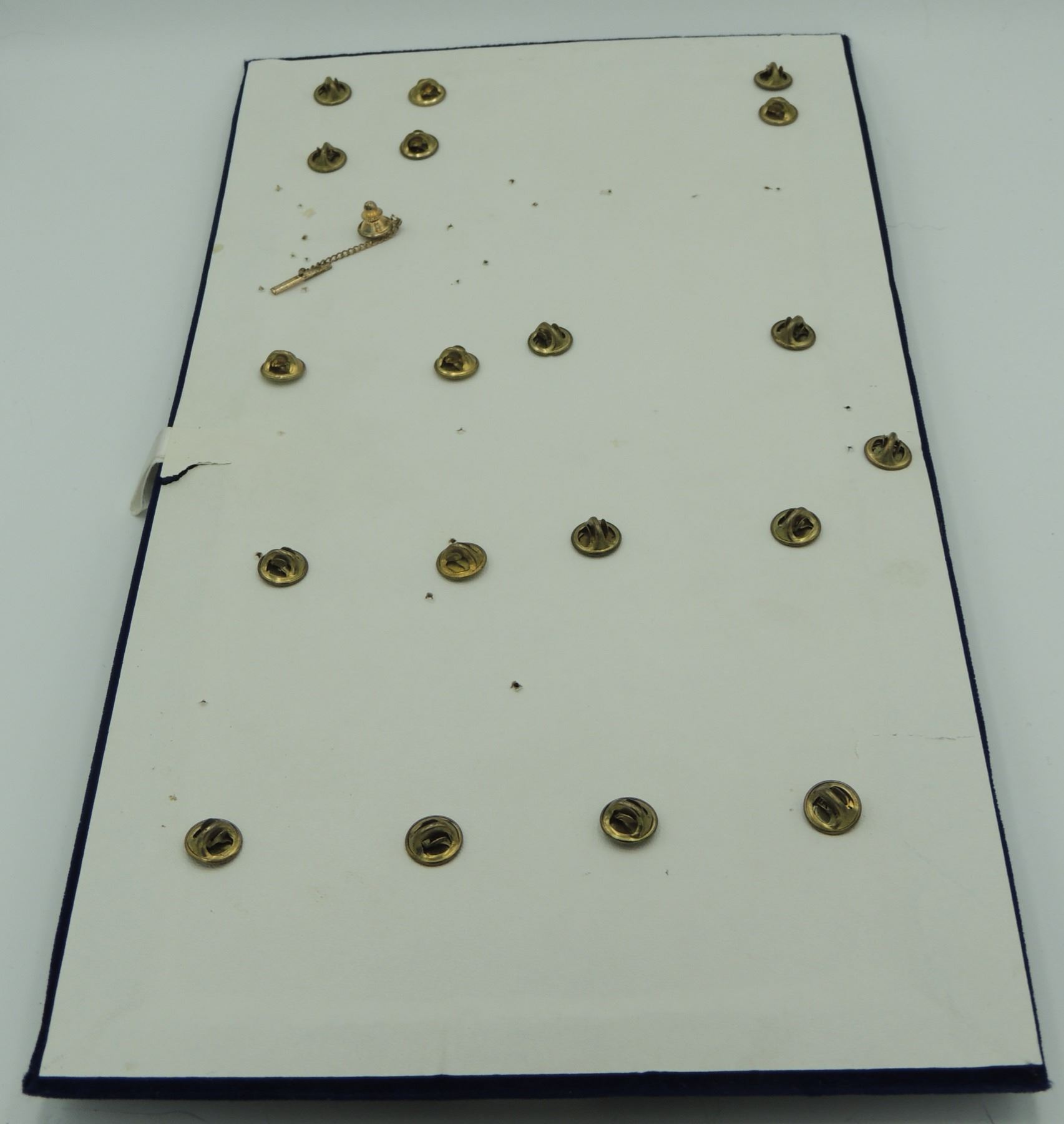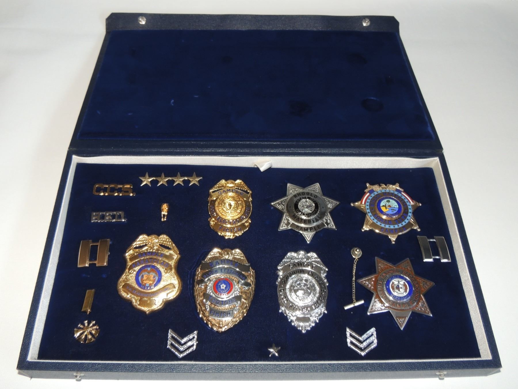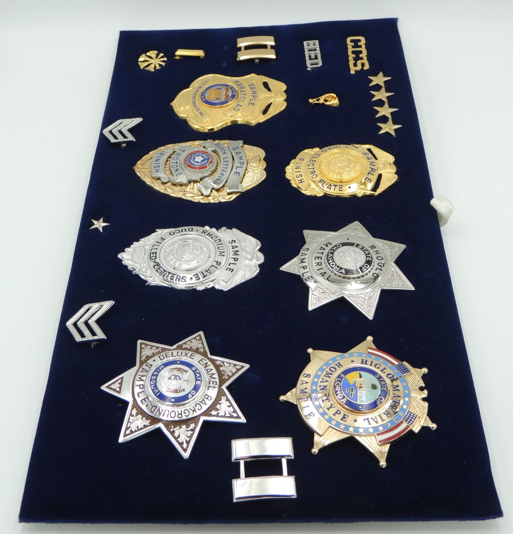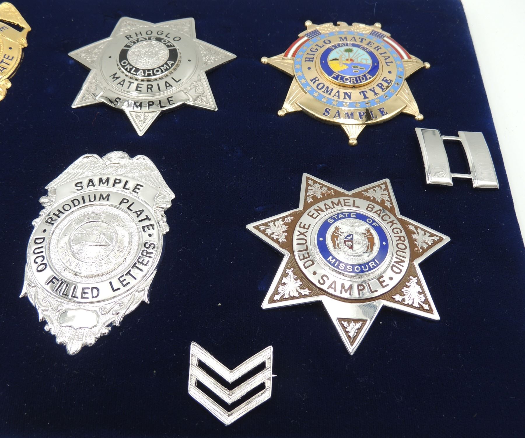 V.H. BLACKINTON & CO. INC ATTLEBORO FALLS MASSACHUSETTES USA. INCLUDES FOLDING CASE W/ 7 FULL SIZE POLICE BADGE AND SHIELD VARIATIONS, WITH ADDITIONAL 11 RANK INSIGNIA AND COLLAR BADGES PRODUCED BY THE COMPANY. BADGES AND INSIGNIA CAN BE REMOVED OFF BLUE BOARD TO REVEAL REVERSE PINS AND MARKINGS. EACH BADGE DESCRIBLES FINISH/STYLE/VARIATION BADGE TYPE. EXCELLENT QUALITY AND RARE SALESMAN SAMPLE CASE WITH POLICE INSIGNIA, TO FAMOUS LAW ENFORCEMENT BADGE PRODUCER BLACKINTON & CO.