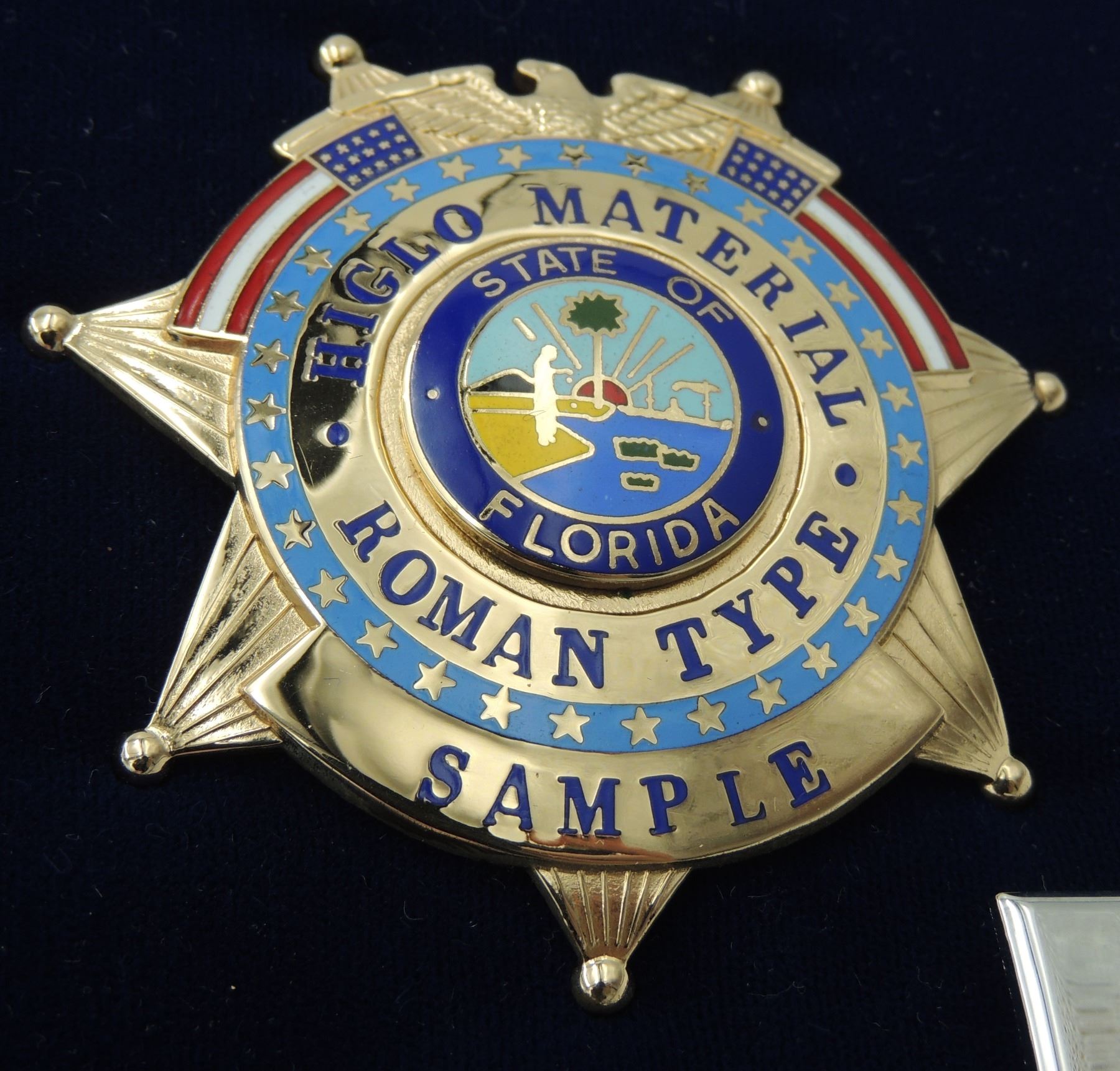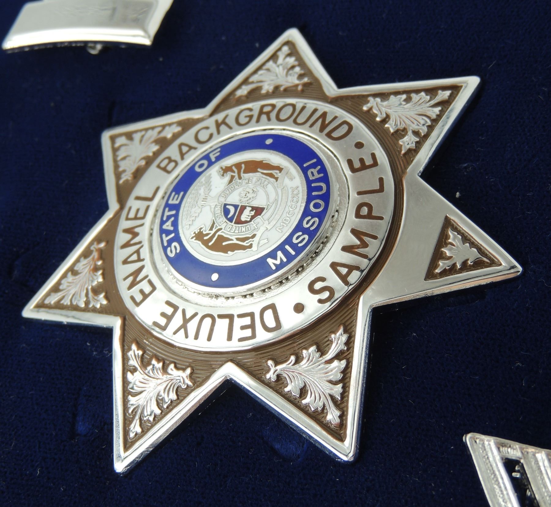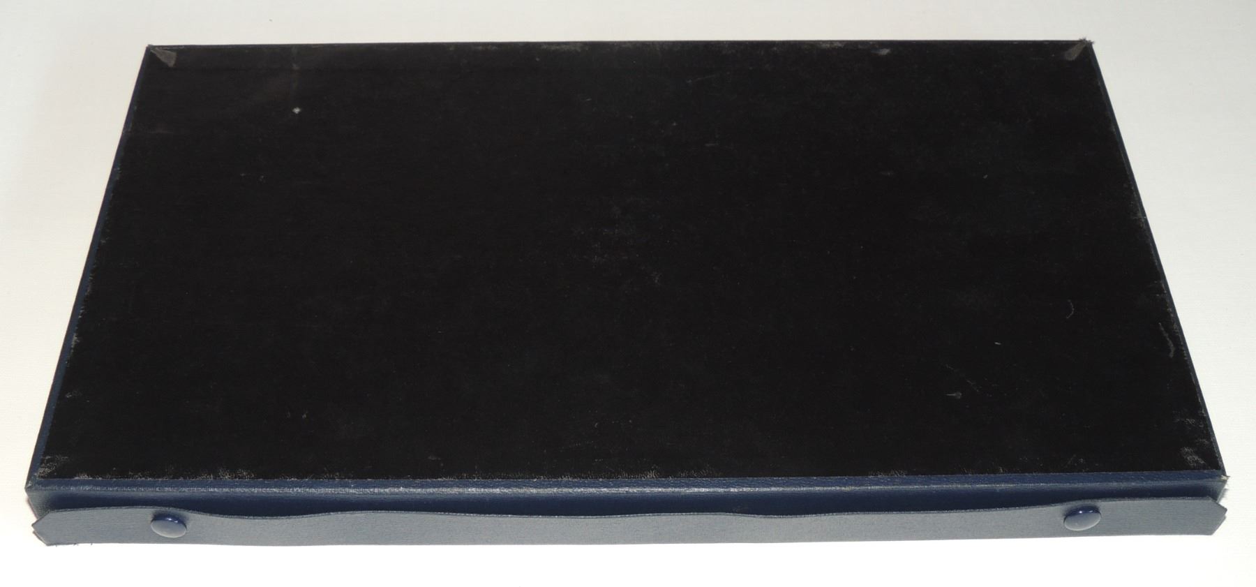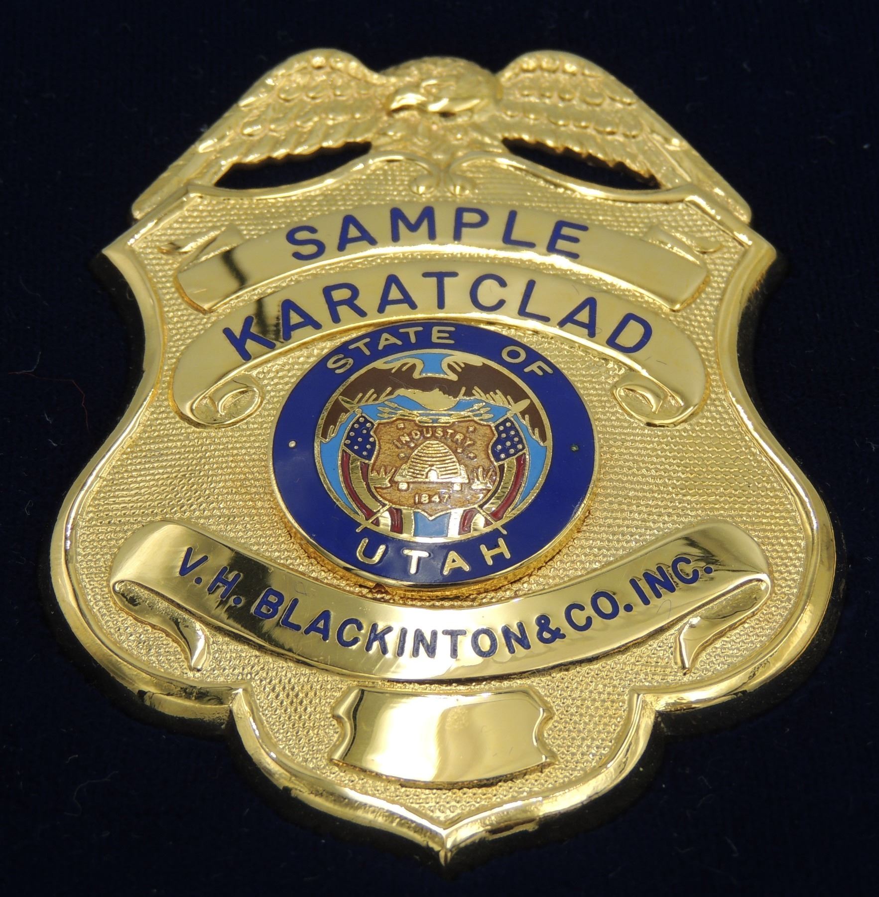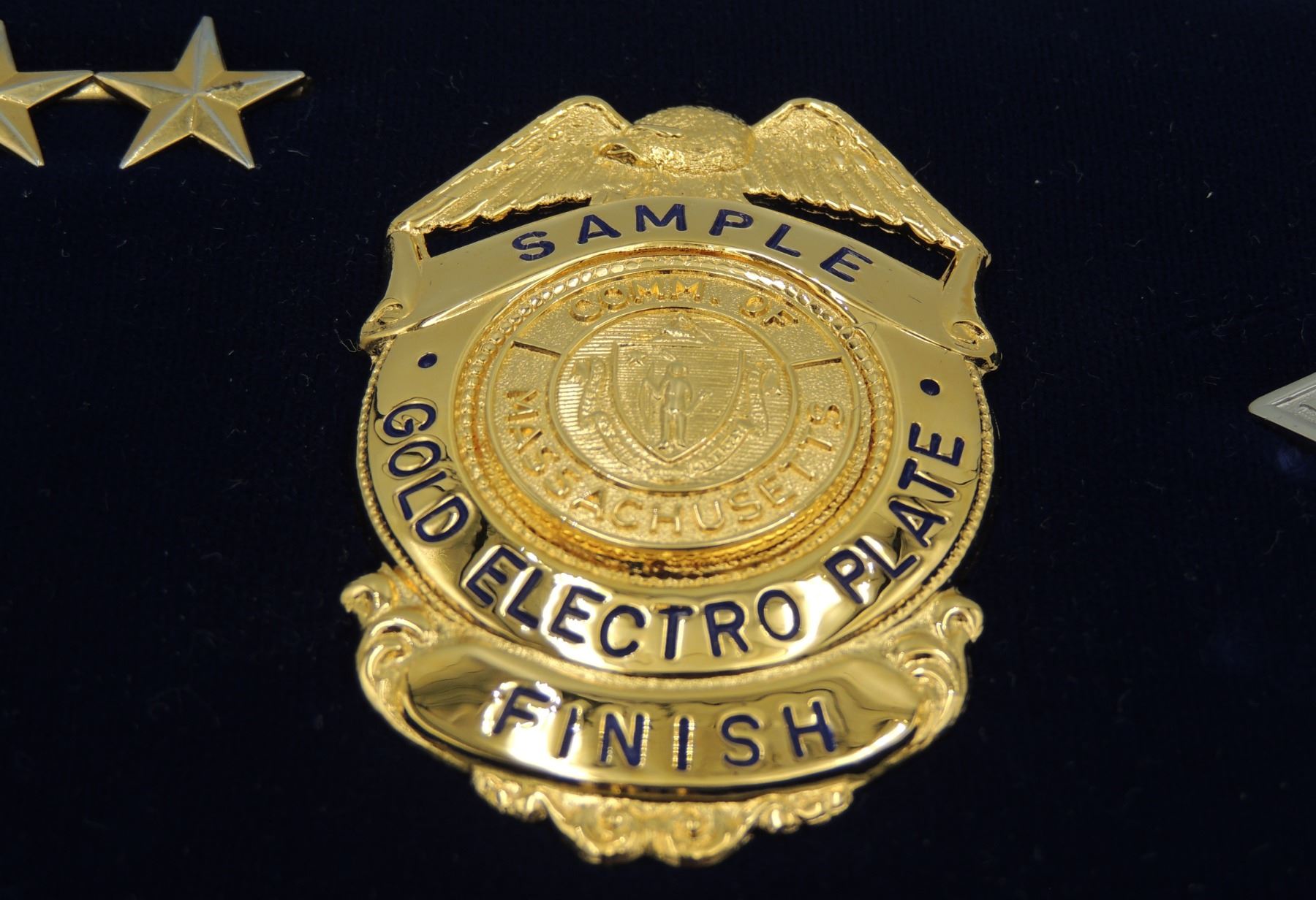 V.H. BLACKINTON & CO. INC ATTLEBORO FALLS MASSACHUSETTES USA. INCLUDES FOLDING CASE W/ 7 FULL SIZE POLICE BADGE AND SHIELD VARIATIONS, WITH ADDITIONAL 11 RANK INSIGNIA AND COLLAR BADGES PRODUCED BY THE COMPANY. BADGES AND INSIGNIA CAN BE REMOVED OFF BLUE BOARD TO REVEAL REVERSE PINS AND MARKINGS. EACH BADGE DESCRIBLES FINISH/STYLE/VARIATION BADGE TYPE. EXCELLENT QUALITY AND RARE SALESMAN SAMPLE CASE WITH POLICE INSIGNIA, TO FAMOUS LAW ENFORCEMENT BADGE PRODUCER BLACKINTON & CO.