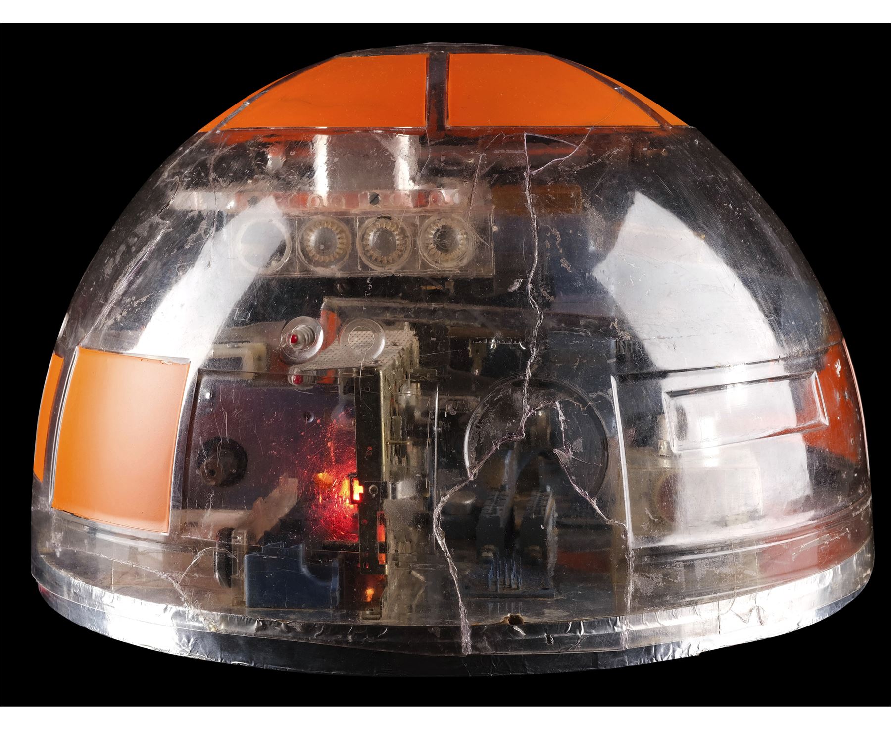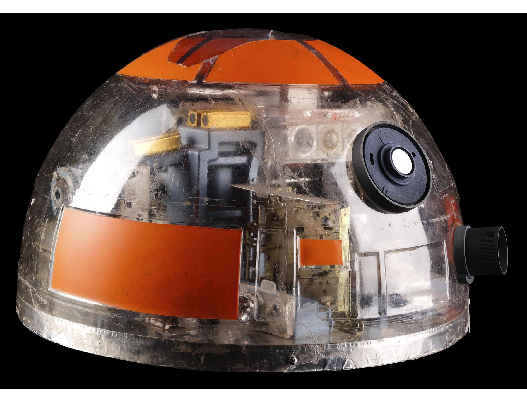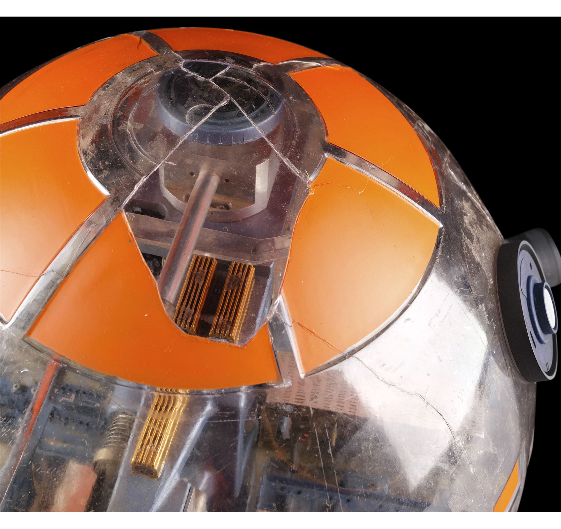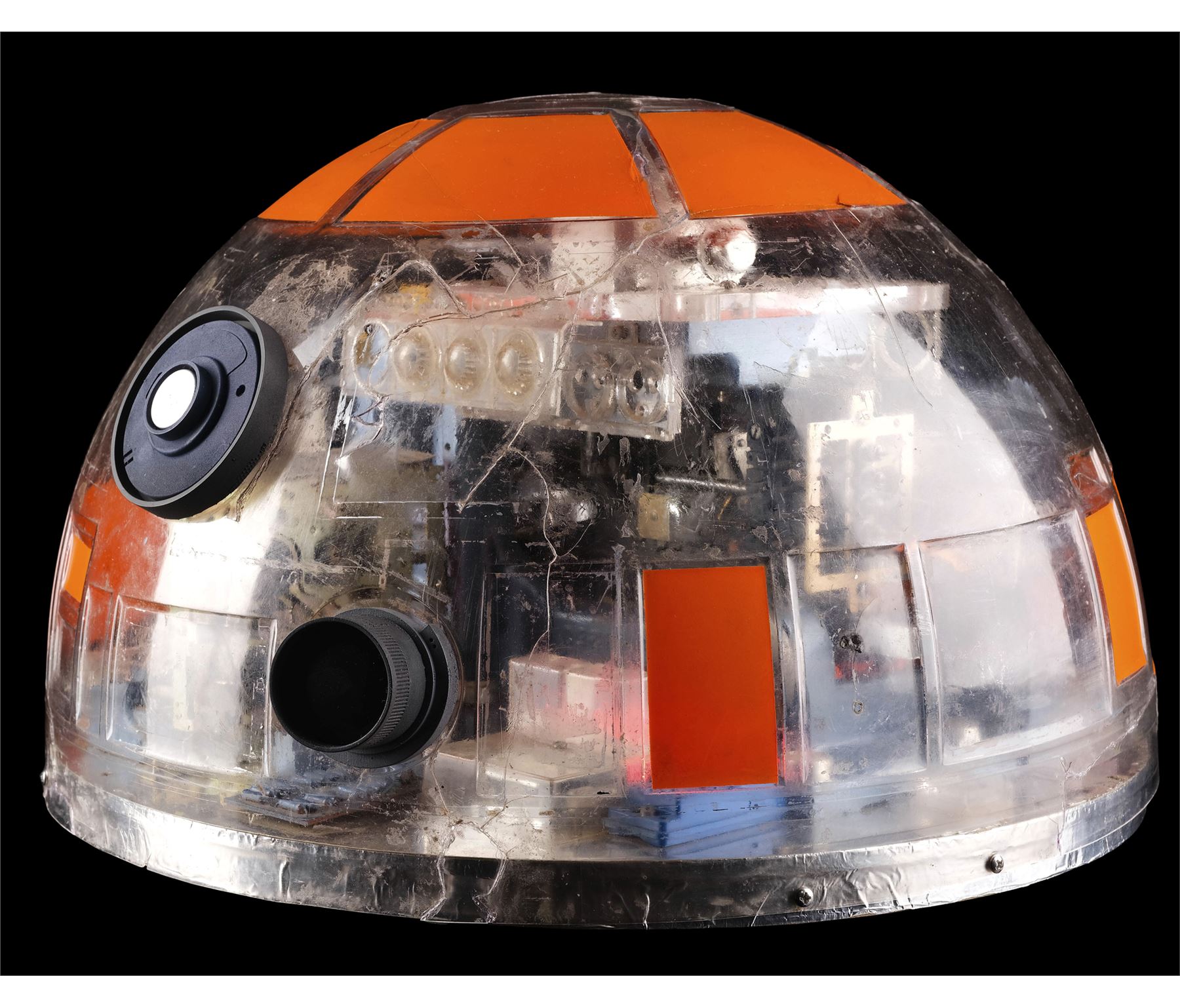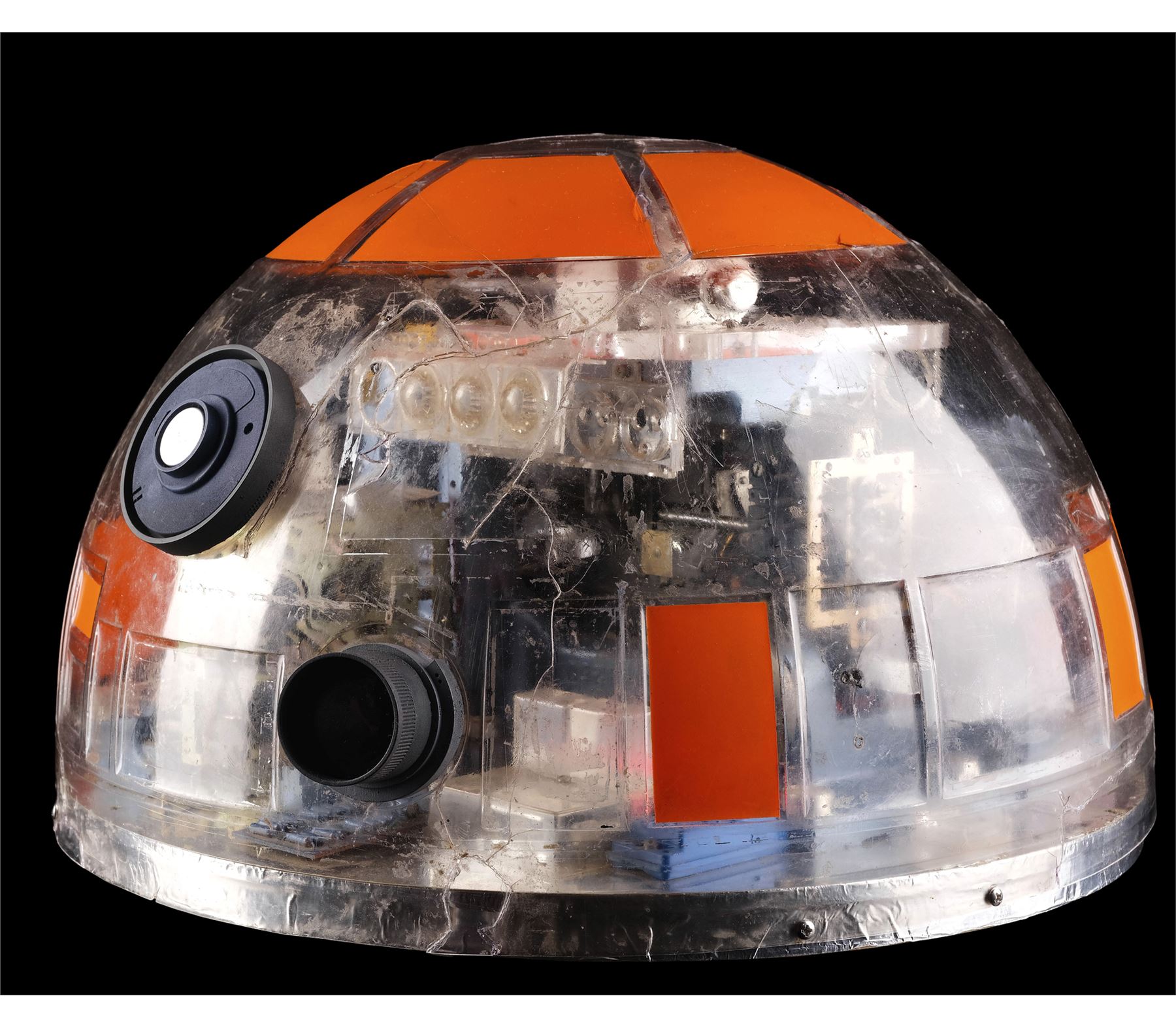 The mechanical interior of this droid head was assembled from real-world industrial scrap components, model kit parts, and other found objects - a technique used for prop building throughout the original Star Wars trilogy. It is cosmetic only and has no functionality. The dome was vacuum-formed from clear plastic with debossed panels. A small incandescent light was installed in the interior of the head, and the exterior dome was dressed with greeblies and several of the debossed panels were painted orange.