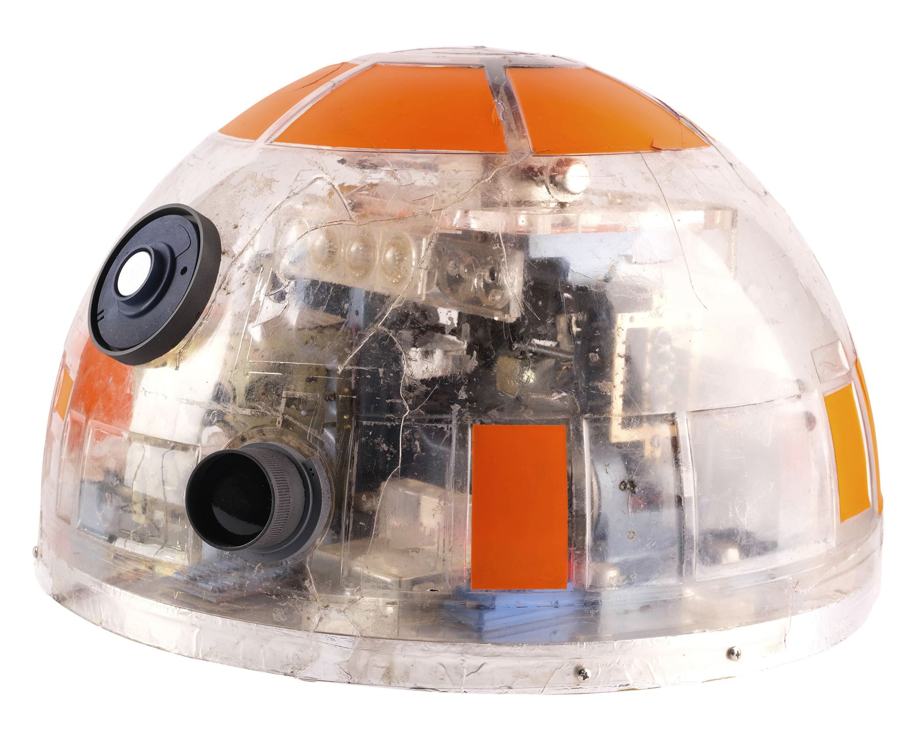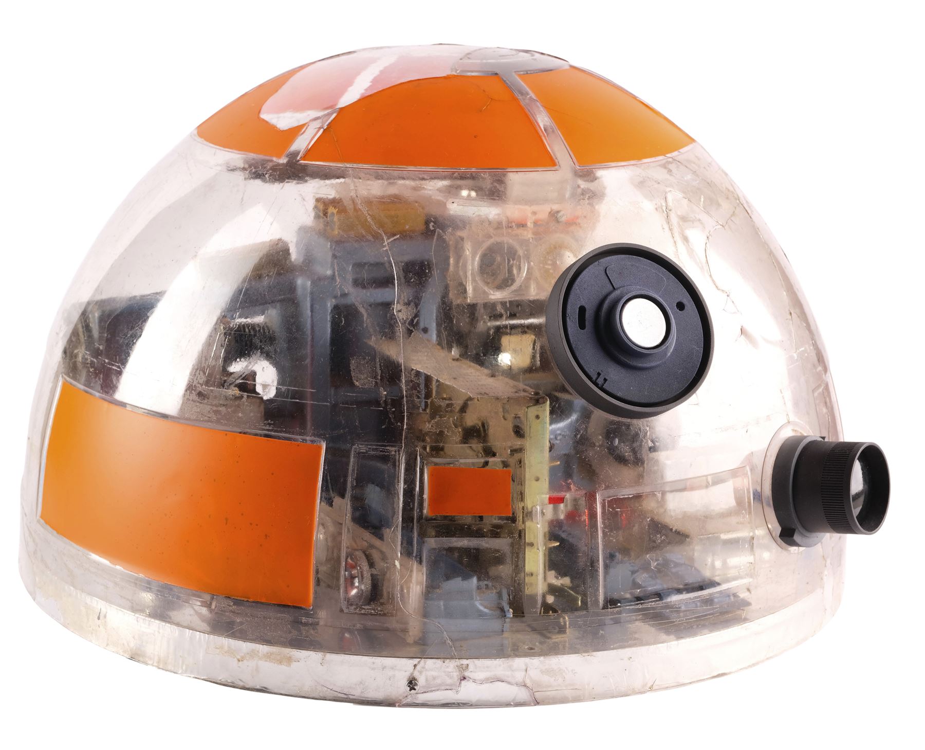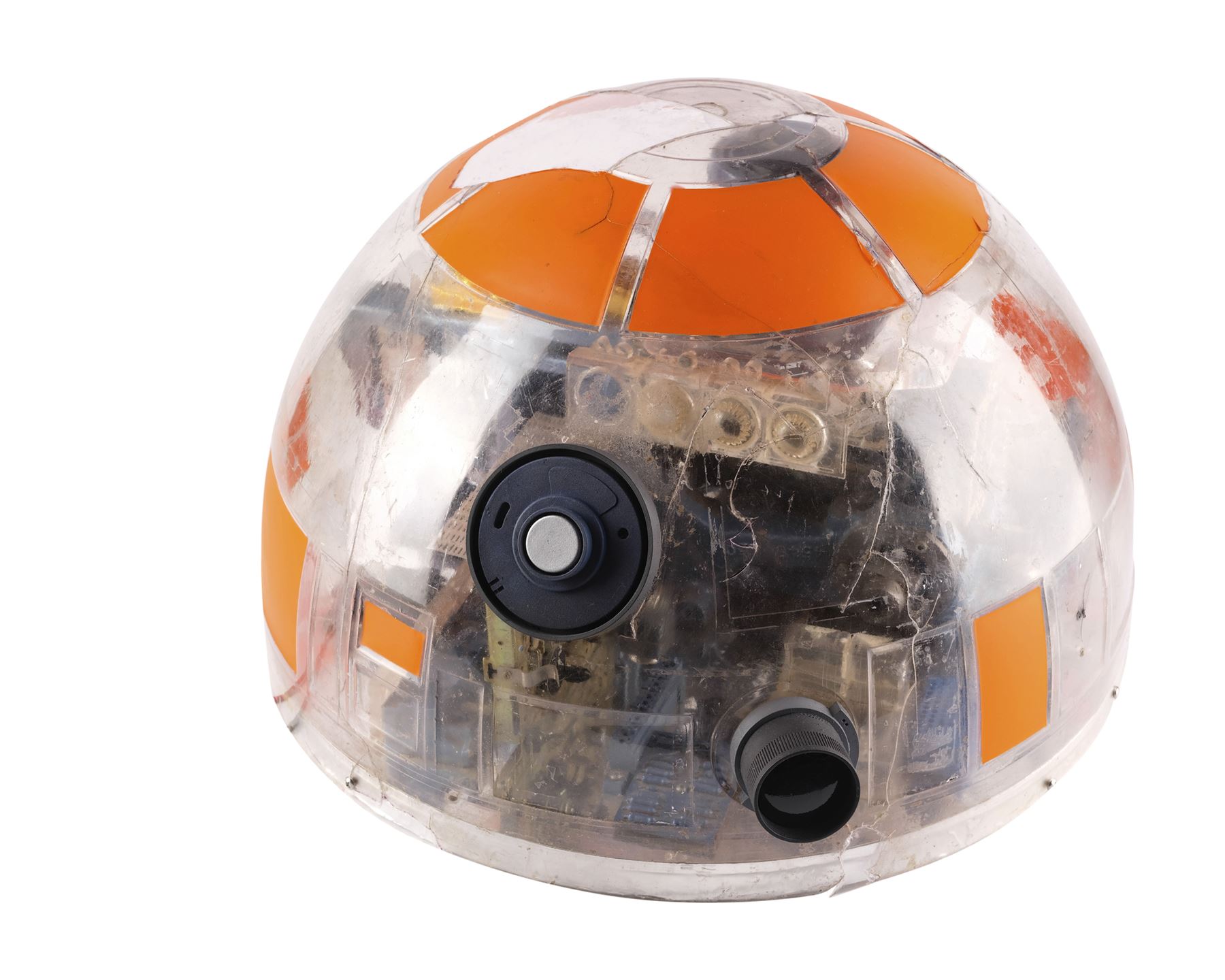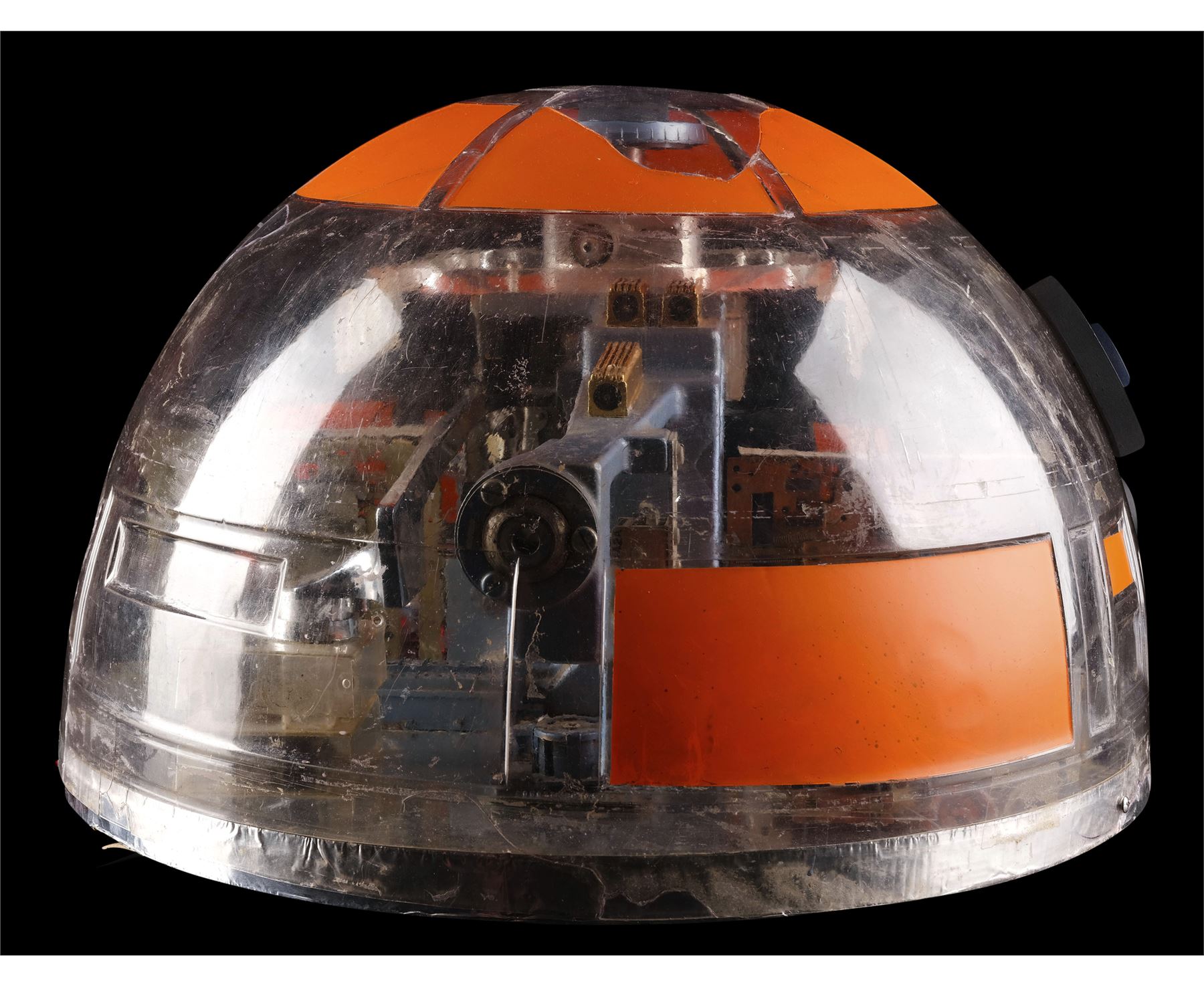 The mechanical interior of this droid head was assembled from real-world industrial scrap components, model kit parts, and other found objects - a technique used for prop building throughout the original Star Wars trilogy. It is cosmetic only and has no functionality. The dome was vacuum-formed from clear plastic with debossed panels. A small incandescent light was installed in the interior of the head, and the exterior dome was dressed with greeblies and several of the debossed panels were painted orange.
