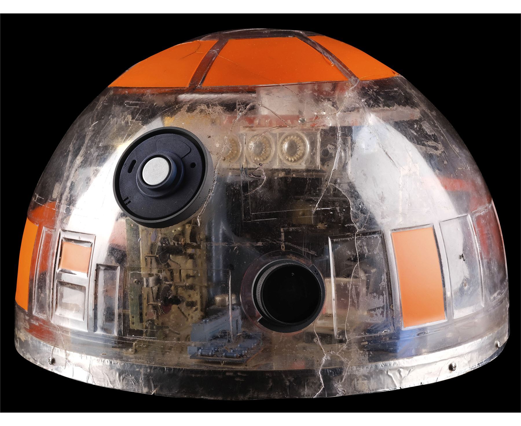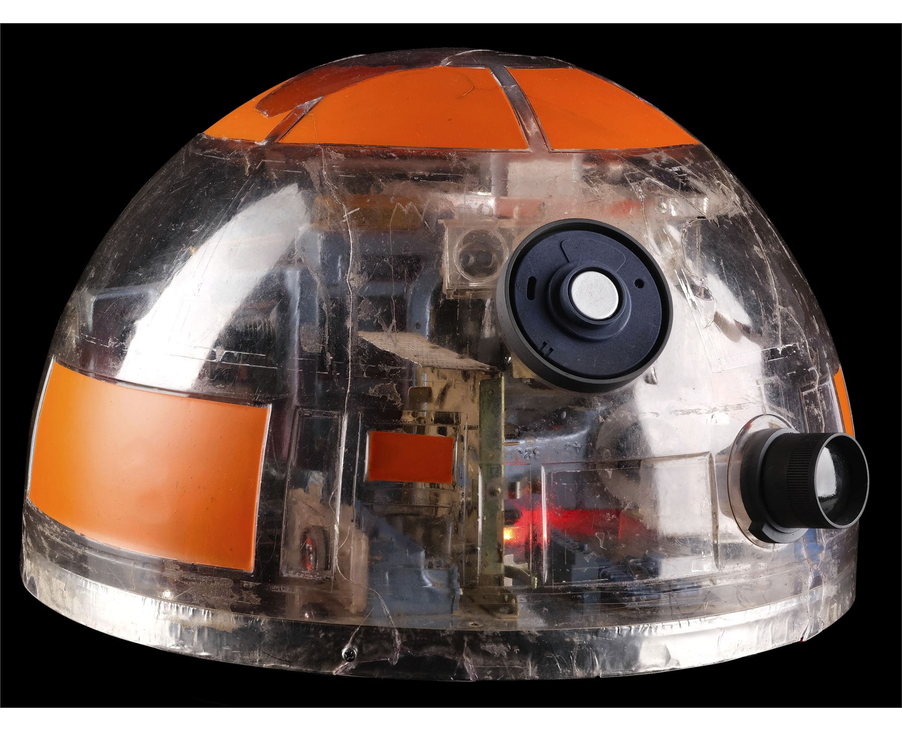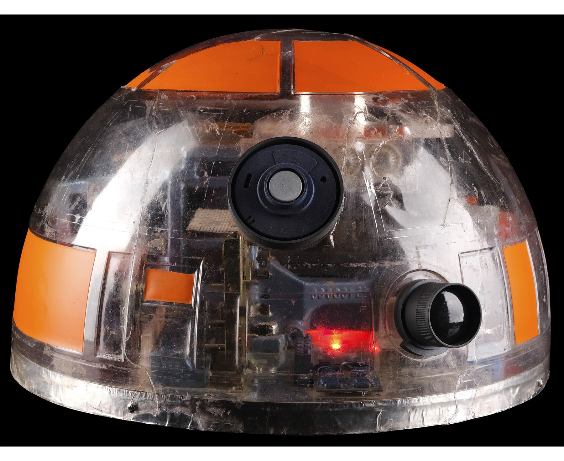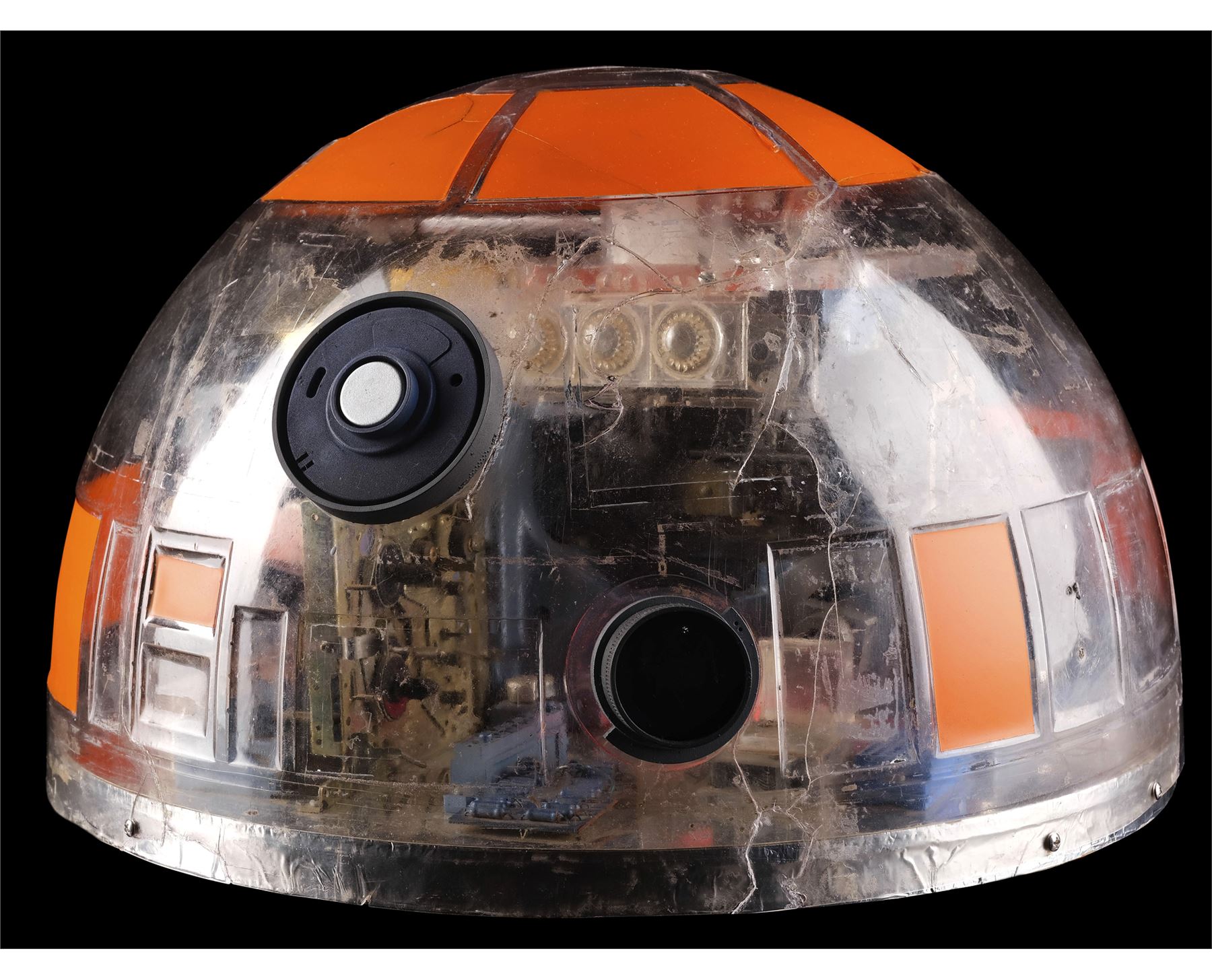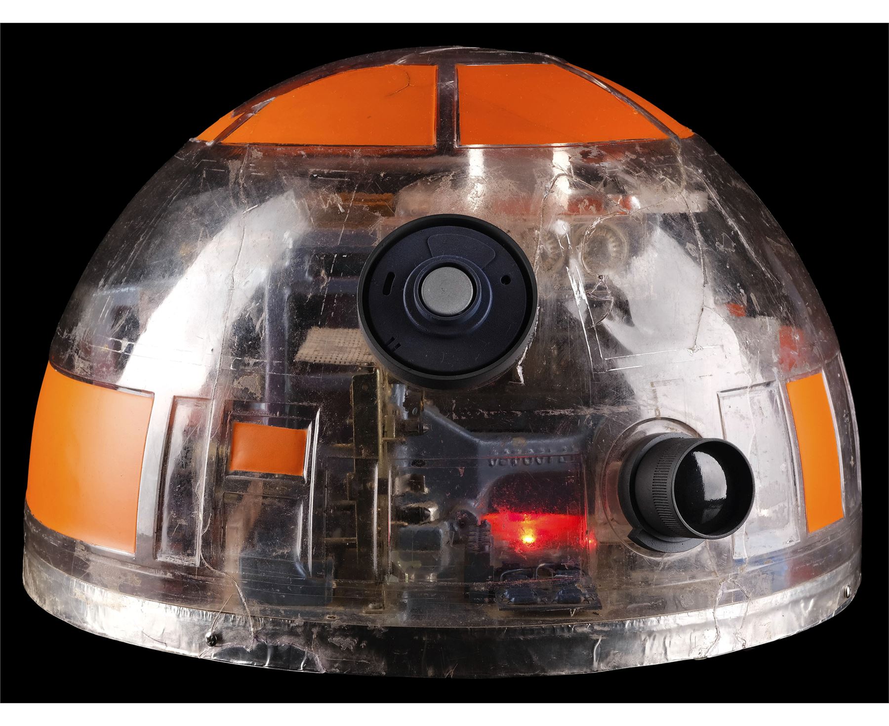 The mechanical interior of this droid head was assembled from real-world industrial scrap components, model kit parts, and other found objects - a technique used for prop building throughout the original Star Wars trilogy. It is cosmetic only and has no functionality. The dome was vacuum-formed from clear plastic with debossed panels. A small incandescent light was installed in the interior of the head, and the exterior dome was dressed with greeblies and several of the debossed panels were painted orange.