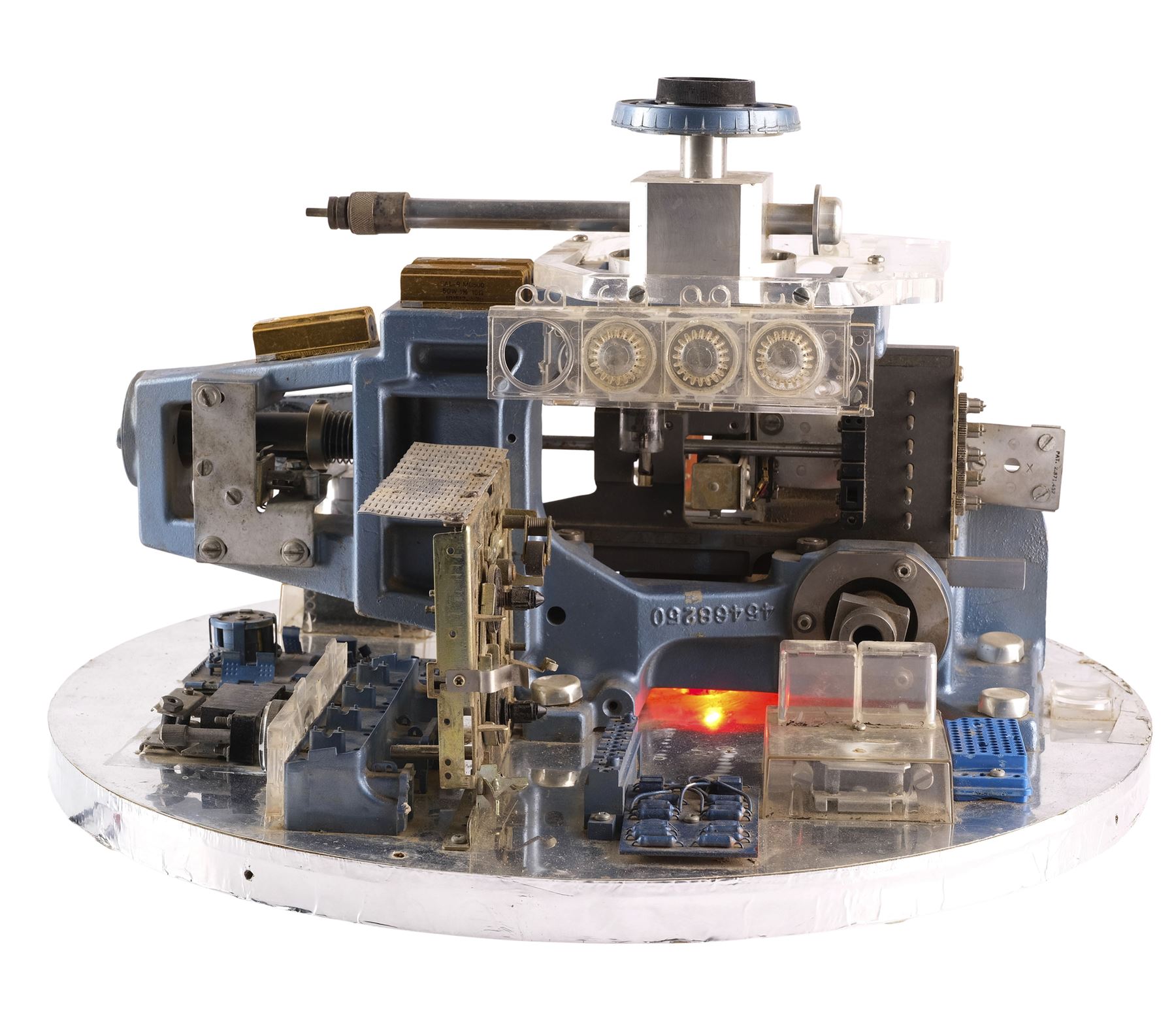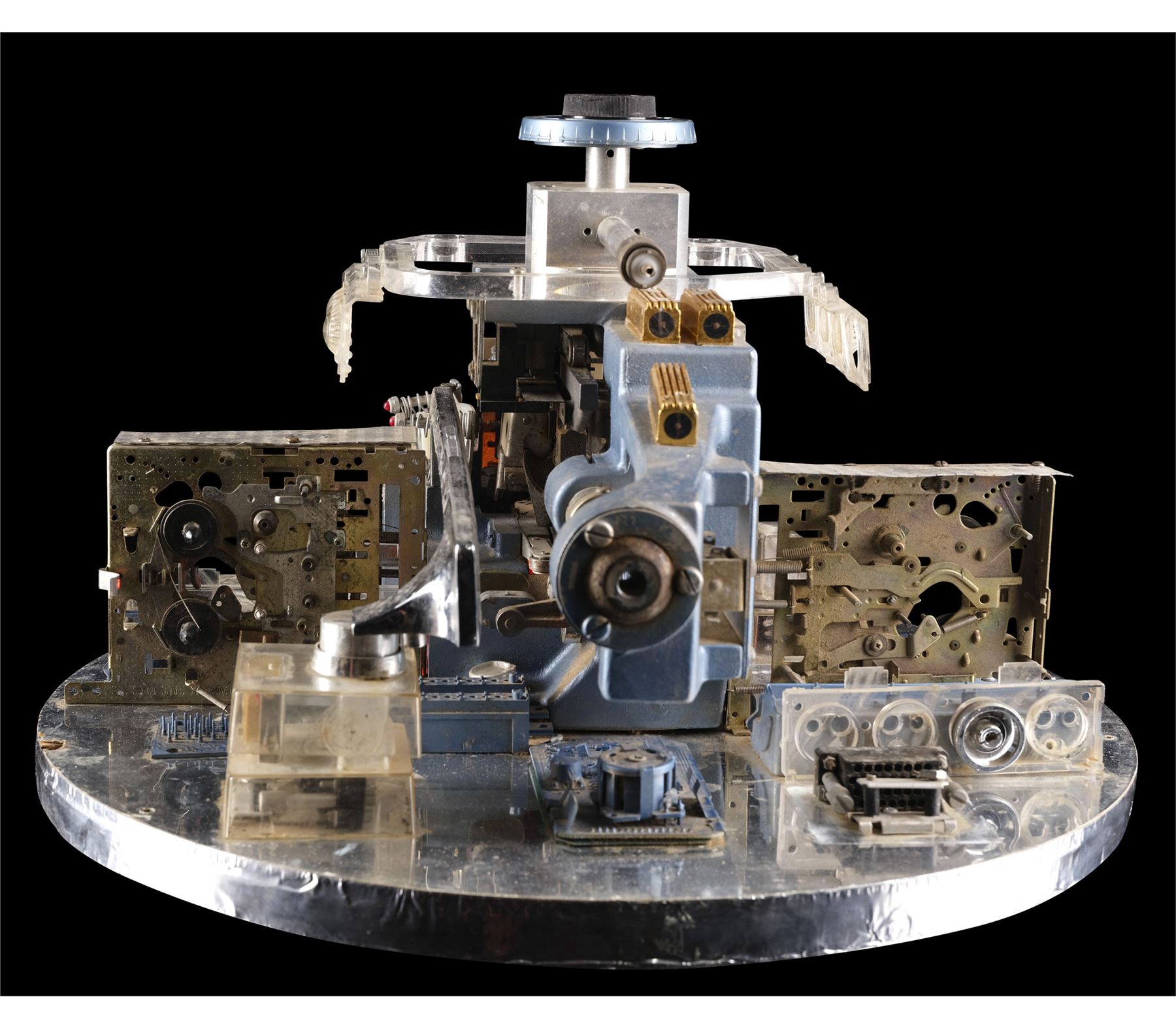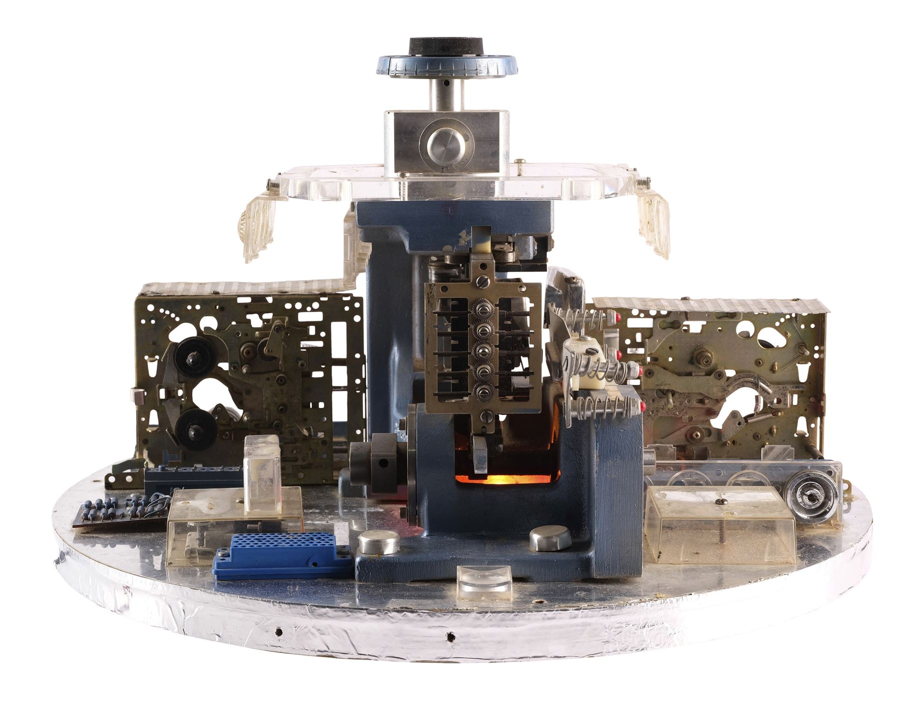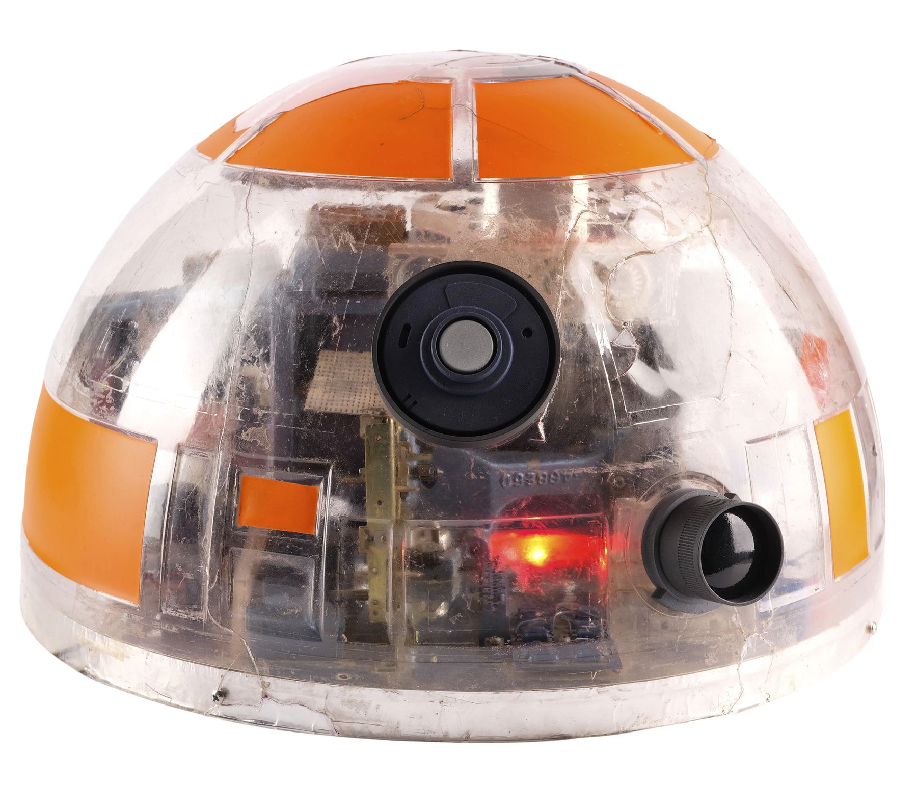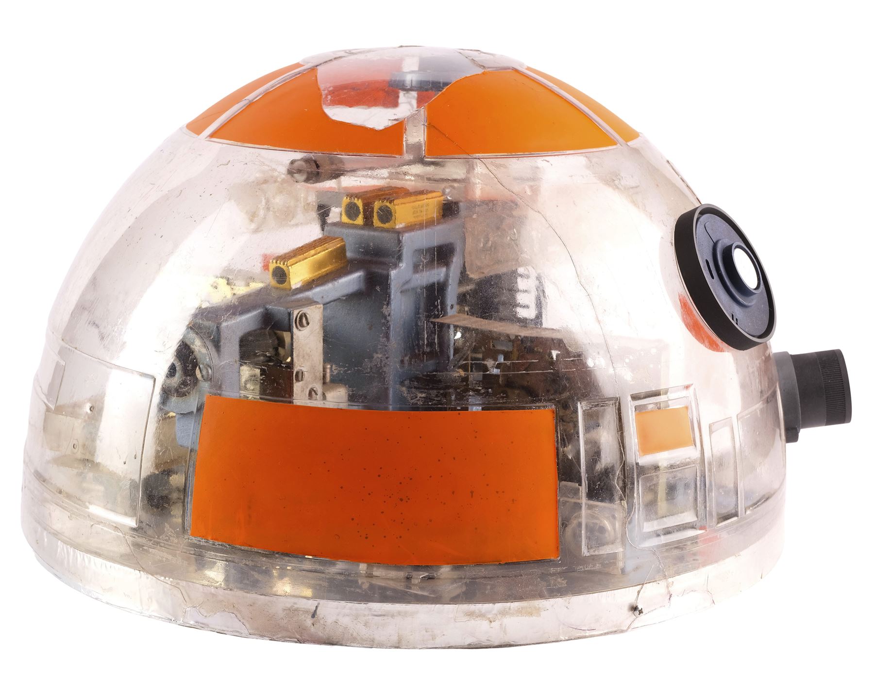 The mechanical interior of this droid head was assembled from real-world industrial scrap components, model kit parts, and other found objects - a technique used for prop building throughout the original Star Wars trilogy. It is cosmetic only and has no functionality. The dome was vacuum-formed from clear plastic with debossed panels. A small incandescent light was installed in the interior of the head, and the exterior dome was dressed with greeblies and several of the debossed panels were painted orange.