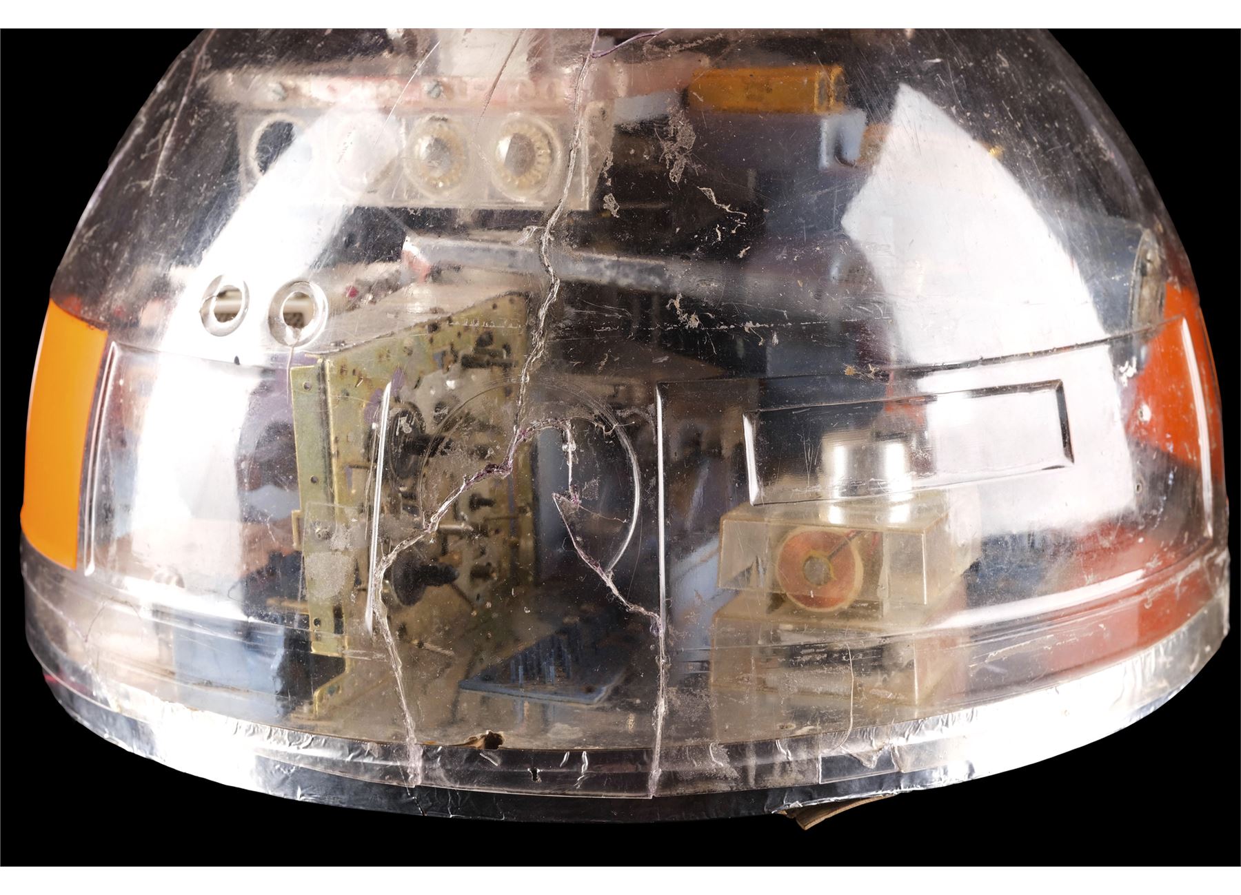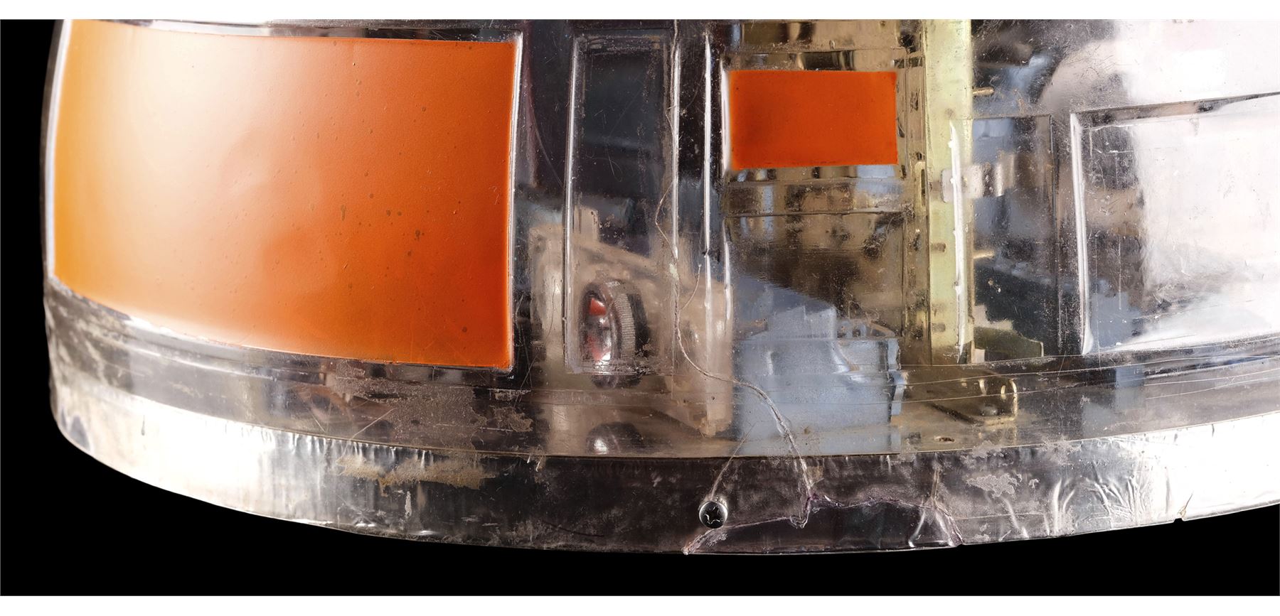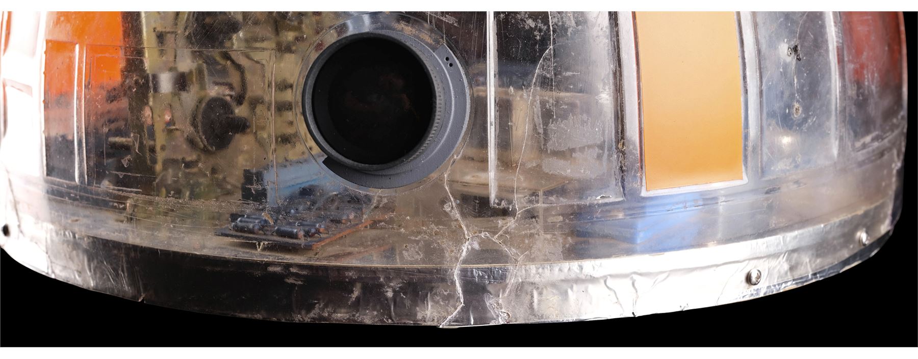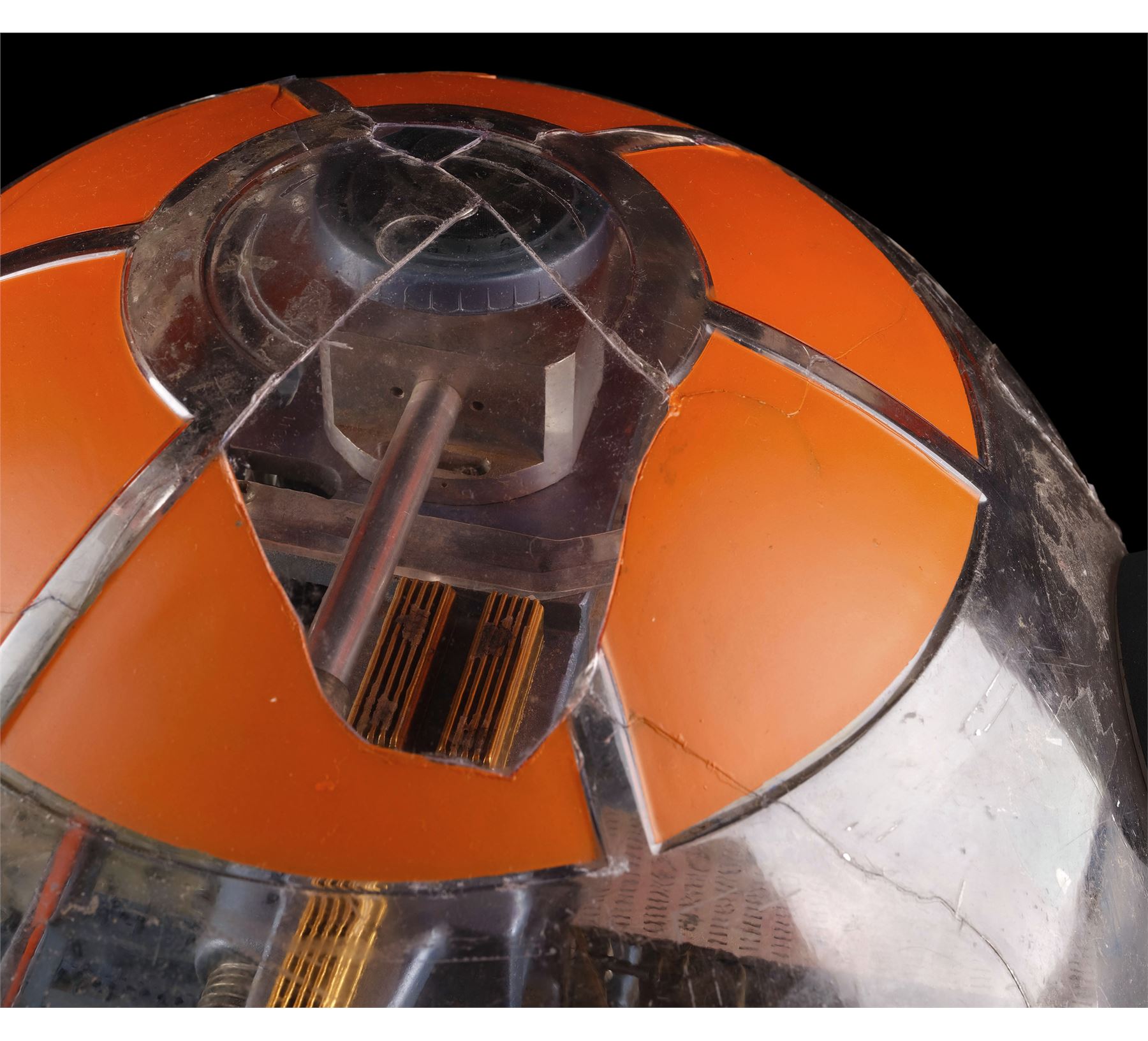 The translucent dome of this droid head was damaged after production and a few sections of the original hemisphere were lost. The original dome has been restored by installing it over a newly-made clear dome that supports the remaining original structure; this inner-support dome is smooth and does not have the debossed panels of the original, allowing observers to identify which elements are original.