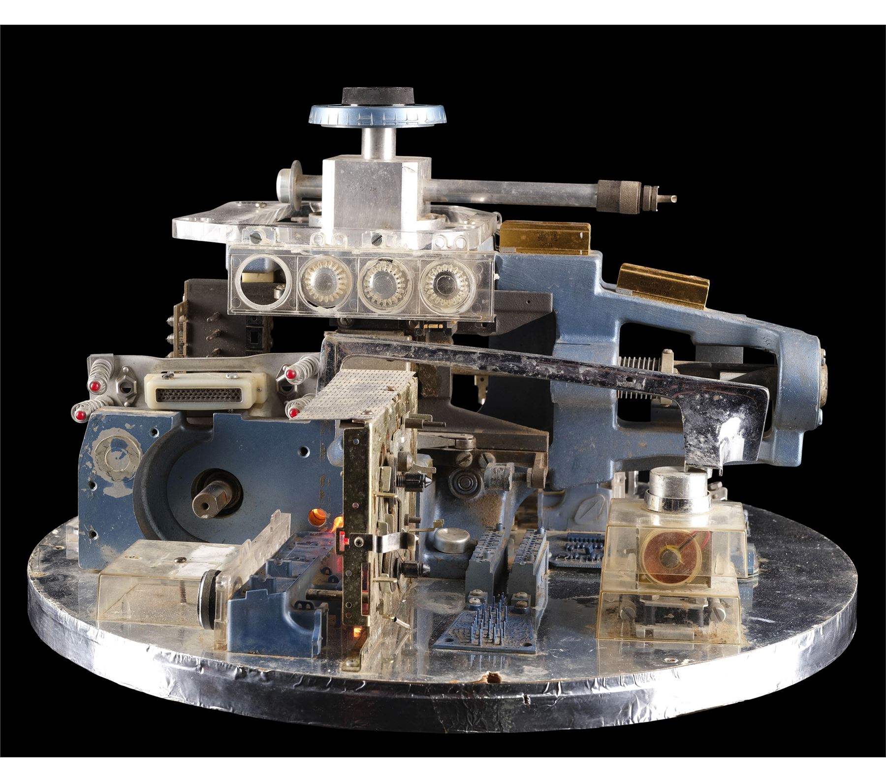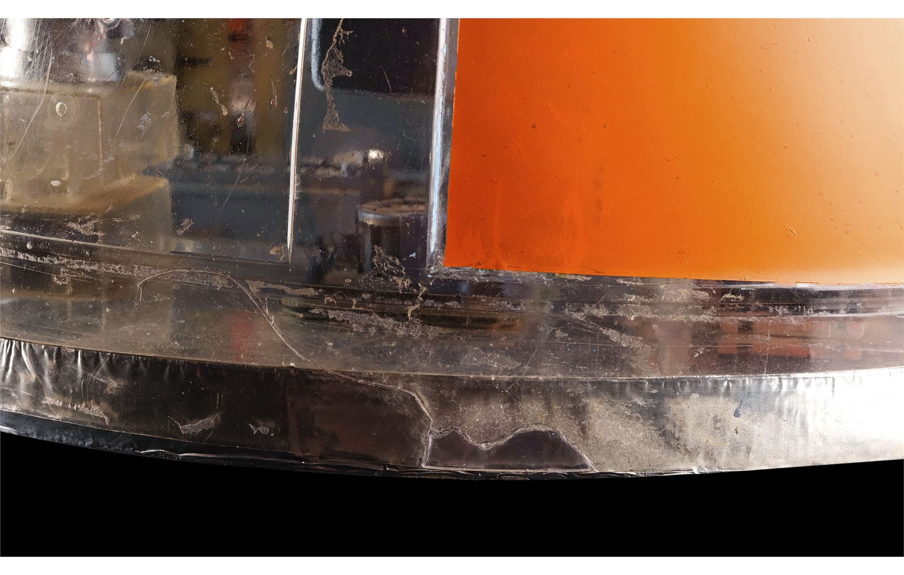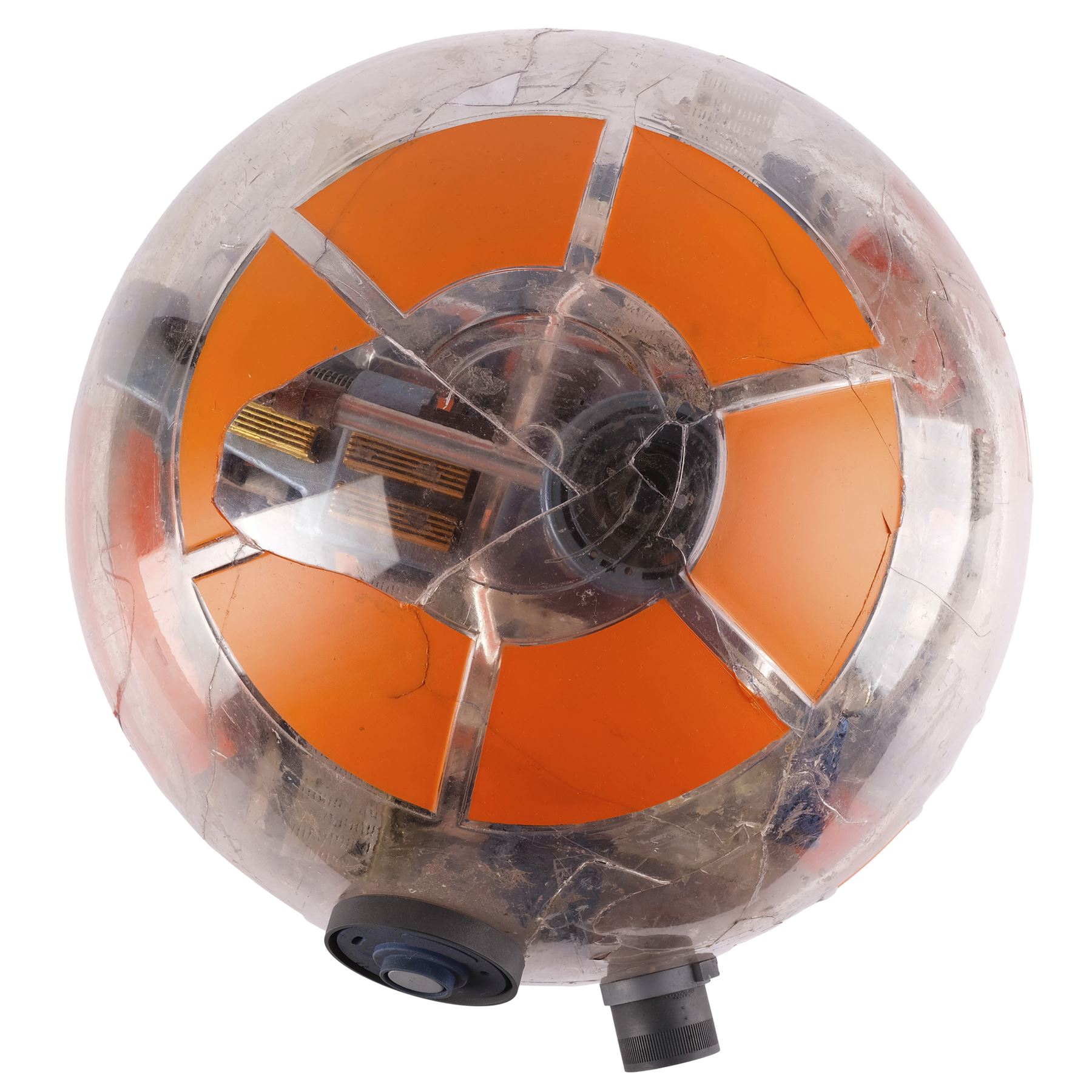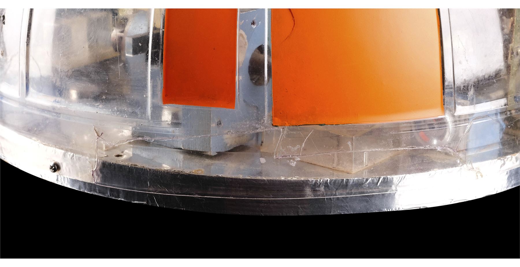 The translucent dome of this droid head was damaged after production and a few sections of the original hemisphere were lost. The original dome has been restored by installing it over a newly-made clear dome that supports the remaining original structure; this inner-support dome is smooth and does not have the debossed panels of the original, allowing observers to identify which elements are original.