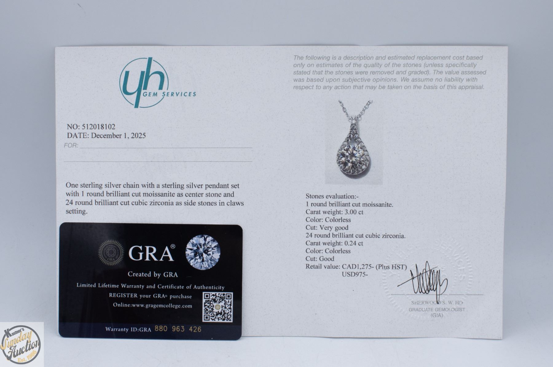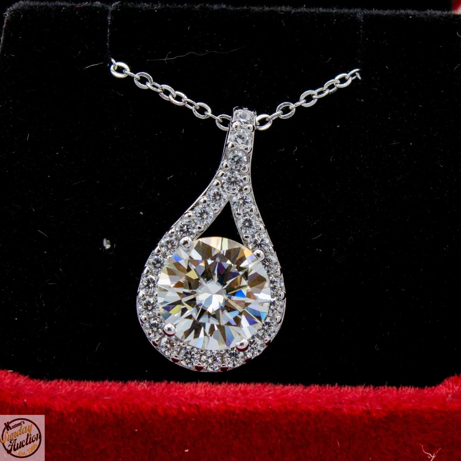 CUT MOISSANITE STONE VVS D COLOR WITH 24 ROUND BRILLIANT CUT CUBIC ZIRCONIA SET IN TEAR DROP HALO SET IN 925 SILVER PENDANT RETAIL VALUE $1,275.00 **ALL ITEMS MUST BE REMOVED BY 5PM SATURDAY, APRIL 4TH 2026. ALL REMAINING ITEMS WILL BE SUBJECT TO A $6.00 PER DAY STORAGE CHARGE. ANY ITEMS REMAINING AFTER MONDAY, APRIL 27TH 2026 WILL BE CONSIDERED FORFEITED. NO REFUNDS WILL BE ISSUED FOR FORFEITED ITEMS. TO SCHEDULE A PICK UP APPOINTMENT CLICK HERE