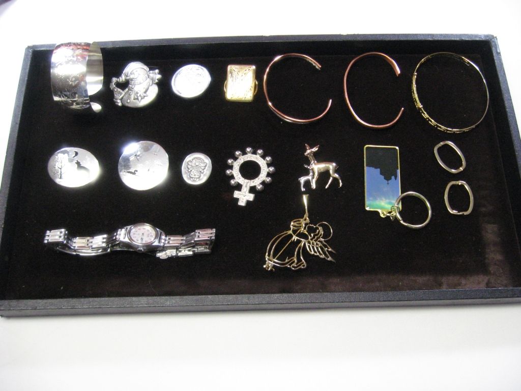 4078 - Assortment: brooches, bracelets, bangle, key chain, etc.chain, etc.