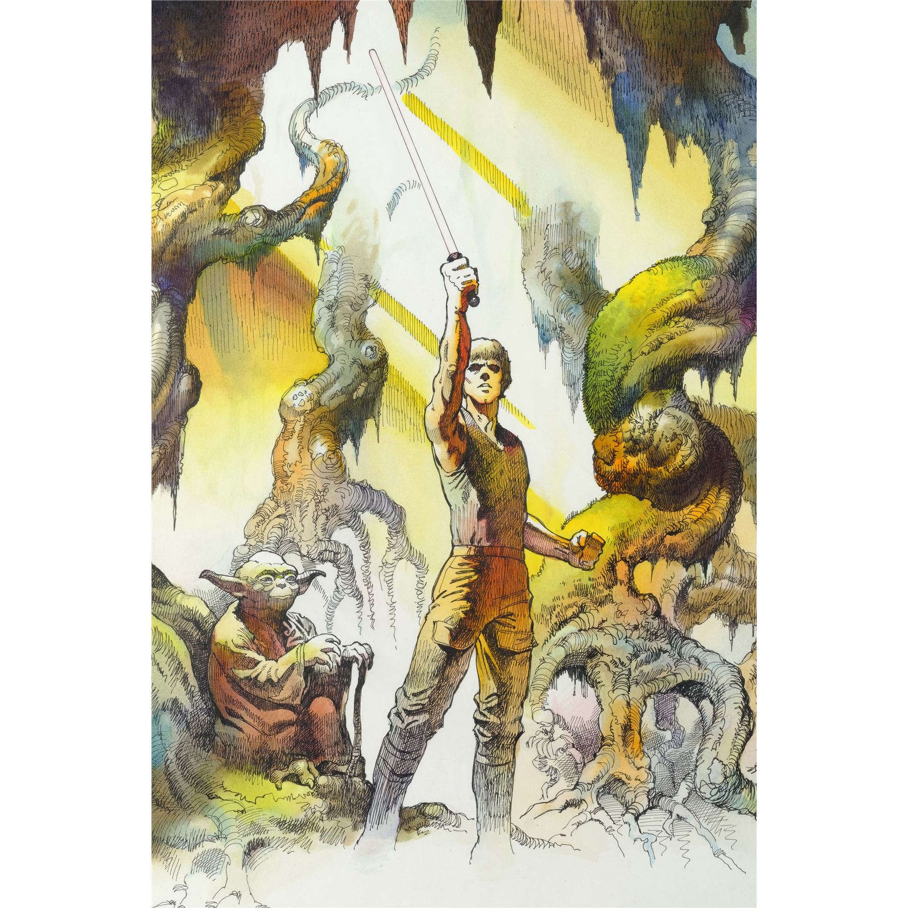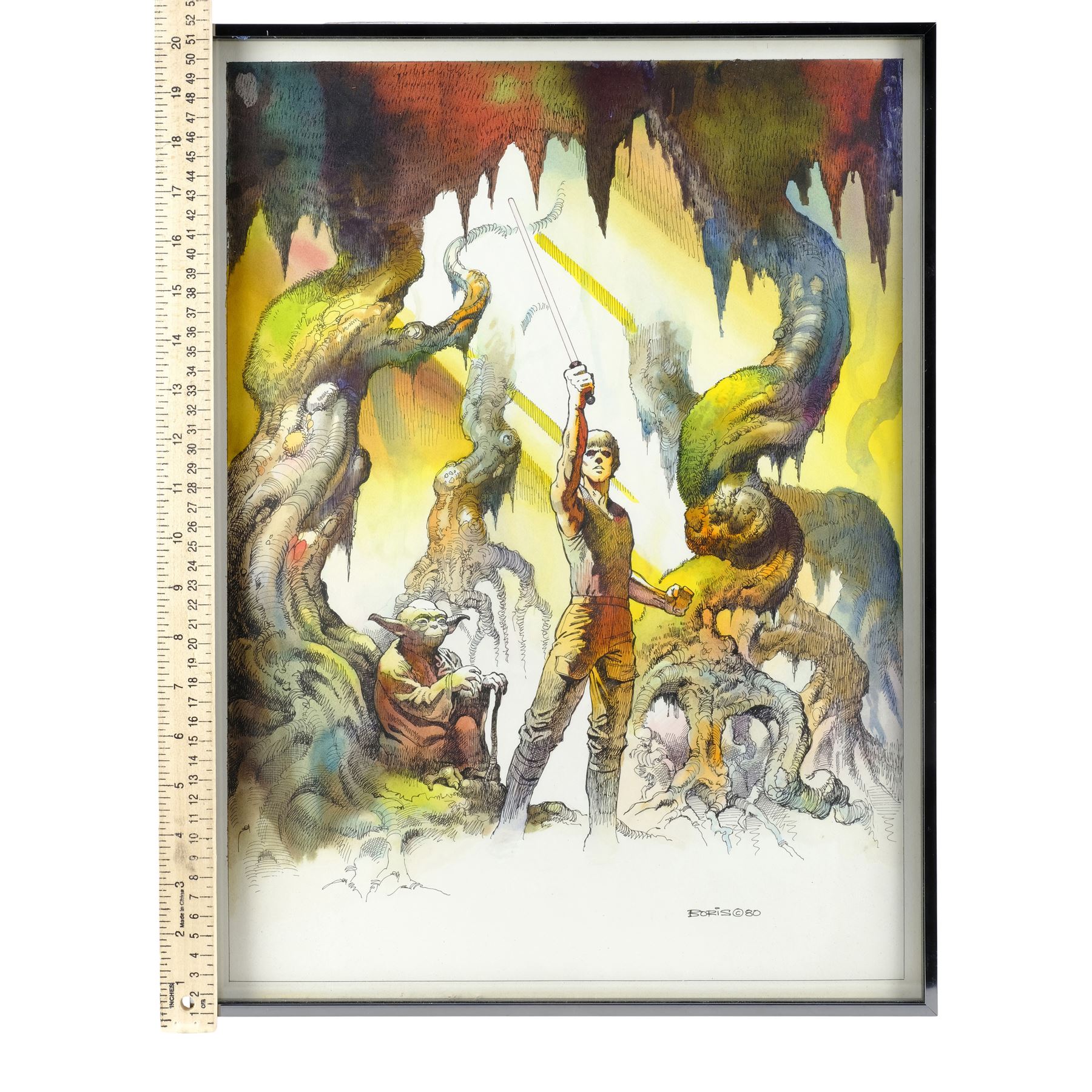STAR WARS: THE EMPIRE STRIKES BACK (1980) - William Plumb Collection: Framed Hand-Drawn Boris Vallejo Luke and Yoda on Dagobah Poster Comp - A poster comp featuring Luke Skywalker training with Yoda on Dagobah as seen in Irvin Kershner's Star Wars: The Empire Strikes Back hand-drawn by fantasy artist Boris Vallejo. In 1980, Vallejo was commissioned by Coca-Cola and 20th Century Fox to illustrate four posters that tied in with the commercial release of Empire Strikes Back and then were given to customers if they purchased Coca-Cola products.
