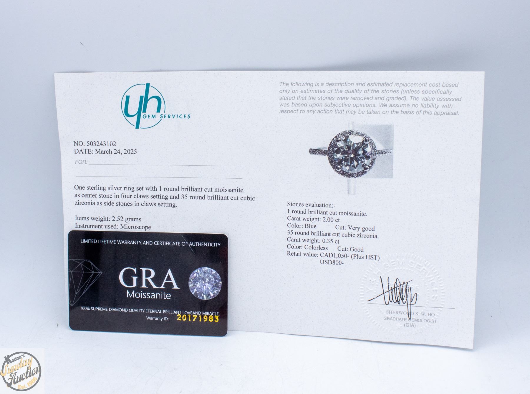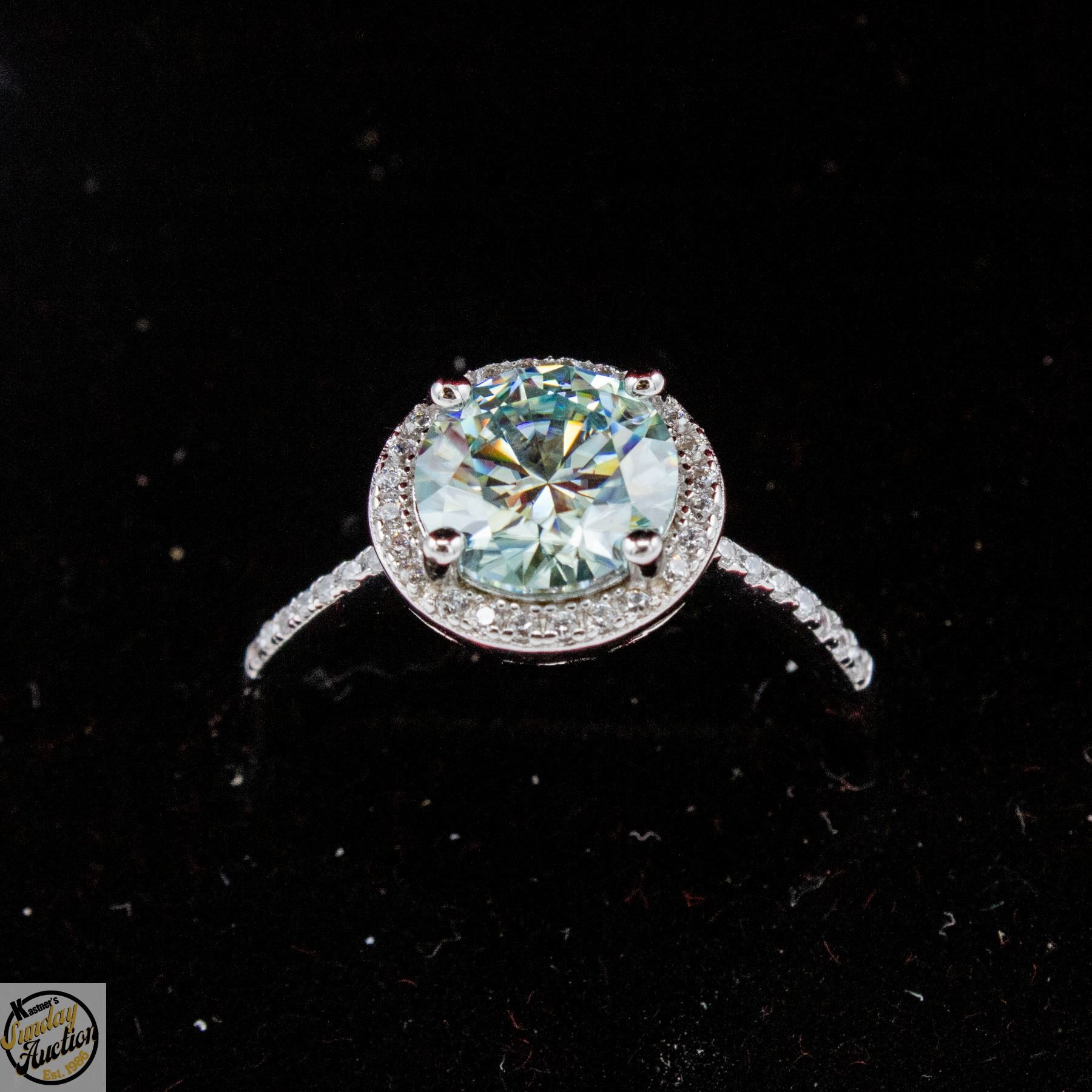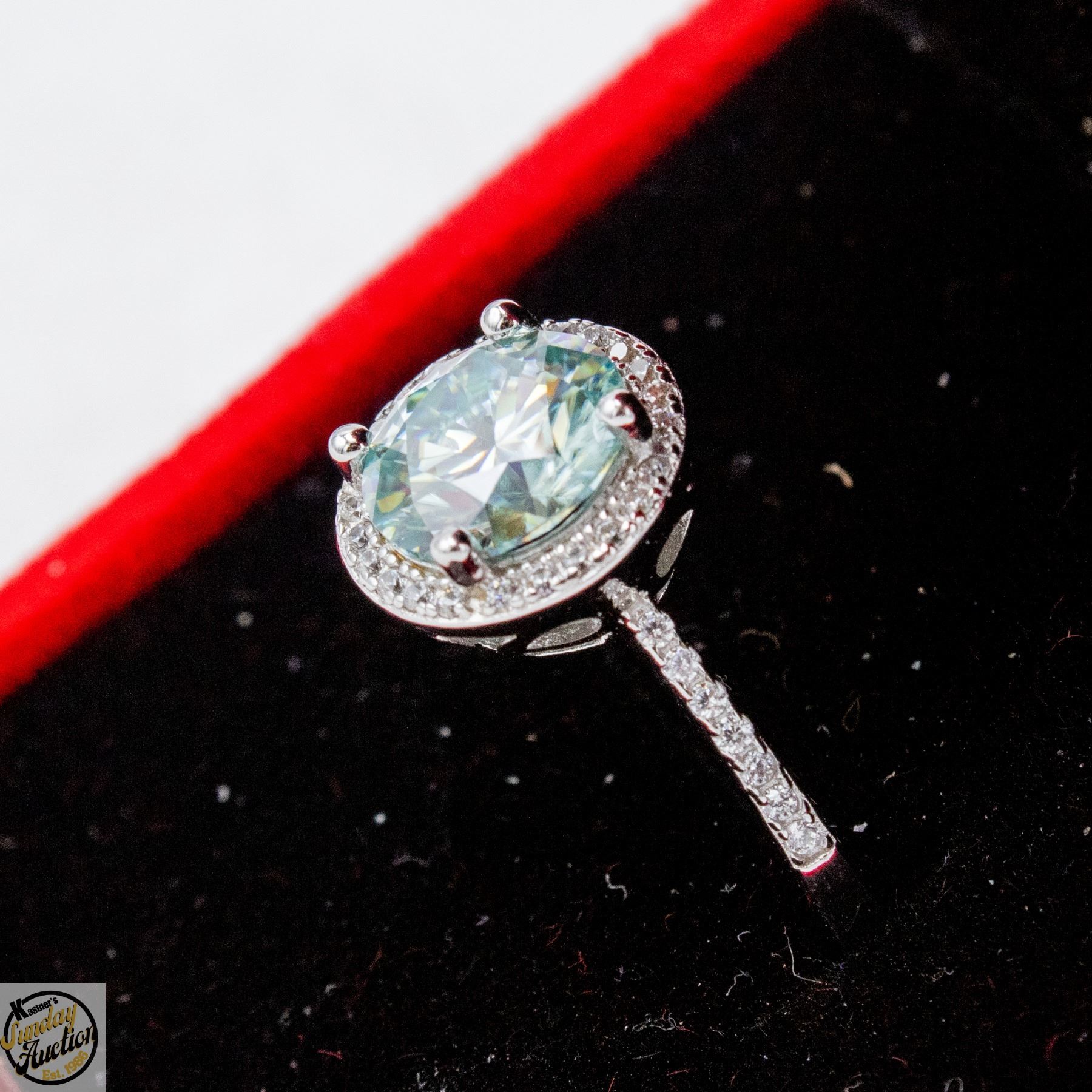 MOISSANITE STONE VVS BLUE COLOR WITH 35 ROUND BRILLIANT CUT CUBIC ZIRCONIA SET IN ROUND HALO AND IN SHANKS SET IN 925 SILVER RING SIZE ADJUSTABLE RETAIL VALUE $1,050.00 **ALL ITEMS MUST BE REMOVED BY 5PM SATURDAY, APRIL 11TH 2026. ALL REMAINING ITEMS WILL BE SUBJECT TO A $6.00 PER DAY STORAGE CHARGE. ANY ITEMS REMAINING AFTER MONDAY, APRIL 27TH 2026 WILL BE CONSIDERED FORFEITED. NO REFUNDS WILL BE ISSUED FOR FORFEITED ITEMS. TO SCHEDULE A PICK UP APPOINTMENT CLICK HERE