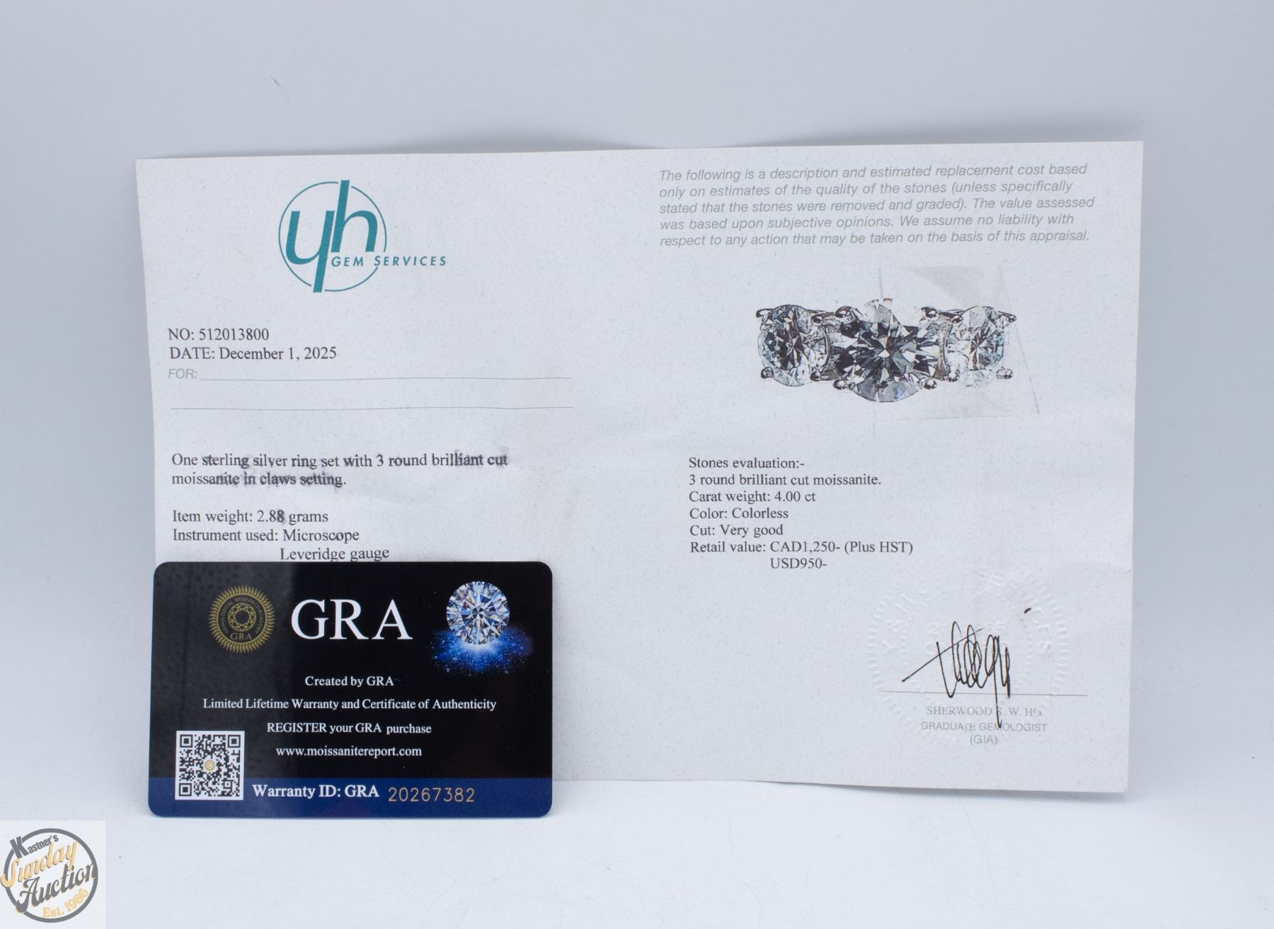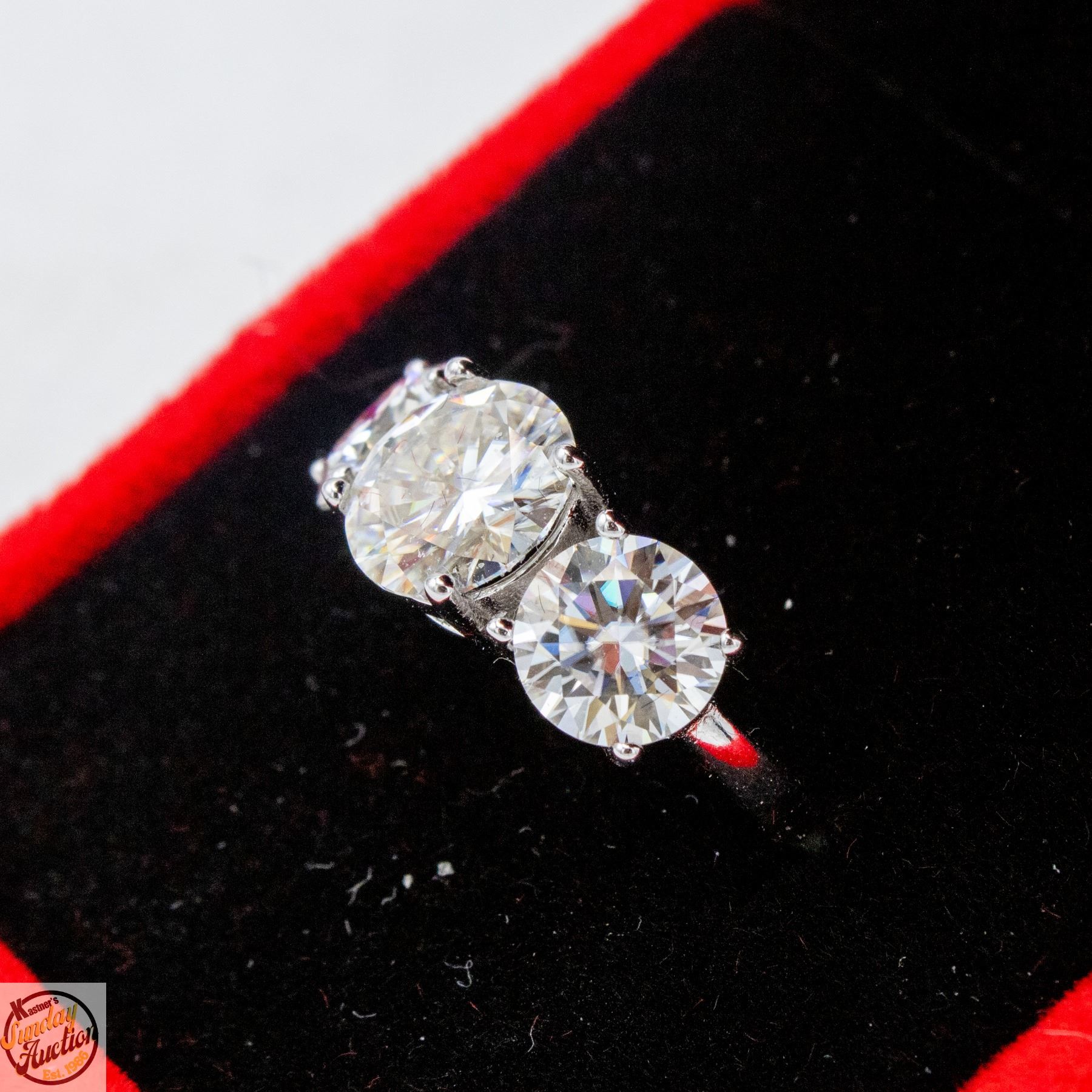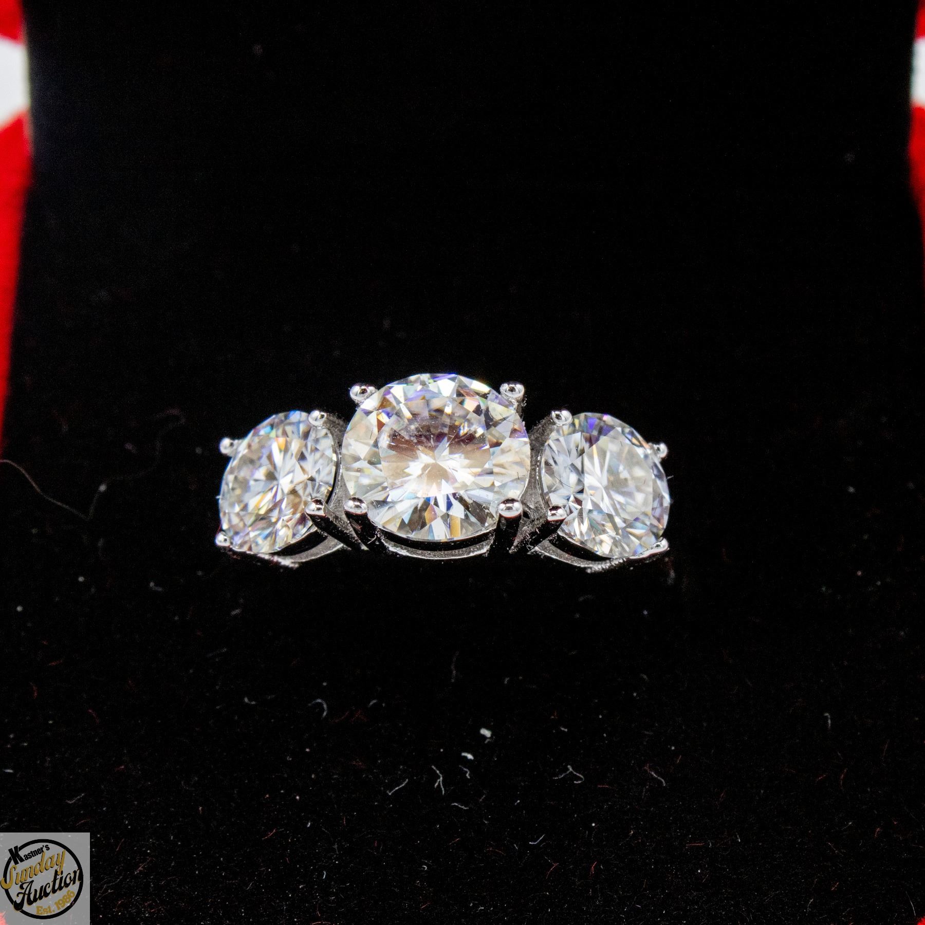 MOISSANITE STONES VVS D COLOR WITH 2.00 CT CENTER WITH 1.00 CT SET ON EITHER SIDE SET IN 925 SILVER RING SIZE 7 RETAIL VALUE $1,250.00 **ALL ITEMS MUST BE REMOVED BY 5PM SATURDAY, APRIL 11TH 2026. ALL REMAINING ITEMS WILL BE SUBJECT TO A $6.00 PER DAY STORAGE CHARGE. ANY ITEMS REMAINING AFTER MONDAY, APRIL 27TH 2026 WILL BE CONSIDERED FORFEITED. NO REFUNDS WILL BE ISSUED FOR FORFEITED ITEMS. TO SCHEDULE A PICK UP APPOINTMENT CLICK HERE