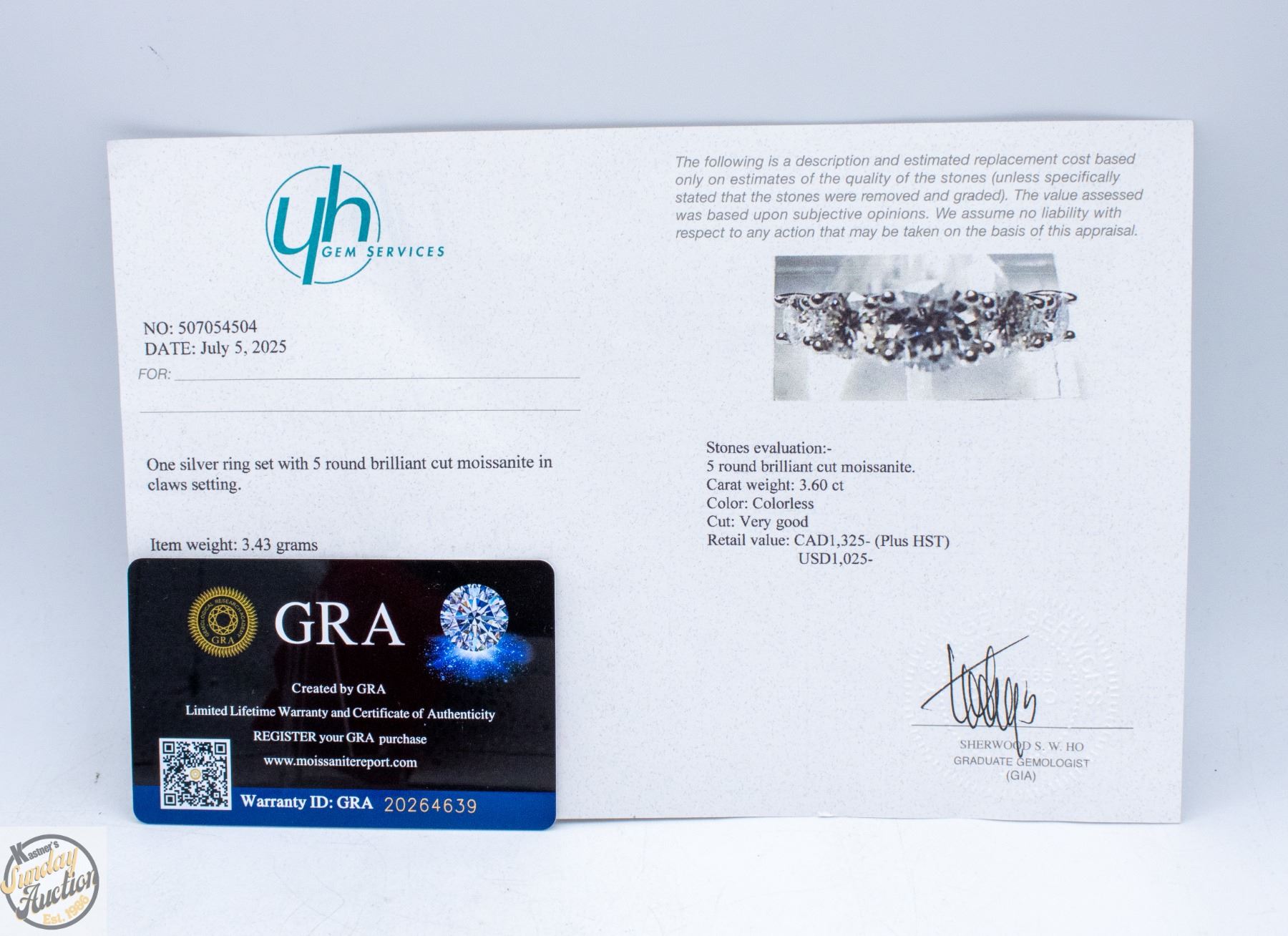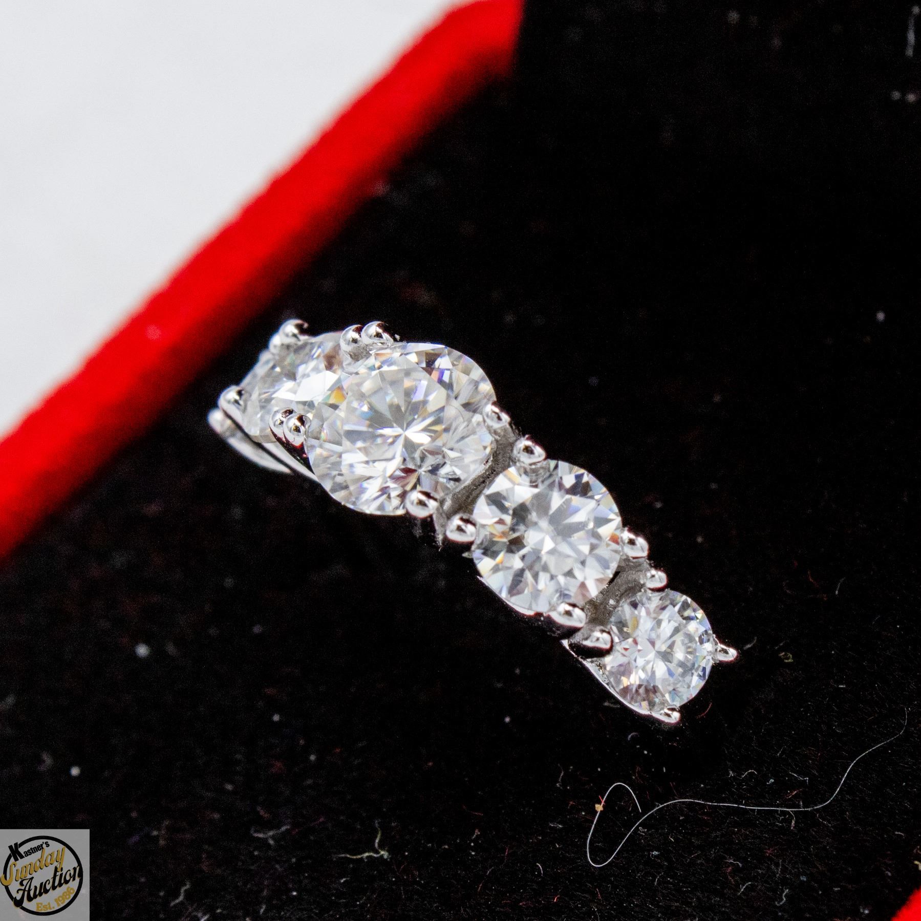 MOISSANITE STONE VVS D COLOR WITH THE 5 MOISSANITE STONES SET GRADUATING DOWN IN SIZE FROM CENTER SET IN 925 SILVER RING SIZE 6 RETAIL VALUE $1,325.00 **ALL ITEMS MUST BE REMOVED BY 5PM SATURDAY, APRIL 11TH 2026. ALL REMAINING ITEMS WILL BE SUBJECT TO A $6.00 PER DAY STORAGE CHARGE. ANY ITEMS REMAINING AFTER MONDAY, APRIL 27TH 2026 WILL BE CONSIDERED FORFEITED. NO REFUNDS WILL BE ISSUED FOR FORFEITED ITEMS. TO SCHEDULE A PICK UP APPOINTMENT CLICK HERE