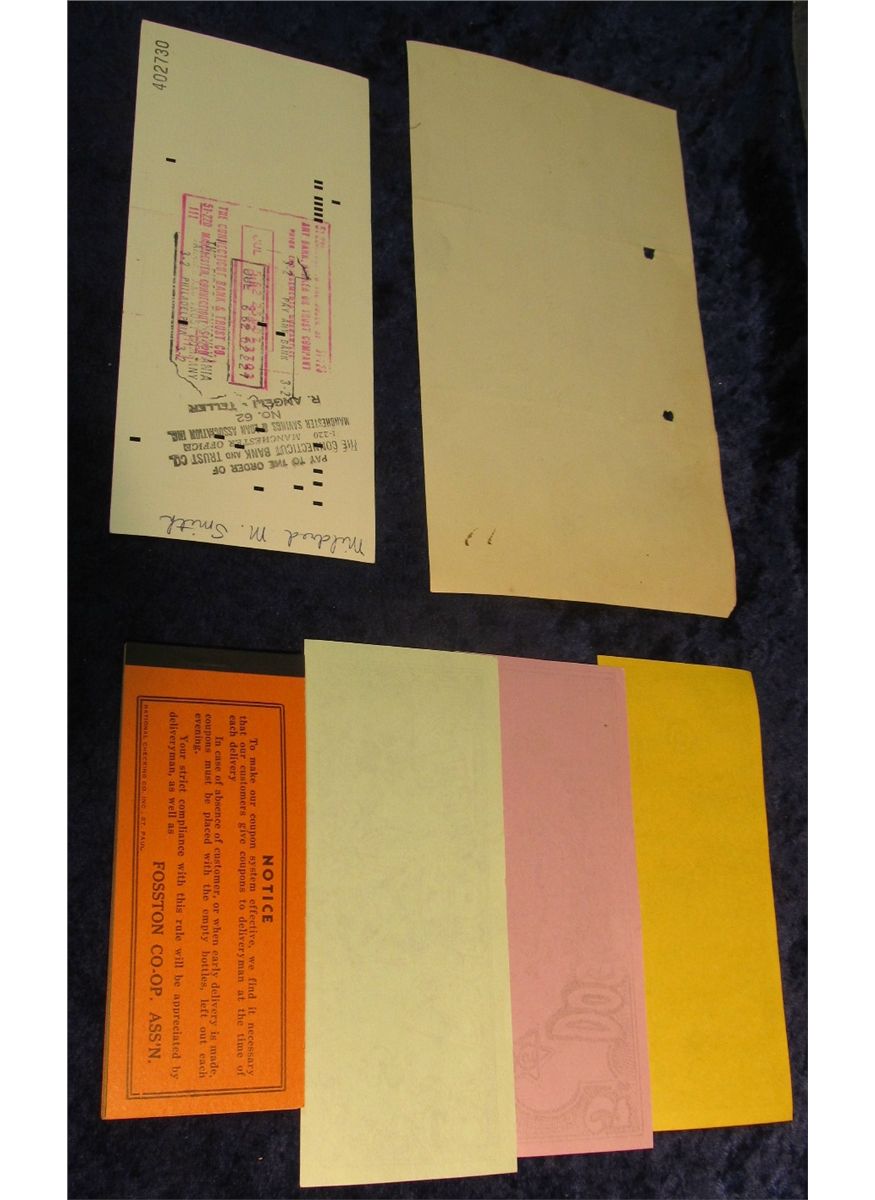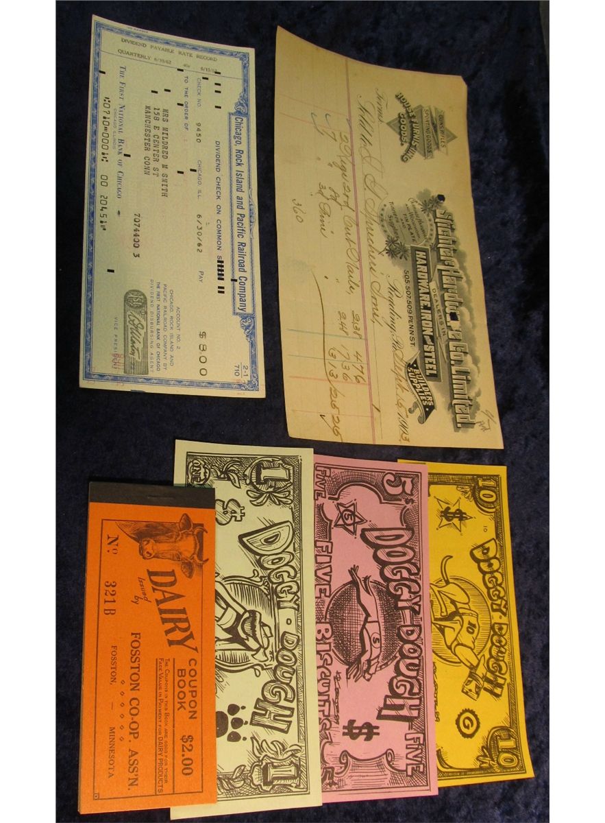 409. 1930 Era Fosston Co-op Dairy Coupon Book, Mint condition; Doggy Dough Note Set; cancelled check from Chicago, Rock Island and Pacific Railroad Co.; & a 1903 Invoice from Stichter Hardware Co.