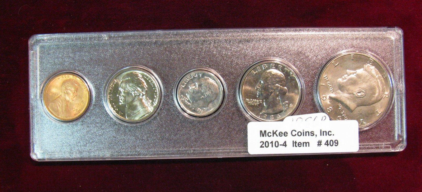 409. 1986 P 5-Piece Year Set in a Snap-tight holder. Cent to Half Dollar. Gem BU.