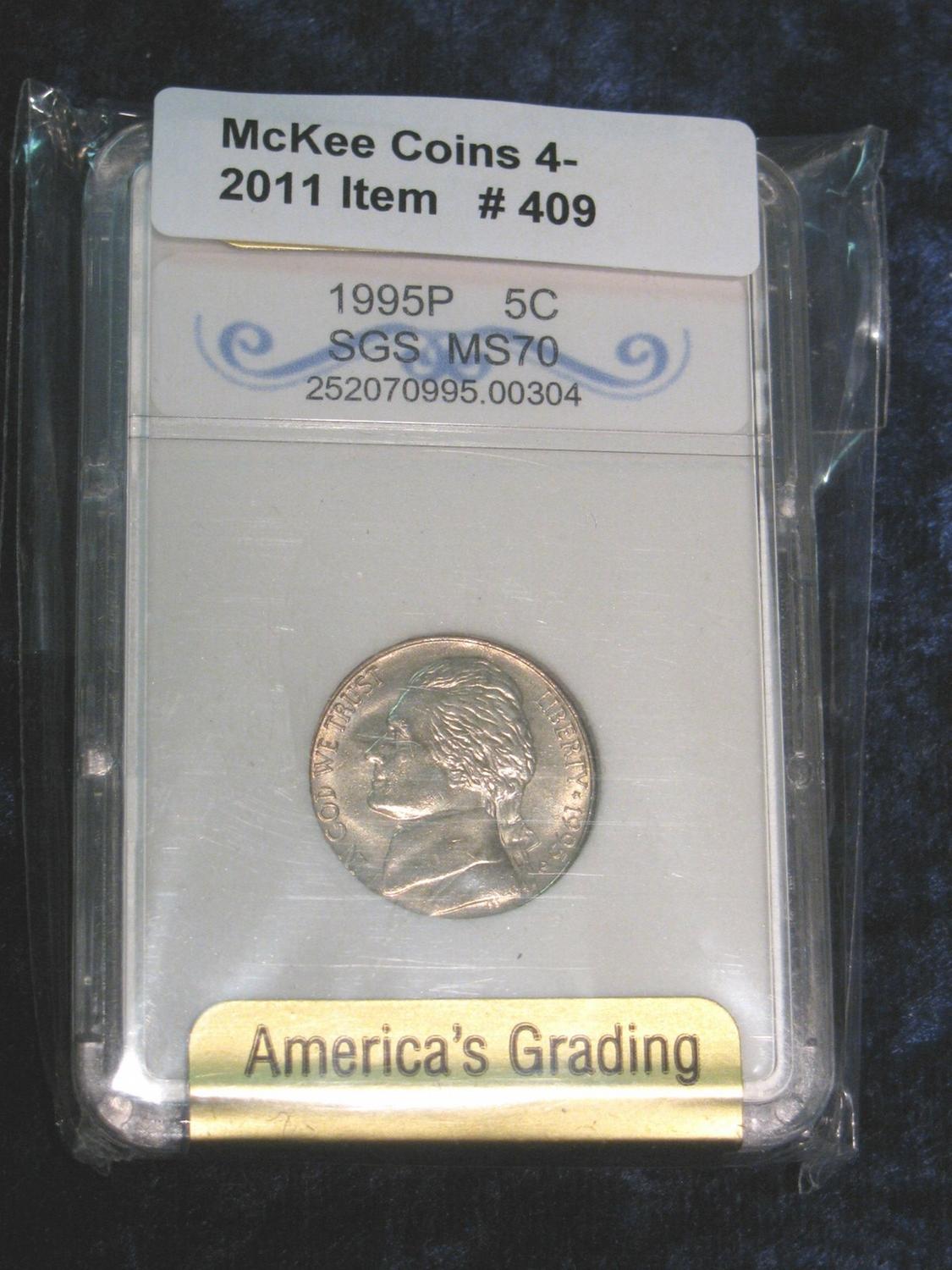 409. 1995 P Jefferson Nickel SGS MS 70 Slabbed.