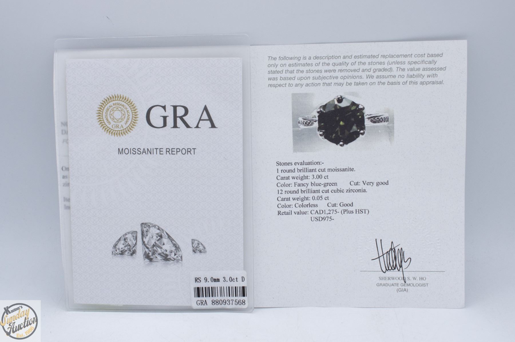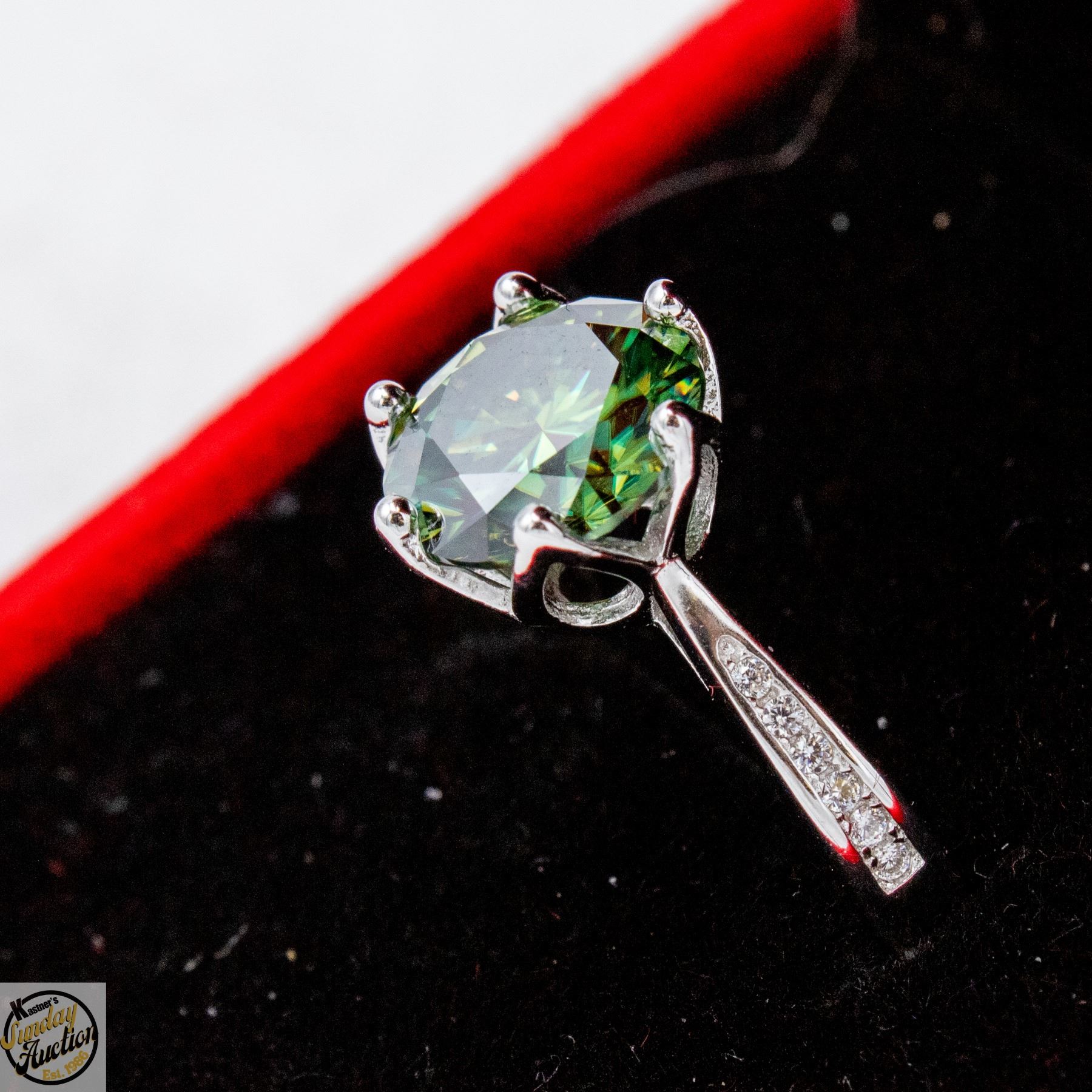 MOISSANITE STONE VVS FANCY BLUE-GREEN COLOR WITH 12 ROUND BRILLIANT CUT CUBIC ZIRCONIA SET IN SHANKS SET IN 925 SILVER RING SIZE 6 RETAIL VALUE $1,275.00 **ALL ITEMS MUST BE REMOVED BY 5PM SATURDAY, APRIL 11TH 2026. ALL REMAINING ITEMS WILL BE SUBJECT TO A $6.00 PER DAY STORAGE CHARGE. ANY ITEMS REMAINING AFTER MONDAY, APRIL 27TH 2026 WILL BE CONSIDERED FORFEITED. NO REFUNDS WILL BE ISSUED FOR FORFEITED ITEMS. TO SCHEDULE A PICK UP APPOINTMENT CLICK HERE