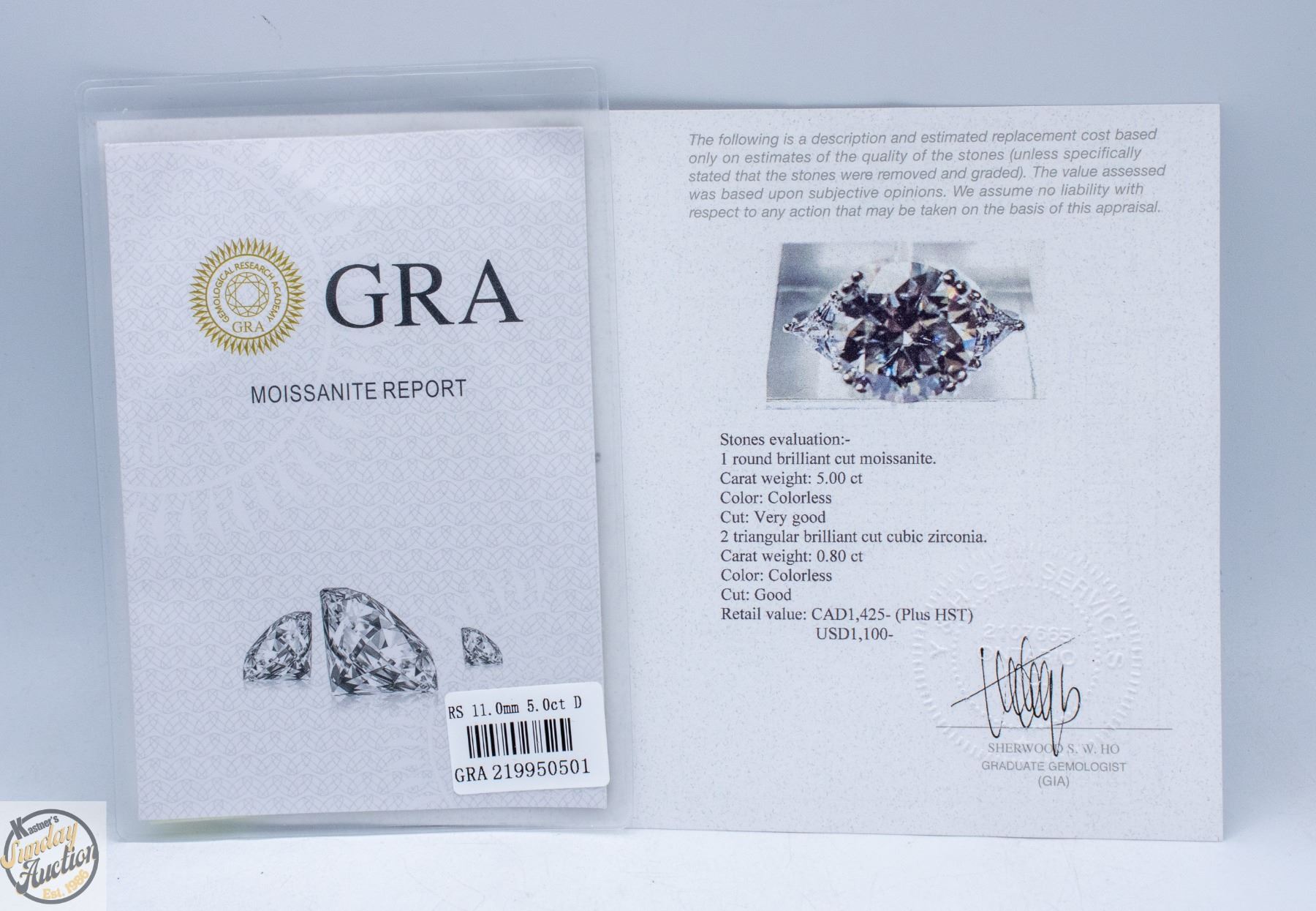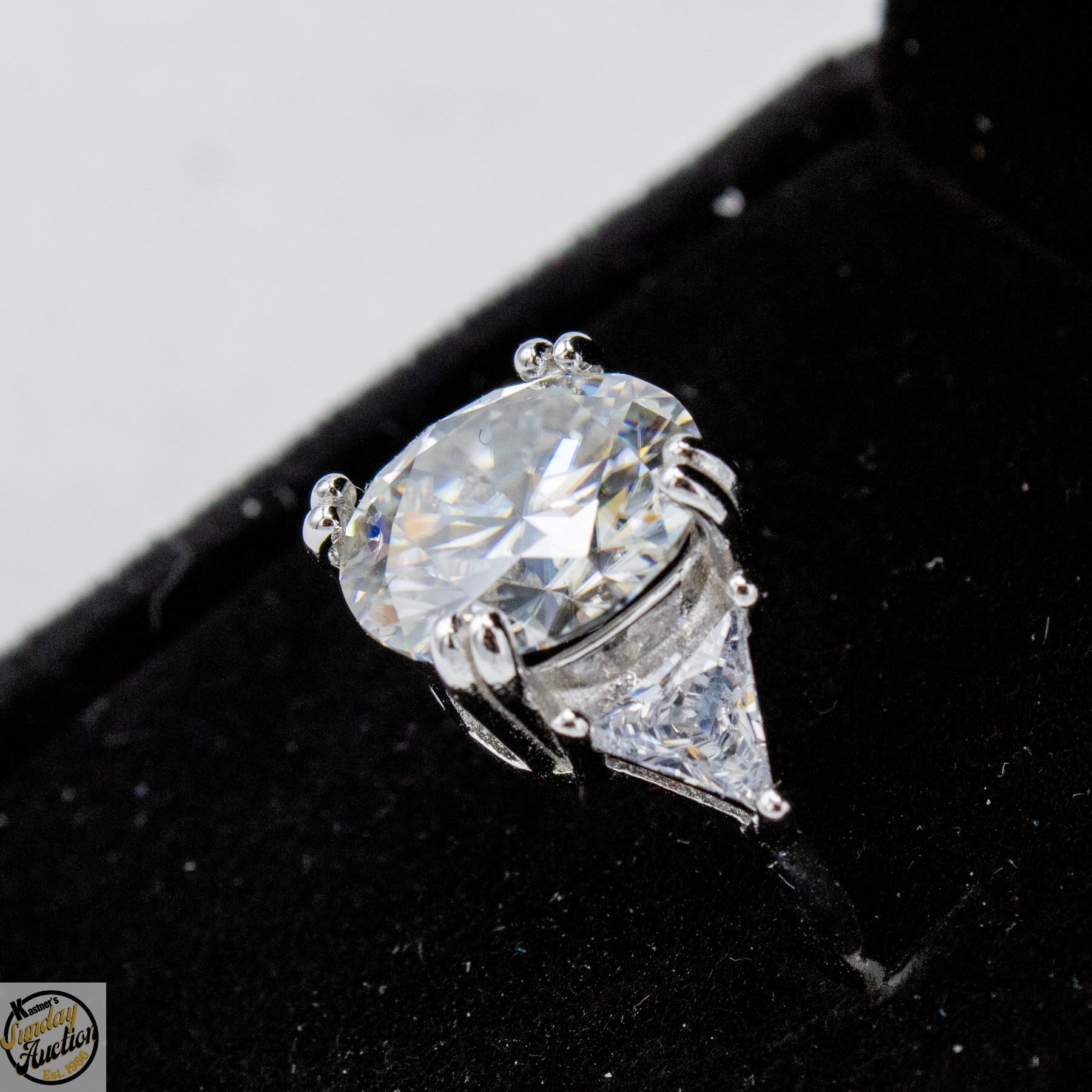 MOISSANITE STONE VVS D COLOR SET IN CENTER WITH TRIANGULAR BRILLIANT CUT CUBIC ZIRCONIA SET ON EITHER SIDE SET IN 925 SILVER RING SIZE 5 RETAIL VALUE $1,425.00 **ALL ITEMS MUST BE REMOVED BY 5PM SATURDAY, APRIL 11TH 2026. ALL REMAINING ITEMS WILL BE SUBJECT TO A $6.00 PER DAY STORAGE CHARGE. ANY ITEMS REMAINING AFTER MONDAY, APRIL 27TH 2026 WILL BE CONSIDERED FORFEITED. NO REFUNDS WILL BE ISSUED FOR FORFEITED ITEMS. TO SCHEDULE A PICK UP APPOINTMENT CLICK HERE