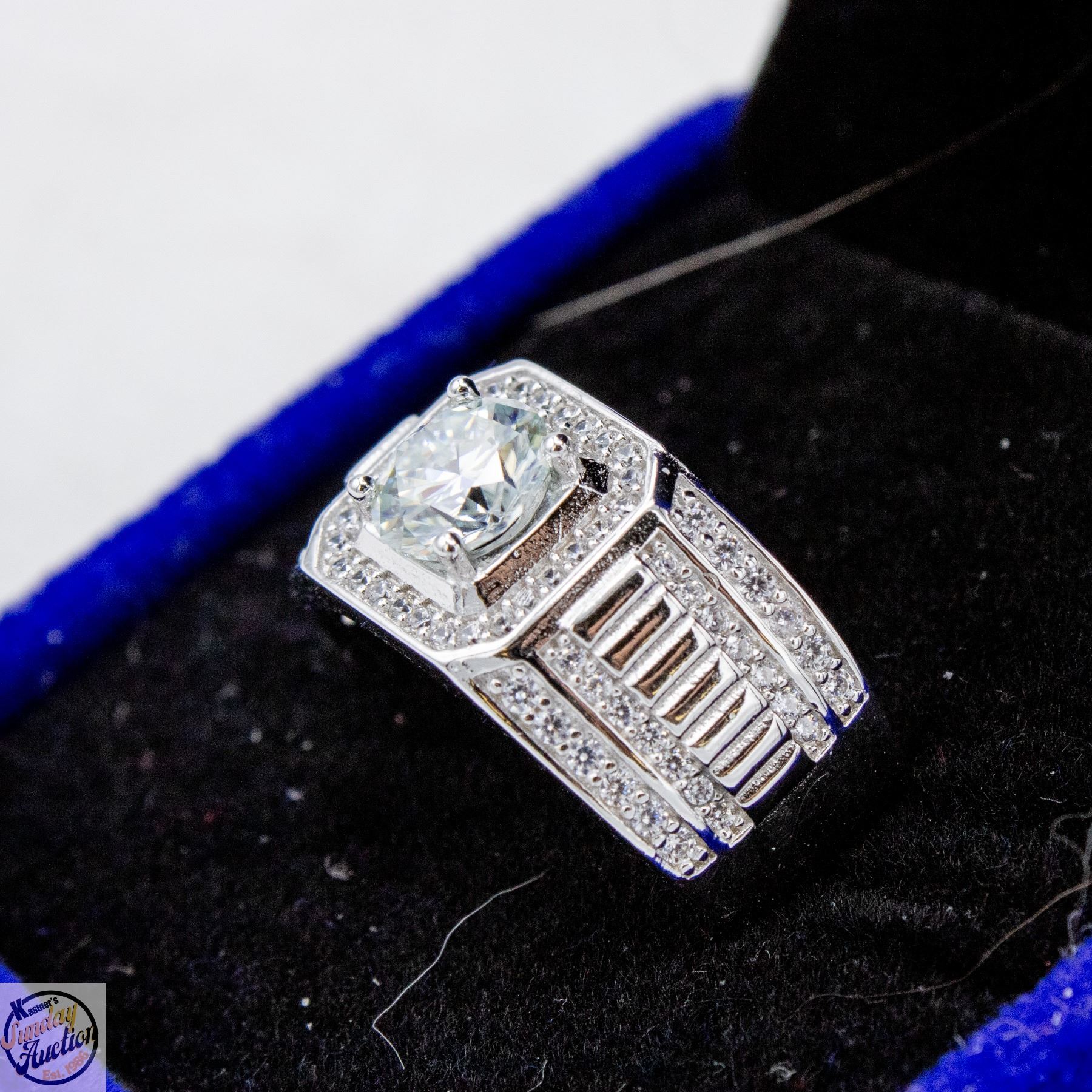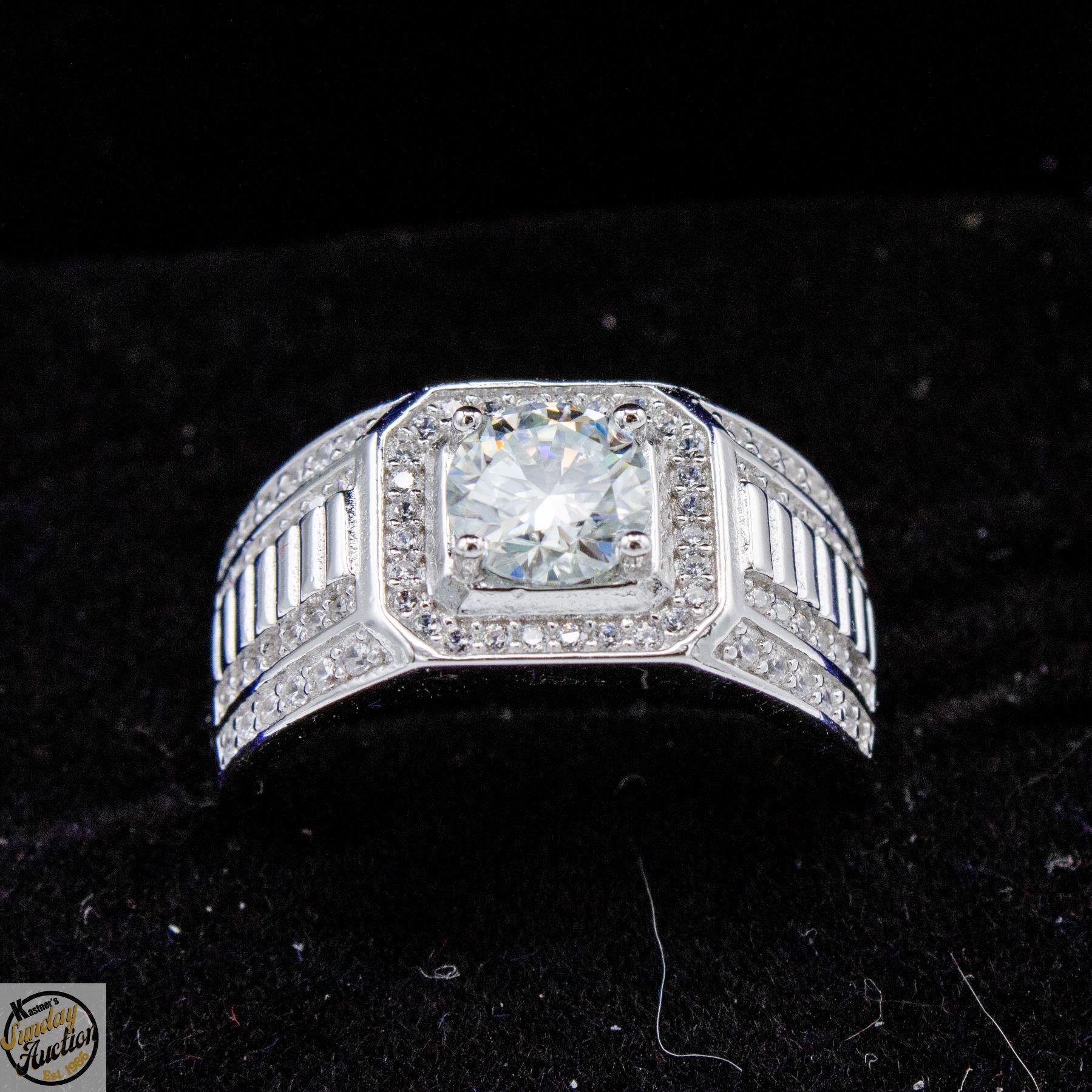 MOISSANITE STONE VVS D COLOR WITH 84 ROUND BRILLIANT CUT CUBIC ZIRCONIA SET IN SQUARE HALO AND MORE SET IN SHANKS SET IN 925 SILVER RING SIZE 8.75 RETAIL VALUE $975.00 **ALL ITEMS MUST BE REMOVED BY 5PM SATURDAY, APRIL 11TH 2026. ALL REMAINING ITEMS WILL BE SUBJECT TO A $6.00 PER DAY STORAGE CHARGE. ANY ITEMS REMAINING AFTER MONDAY, APRIL 27TH 2026 WILL BE CONSIDERED FORFEITED. NO REFUNDS WILL BE ISSUED FOR FORFEITED ITEMS. TO SCHEDULE A PICK UP APPOINTMENT CLICK HERE