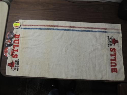 40X20 CHICAGO BULLS COTTON TOWEL & 4 BUTTON PINS. AS SHOWN. VIEW PICTURE FOR DETAIL.
