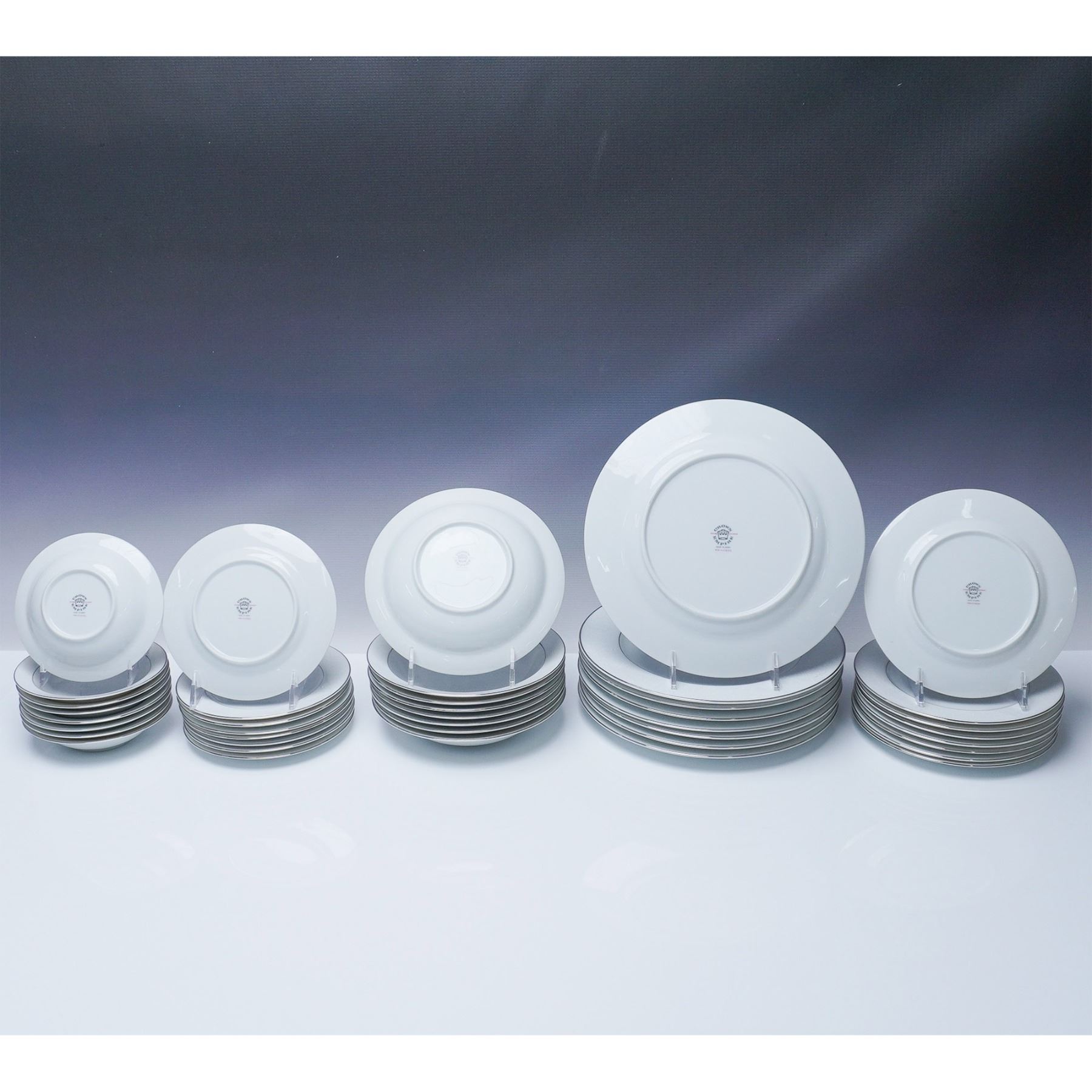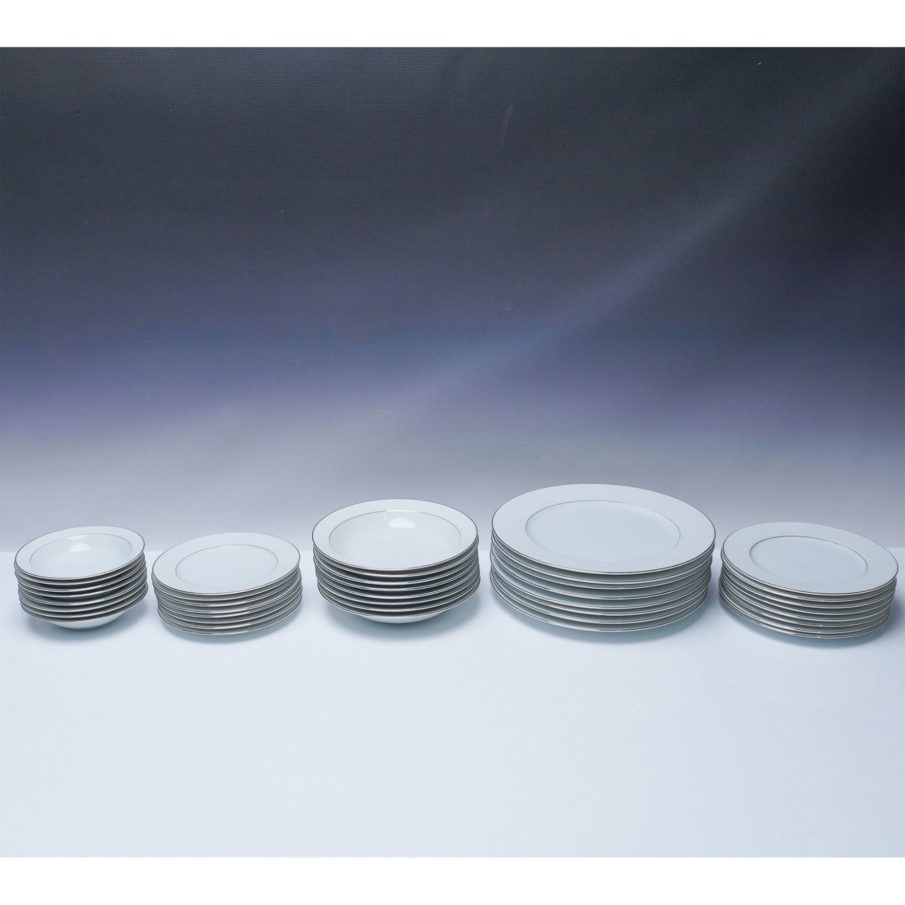 Crown Empire fine china tableware set in the Princess pattern, featuring white floral and fleur-de-lis decorations with metallic-silver trim. This collection includes eight dinner plates, eight salad plates, eight bread and butter plates, eight soup bowls, and eight dessert bowls. The pattern showcases an embossed decorative border, complementing the overall design. Crown Empire backstamp. Dinner plate: 1"H x 10.25" dia. Salad plate: 0.5"H x 7.75" dia. Bread and butter plate: 0.5"H x 6.5" dia. Soup bowl: 7.5"W x 1.5"H. Dessert bowl: 5.5"W x 1.25"H.