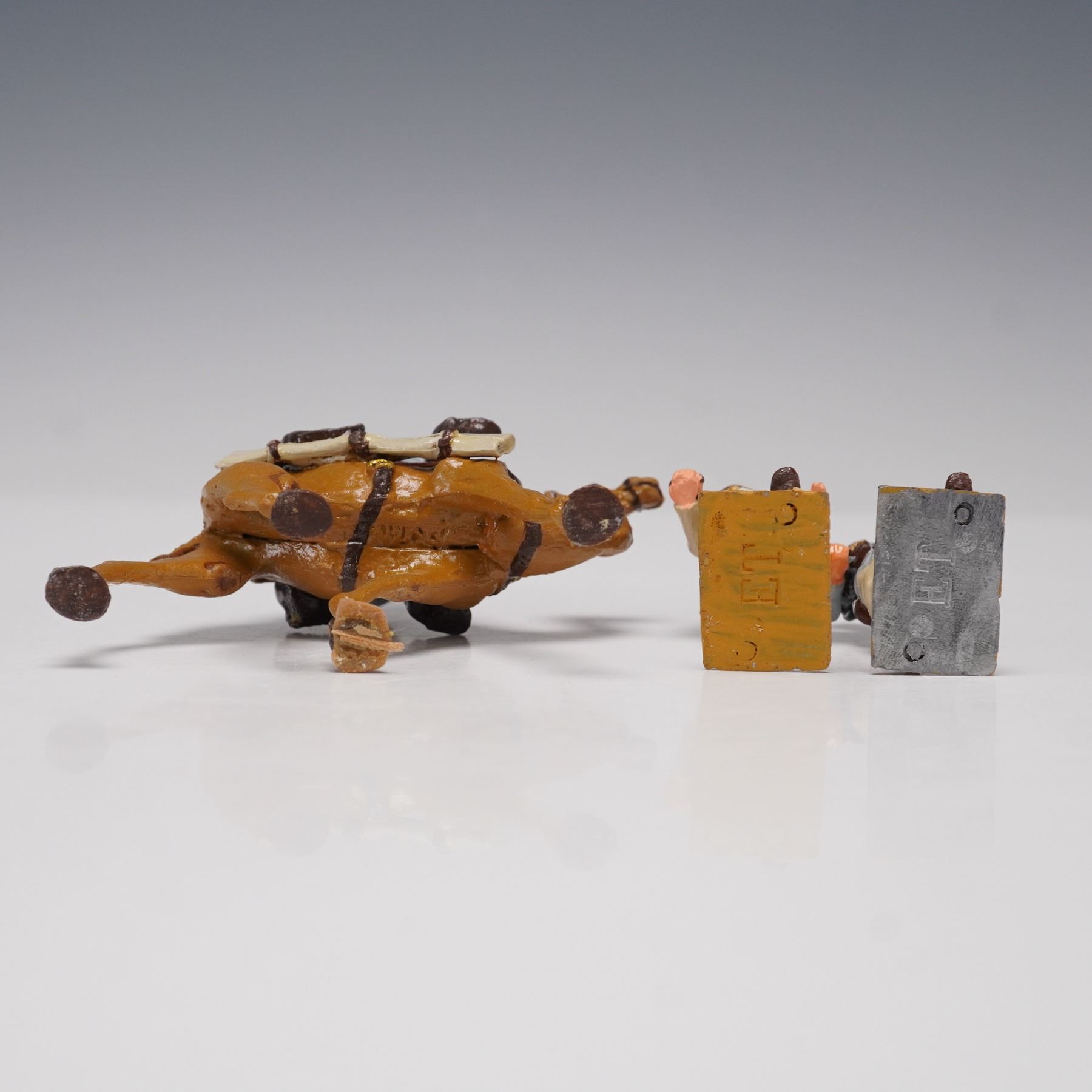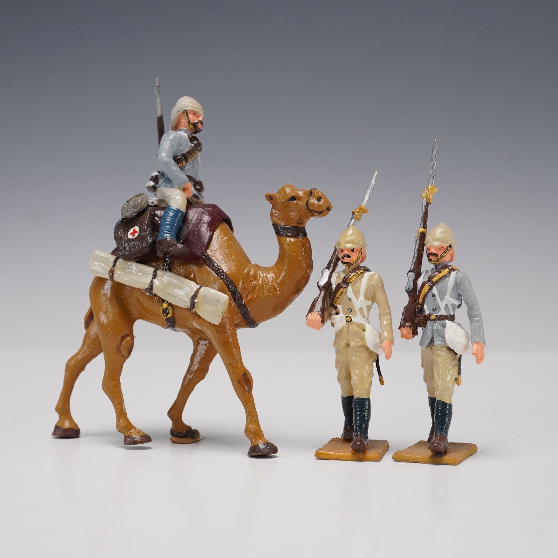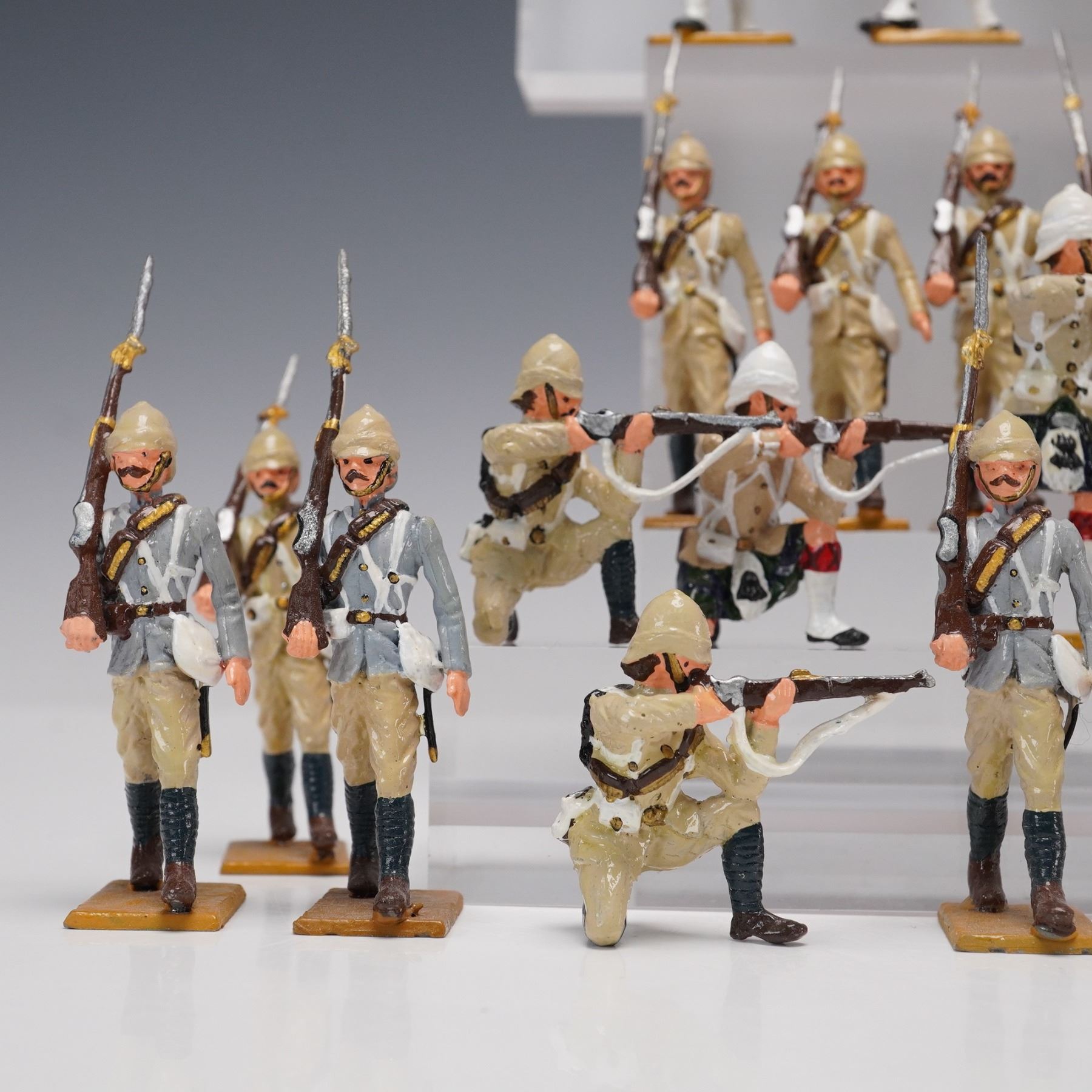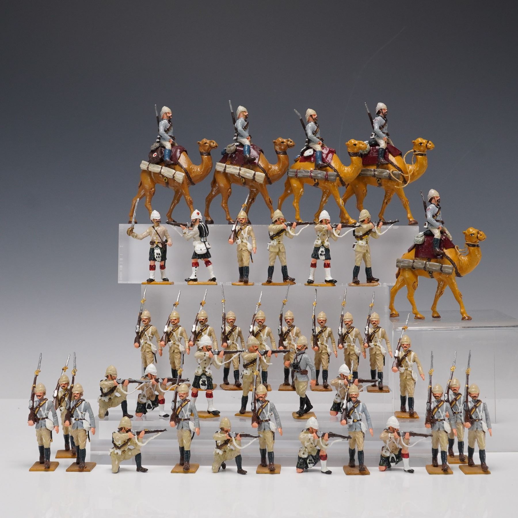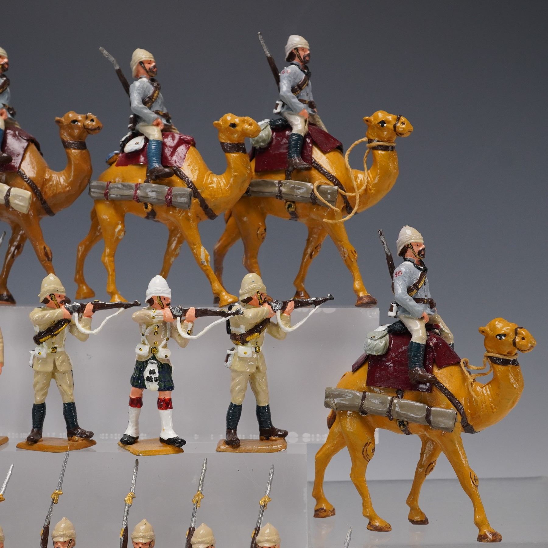 A comprehensive grouping of forty hand-painted metal figures by El Templario, including five mounted camel riders and thirty-five foot soldiers. The camel corps features soldiers in gray tunics and pith helmets, each armed with rifles and seated atop detailed saddled camels laden with supply packs. The infantry are arranged in a rich variety of poses - standing at attention, kneeling, advancing, and firing - all wearing khaki colonial uniforms with white pith helmets. Several figures include regimental detail such as kilted Highland troops and differing sash or strap arrangements. Undersides marked ET on bases. A vibrant and uniform set representing El Templario's desert campaign line, offering fine modeling and historically-inspired military dress.