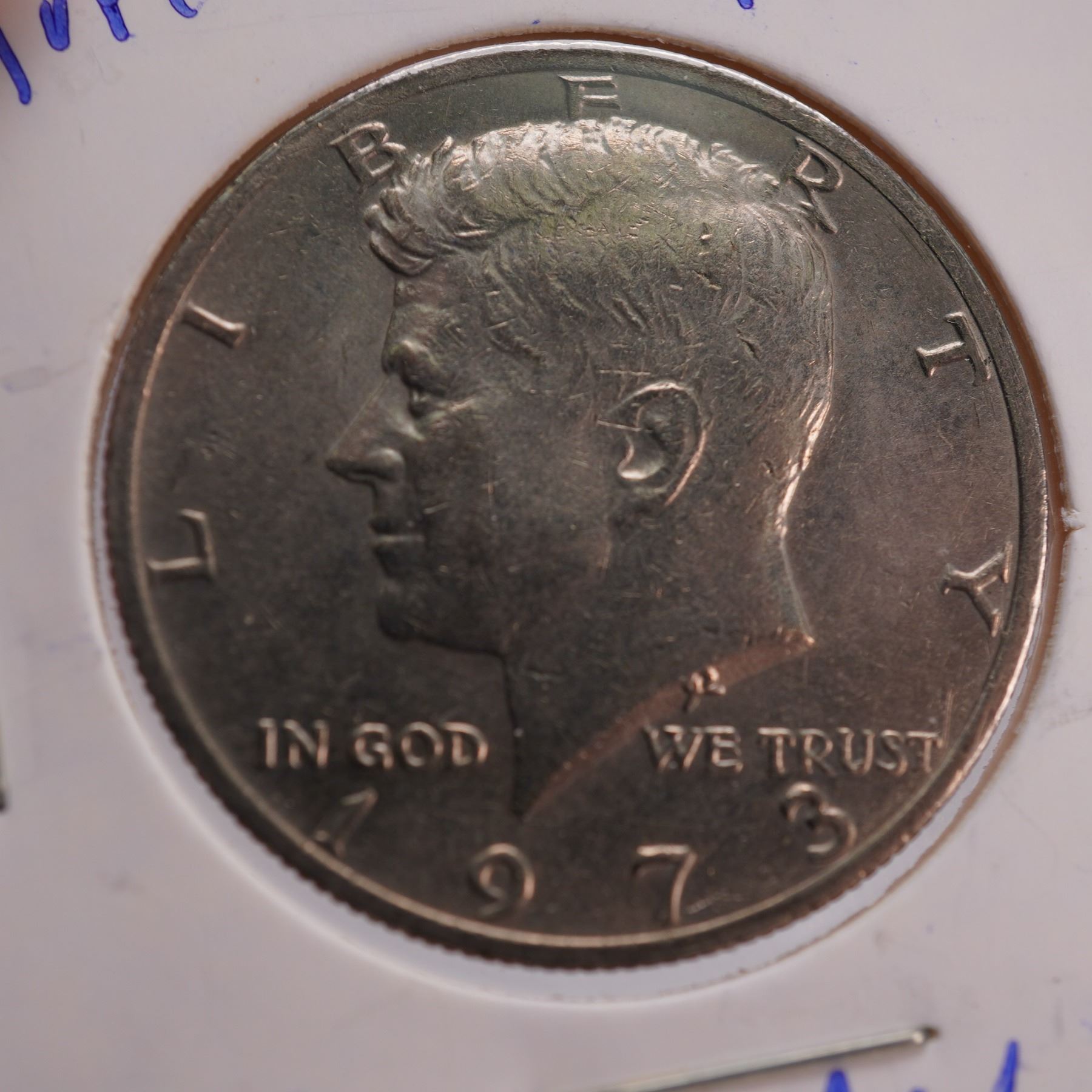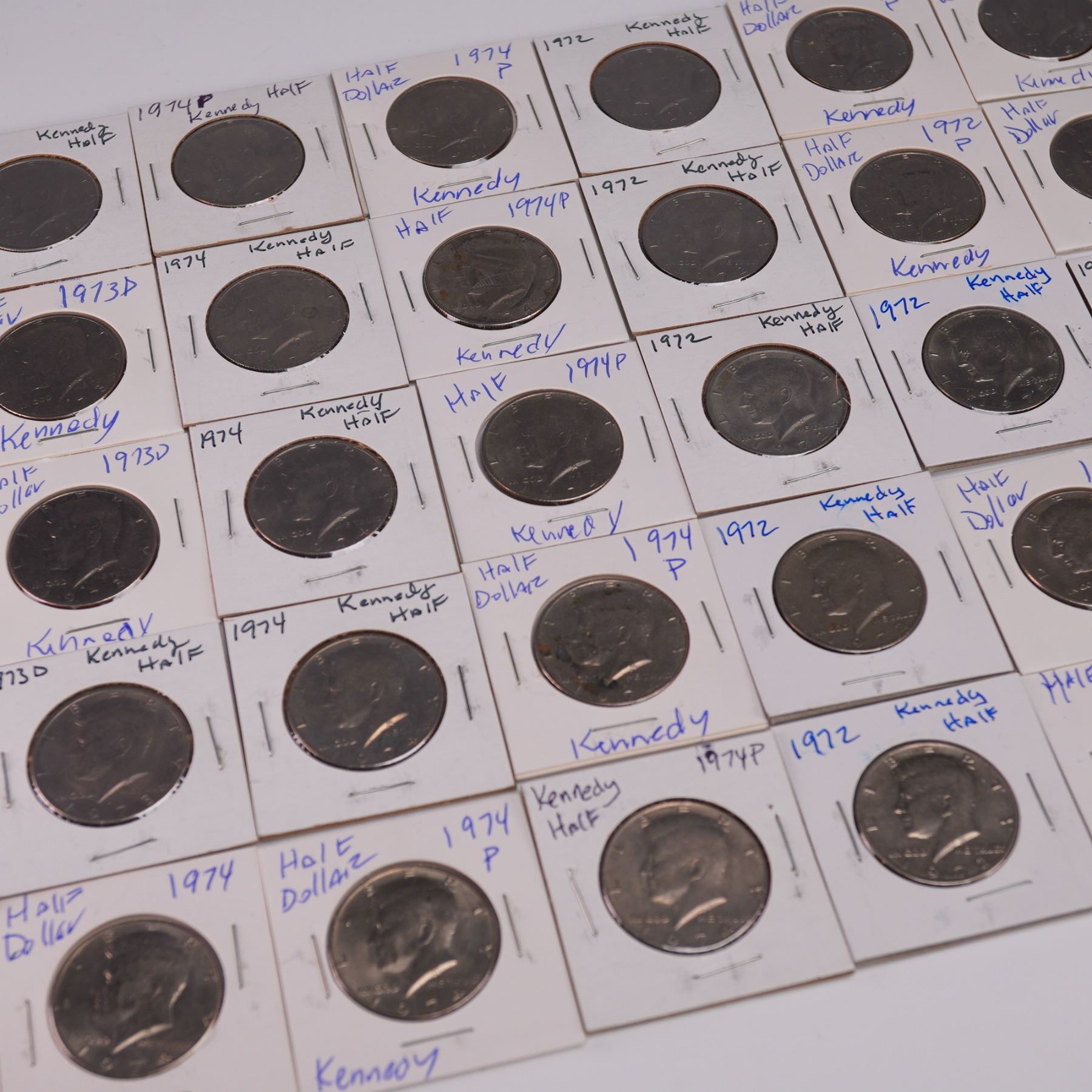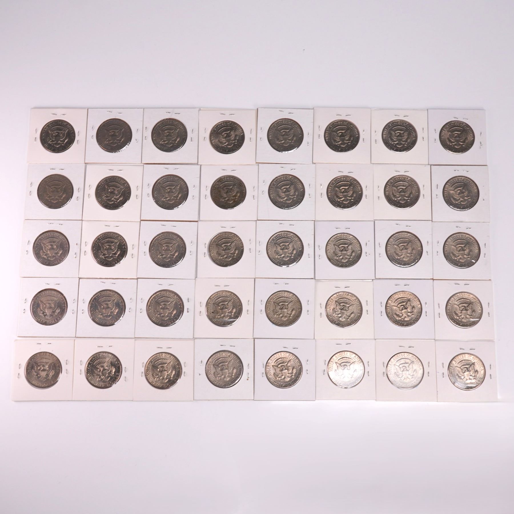 Collection of 40 Kennedy half dollar coins dated primarily 1971 to 1974, each featuring the profile of President John F. Kennedy on the obverse and the Presidential Seal on the reverse. These coins were first issued in 1964 to honor President Kennedy after his assassination and replaced the Franklin half dollar. All coins are housed in individual 2x2 cardboard holders for organization and protection. Each coin measures approx. 30.6mm dia. Each holder measures approx. 2"W x 2"H.