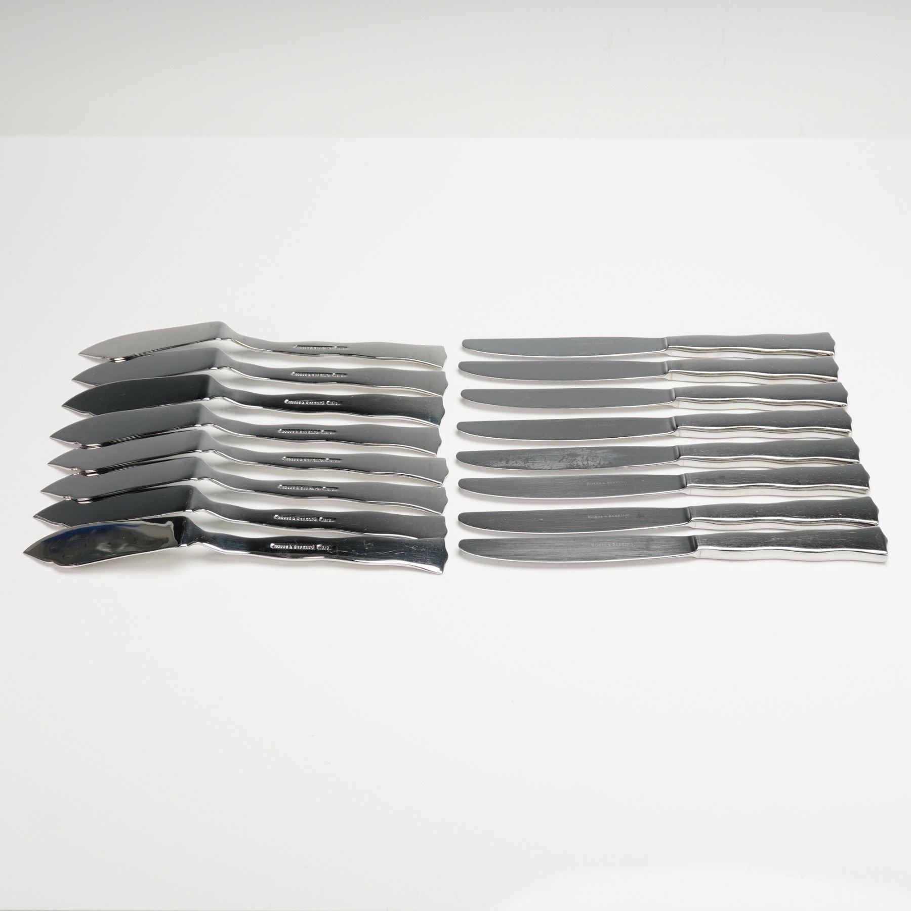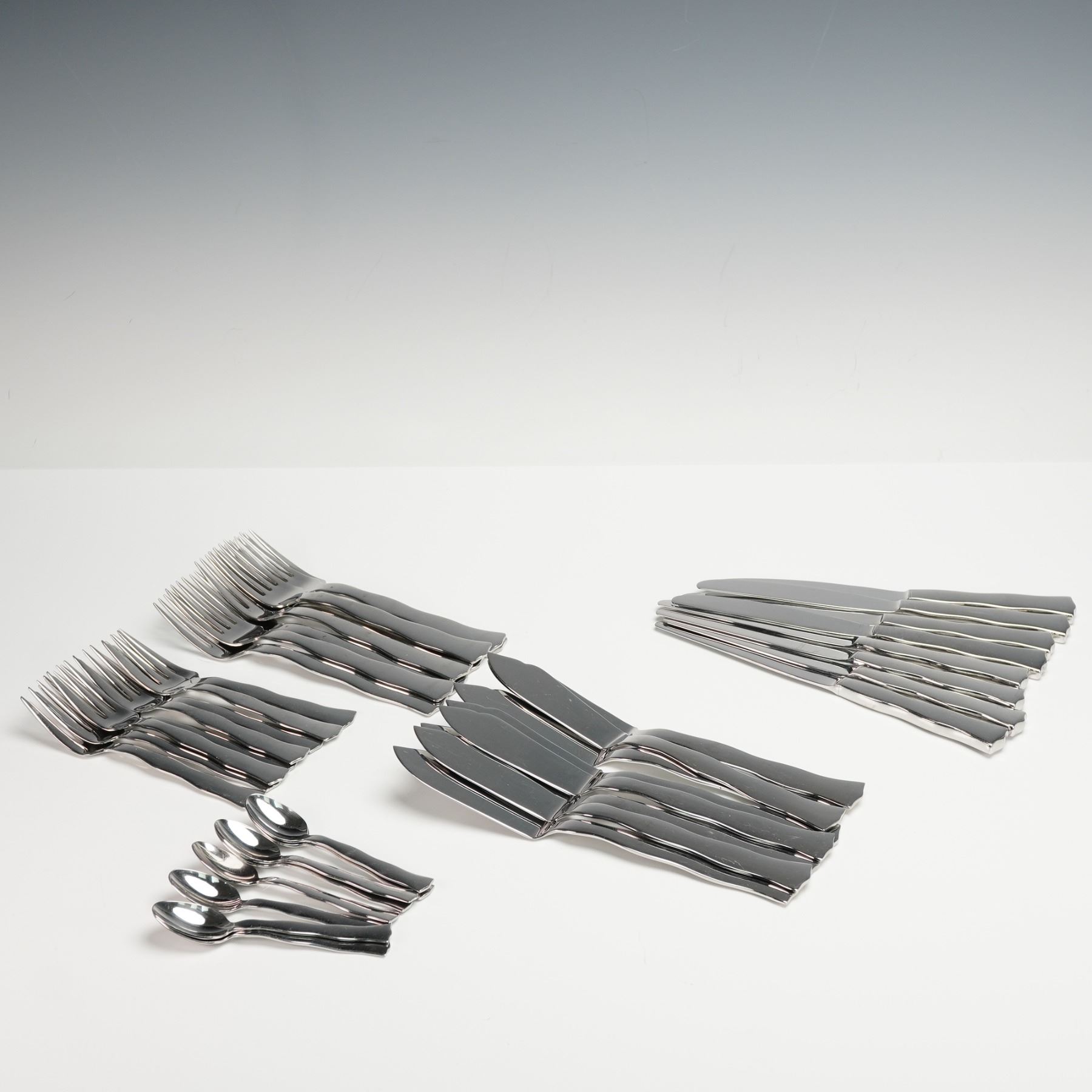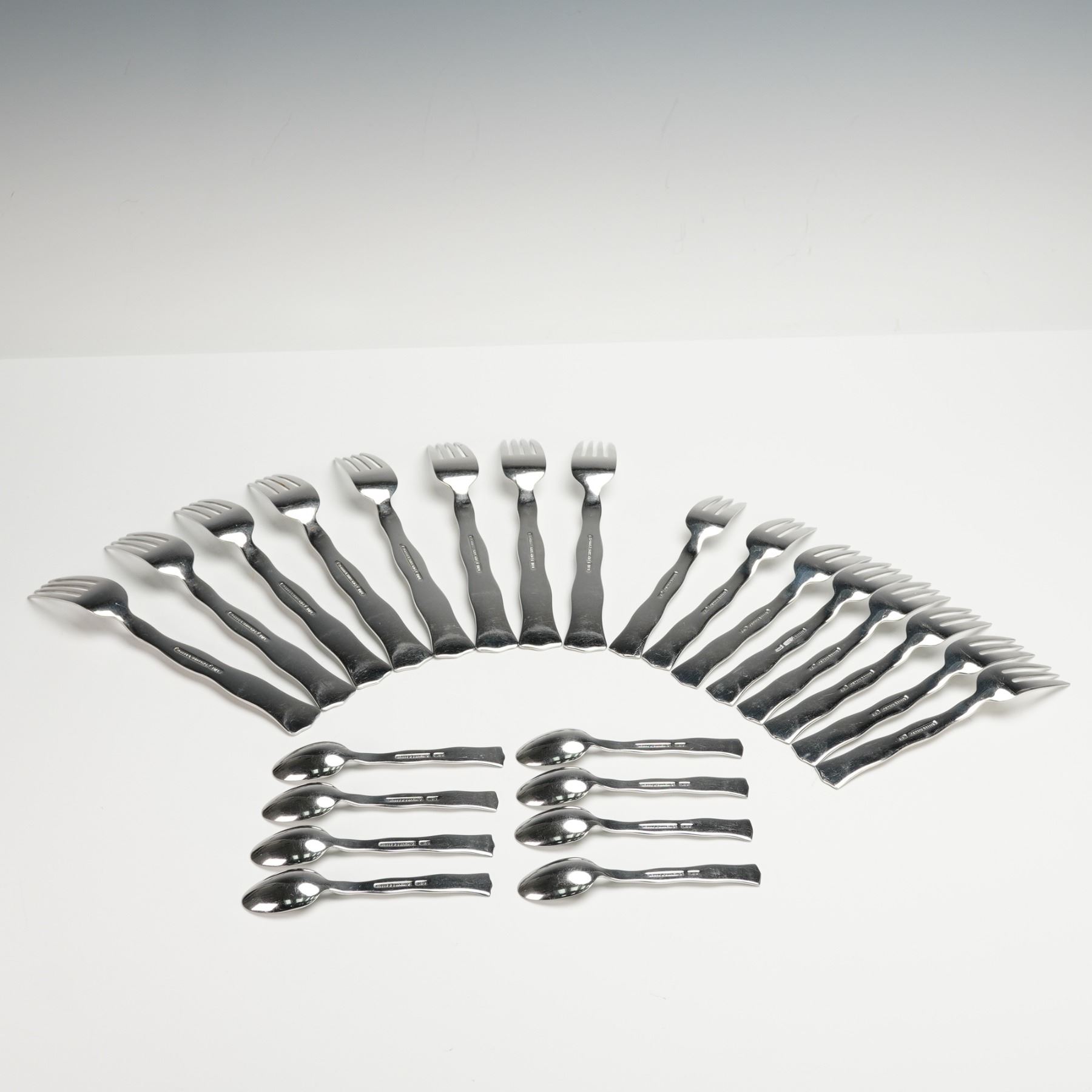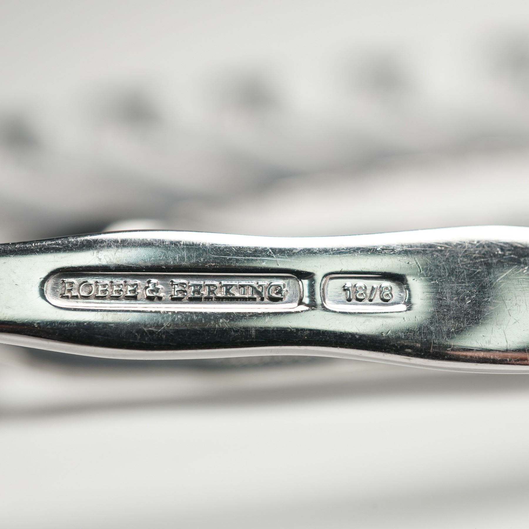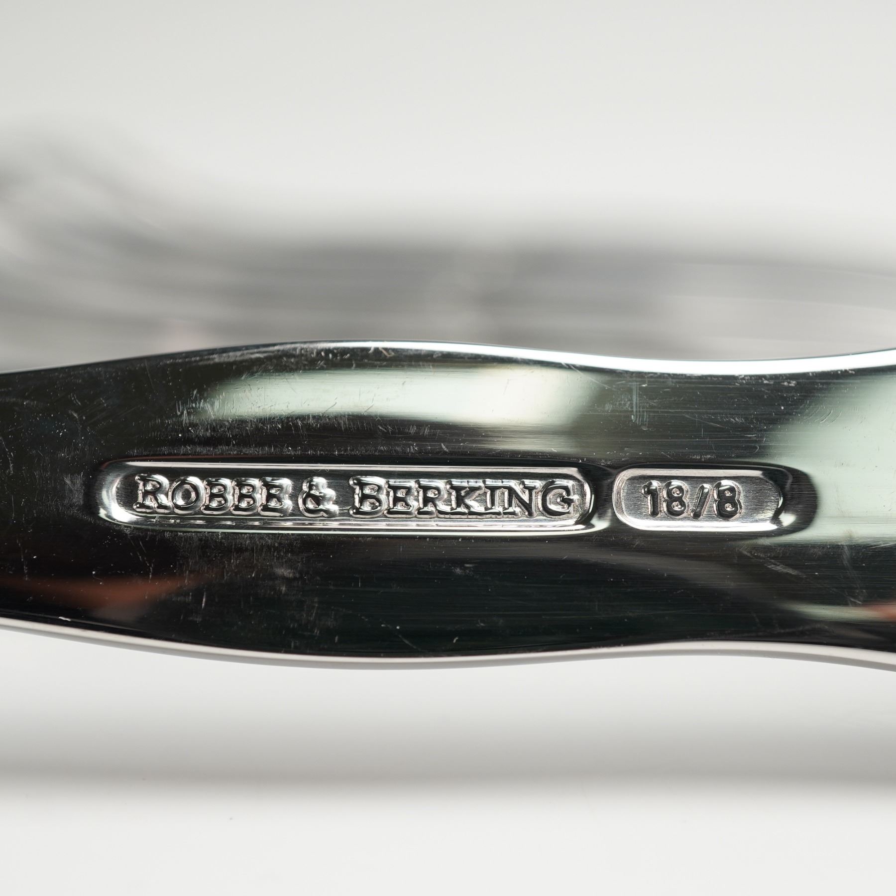 A set of 8 dessert knives, 8 cake forks, 8 coffee spoons, 8 tart knives, and 8 forks with gentle wavy handles that transition into smooth polished heads. Robbe and Berking backstamp. Marked 18 / 18.