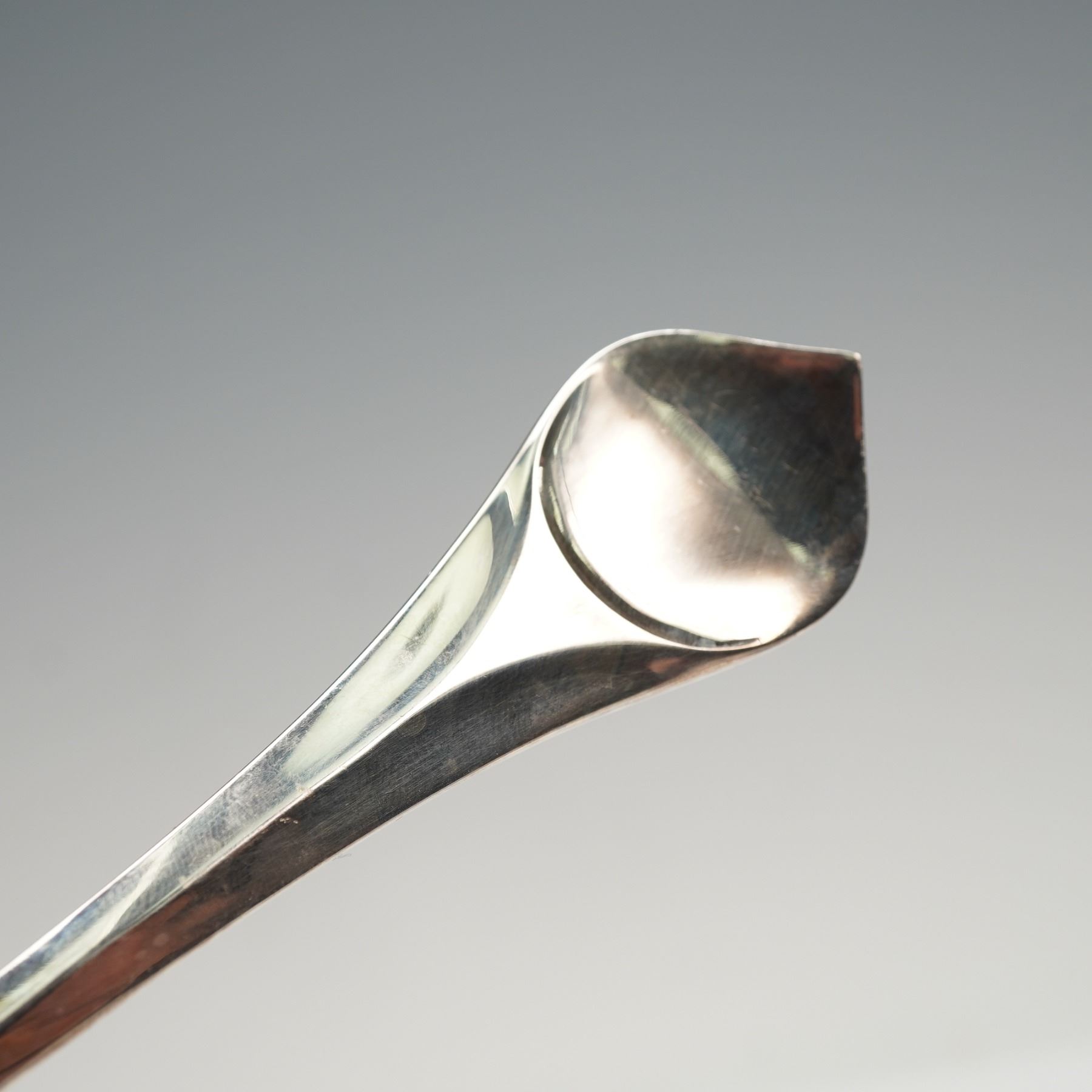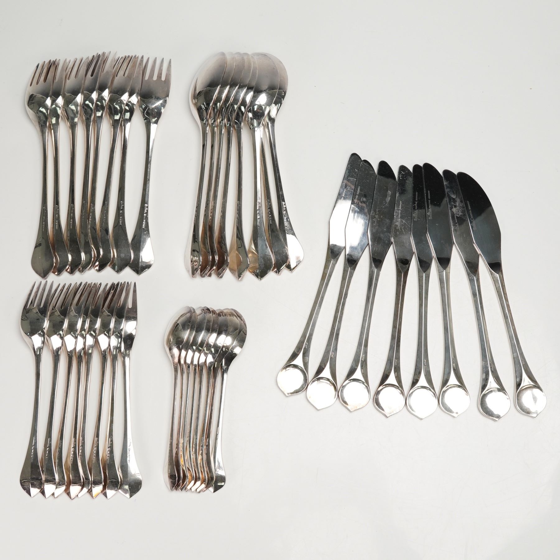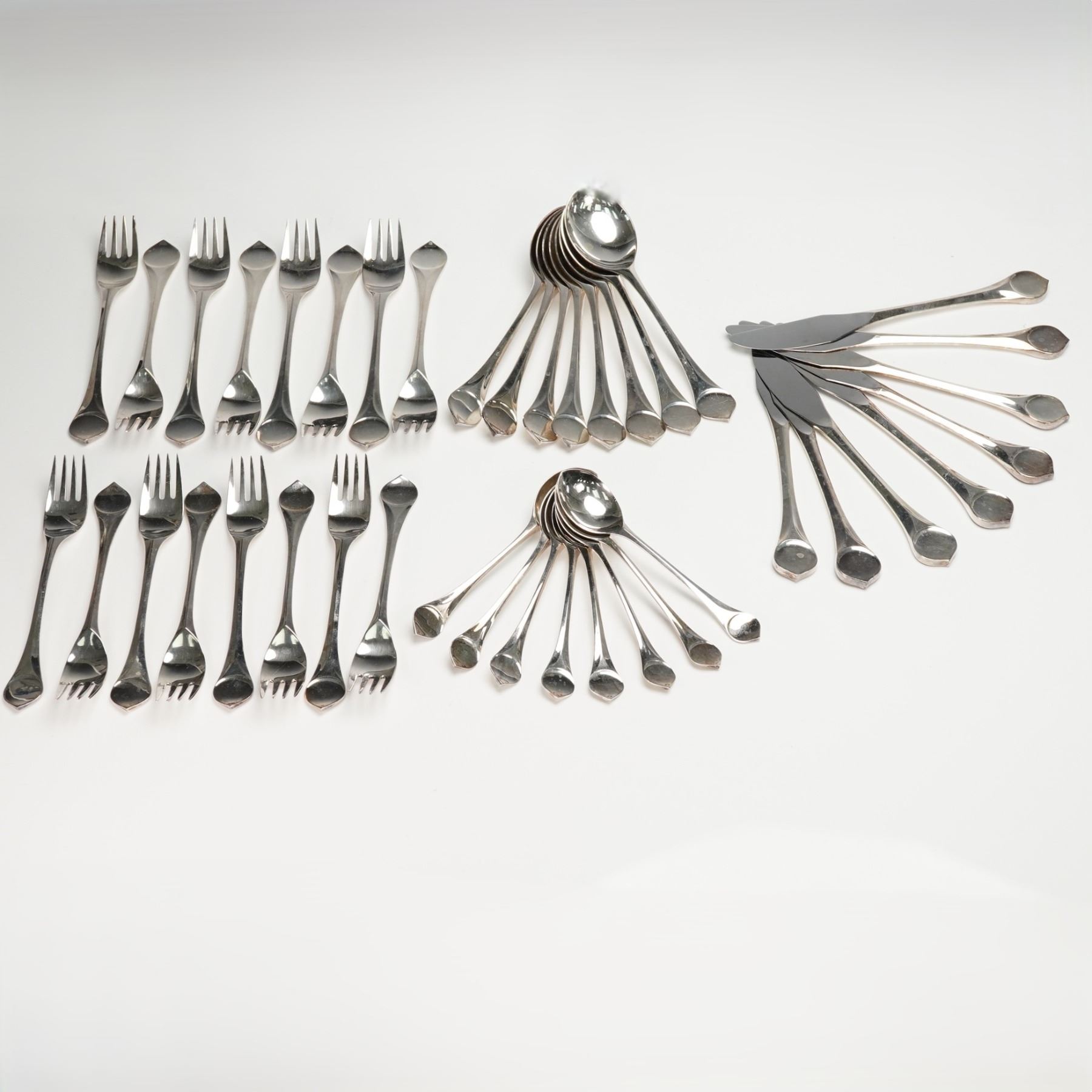 Each utensil displays a refined modernist profile with elegantly contoured handles. Includes 8 dinner forks, 8 individual salad forks, 8 teaspoons, 8 oval soup spoons, and 8modern solid knives. Rosenthal backstamp.
