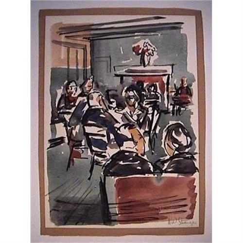 This is a piece by artist K.W. Strange (Kenneth Strange) from a portfolio found in a Maine estate. The portfolio contained a great variety of styles and periods of the artist work ranging from 1940s WPA to 1960s Modernist. This artist developed a creative and visually pleasing collection of work which we will be offering over the coming weeks. This is a wonderful water color done with great style and colors. The theme appears to be a gathering of people. It is signed lower right in pencil K.W. Strange. The painting measures 15.5 x 10.5 inches. The artist edged the paper with tape. The painting is in excellent condition. <p>Shipping and insurance are determined after checkout. <p>