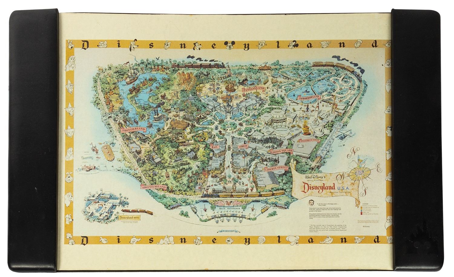 (Disneyland, 1995) A set of (7) Disneyland attraction themed desk accessories and a computer mat Disneyland map. The desk accessories range from 3"x6" and 1.75" deep to 2.5"x8.5" and 4" deep, while the desk pad measures 20"x32" and .5" thick. The overall condition is good with some paint wear to the tea cup, and light wear from use to the other pieces. The desk pad has some creasing to the protective plastic cover and some wear to the arm rests from use.