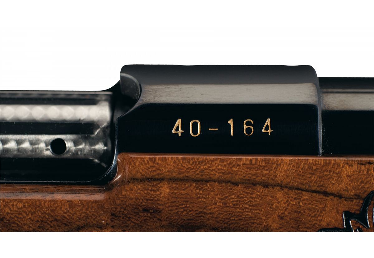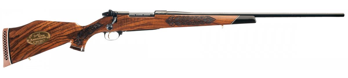 This is one of only 200 rifles manufactured in 1985 to commemorate the 40th Anniversary of the Weatherby company. This rifle has no sights with holes tapped for scope mounting with gold washed filler screws. All of the markings are filled with gold. Mounted on a wonderfully figured Turkish walnut pistol grip stock with contrasting forend, laser etched decorative carving on the forearm, left side of buttstock and pistol grip area, contrasting grip cap, gold washed sling studs, a gold washed plaque inlaid in the right side of the stock, raised comb and a factory recoil pad. With a leather covered case lined in blue shag fabric.