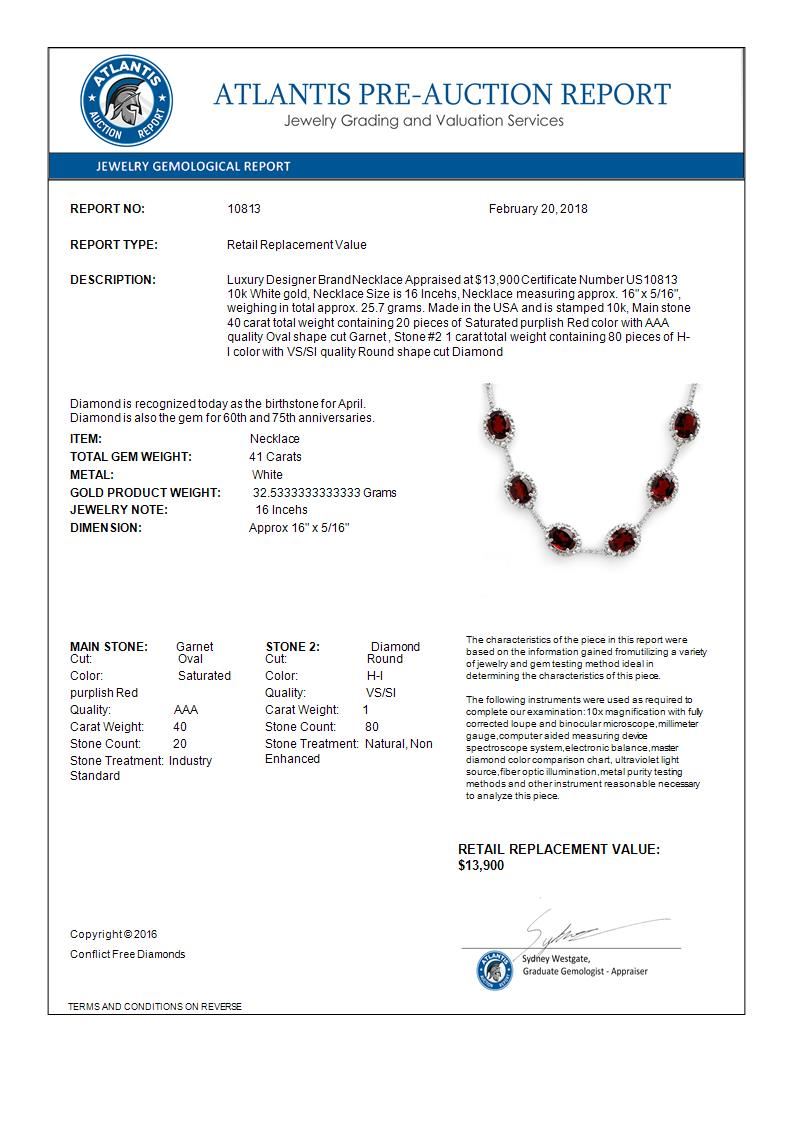 REF-194A5X -10813 ---- 41.0 CTW Garnet & Diamond Necklace 10K White Gold ---- Luxury Designer Brand Necklace Appraised at $13,900 Certificate Number US10813 10k White gold, Necklace Size is 16 Incehs, Necklace measuring approx. 16" x 5/16", weighing in total approx. 25.7 grams. Made in the USA and is stamped 10k, Main stone 40 carat total weight containing 20 pieces of Saturated purplish Red color with AAA quality Oval shape cut Garnet , Stone #2 1 carat total weight containing 80 pieces of H-I color with VS/SI quality Round shape cut Diamond