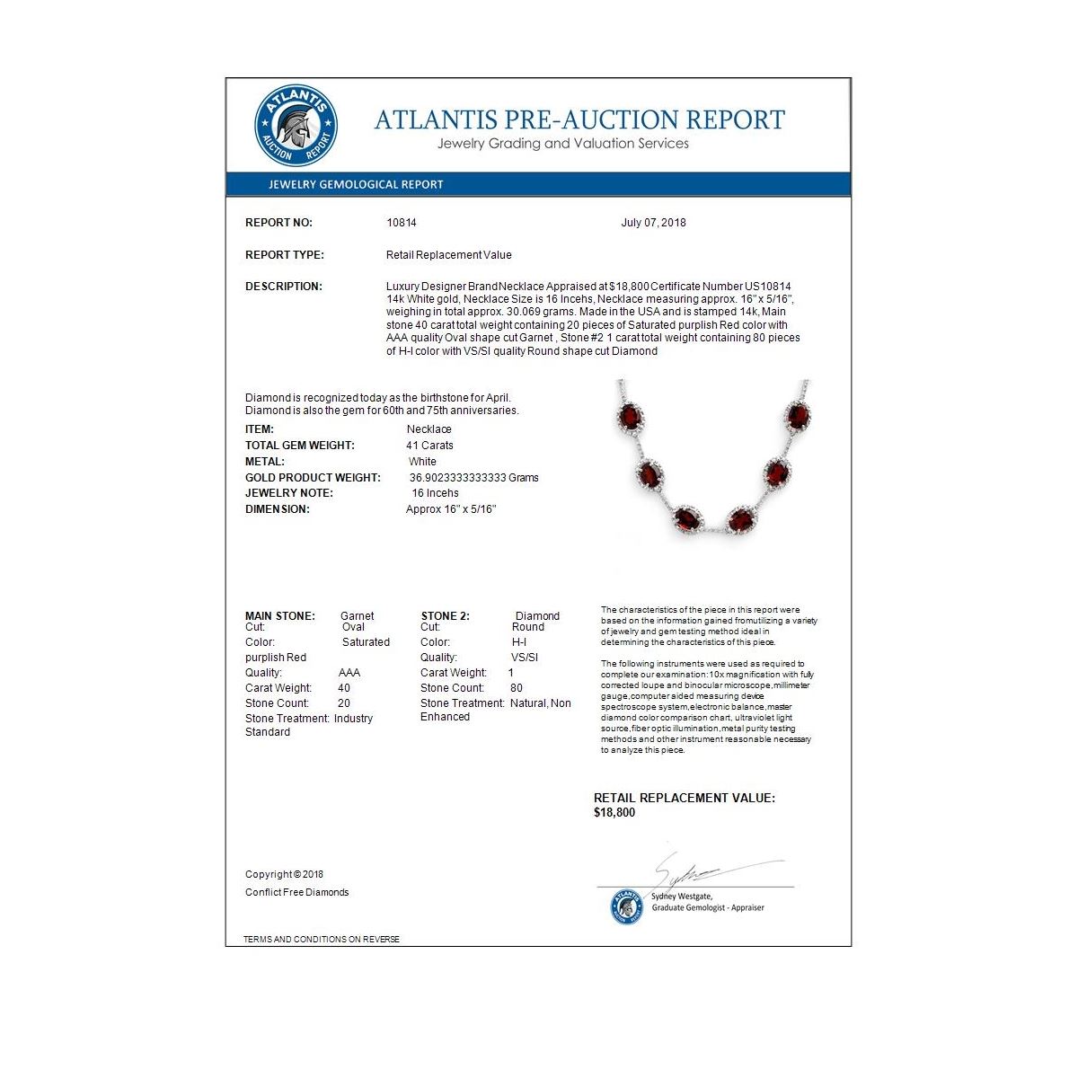 REF-262W8F -10814 ---- 41.0 CTW Garnet & Diamond Necklace 14K White Gold ---- Luxury Designer Brand Necklace Appraised at $18,800 Certificate Number US10814 14k White gold, Necklace Size is 16 Incehs, Necklace measuring approx. 16" x 5/16", weighing in total approx. 30.069 grams. Made in the USA and is stamped 14k, Main stone 40 carat total weight containing 20 pieces of Saturated purplish Red color with AAA quality Oval shape cut Garnet , Stone #2 1 carat total weight containing 80 pieces of H-I color with VS/SI quality Round shape cut Diamond
