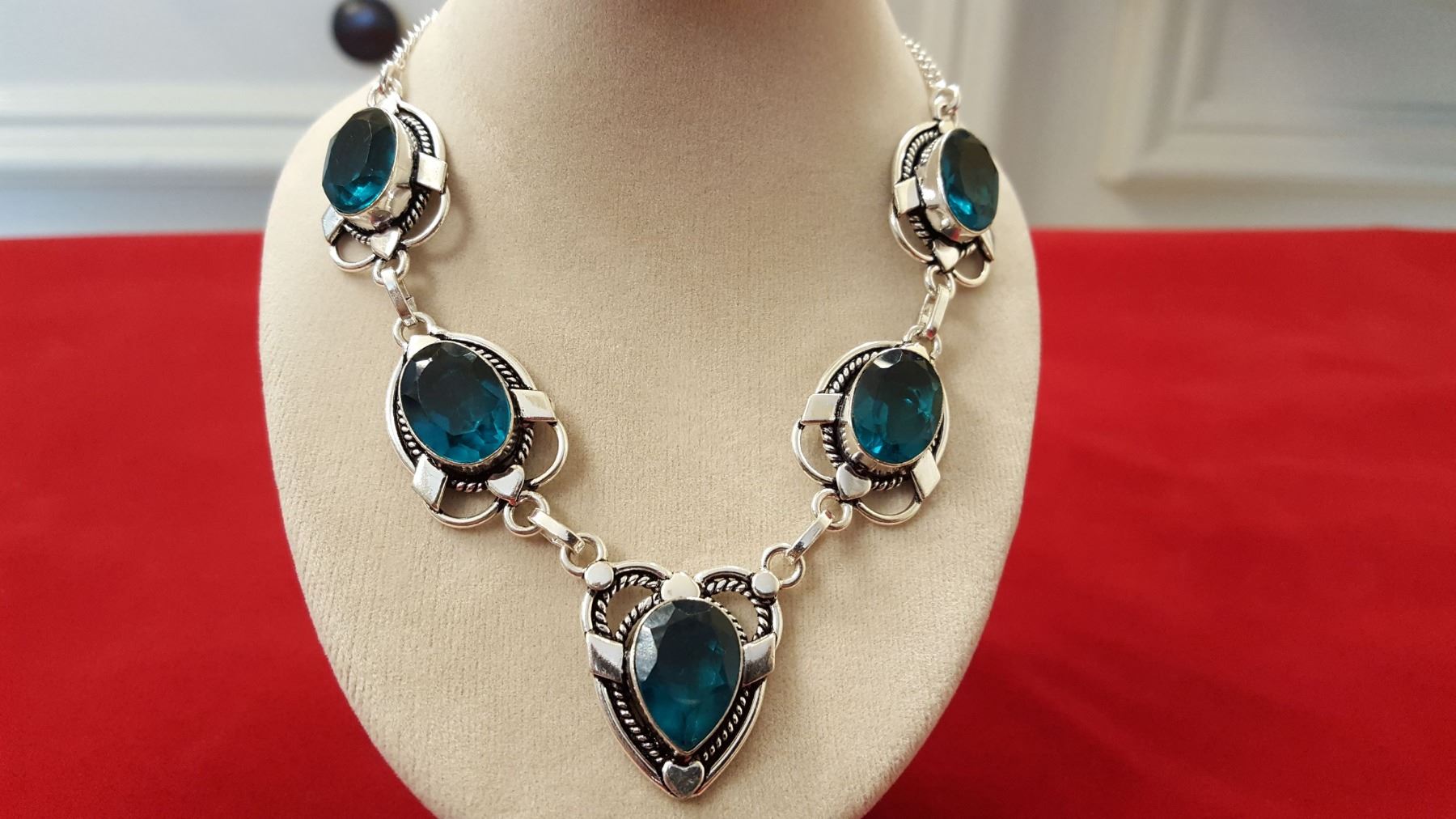 Breathtaking 41.00ctw Paraiba tourmaline necklace. These lab created Paraiba are near flawless. Displaying a beautiful blue green hue with 360 degree even saturation. 18" long mounted in .925 sterling silver overlay. 24.6 gram total weight.