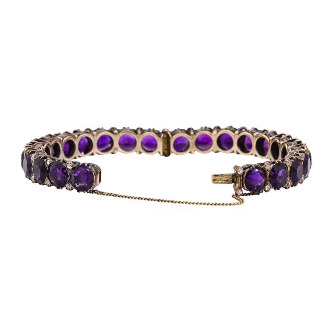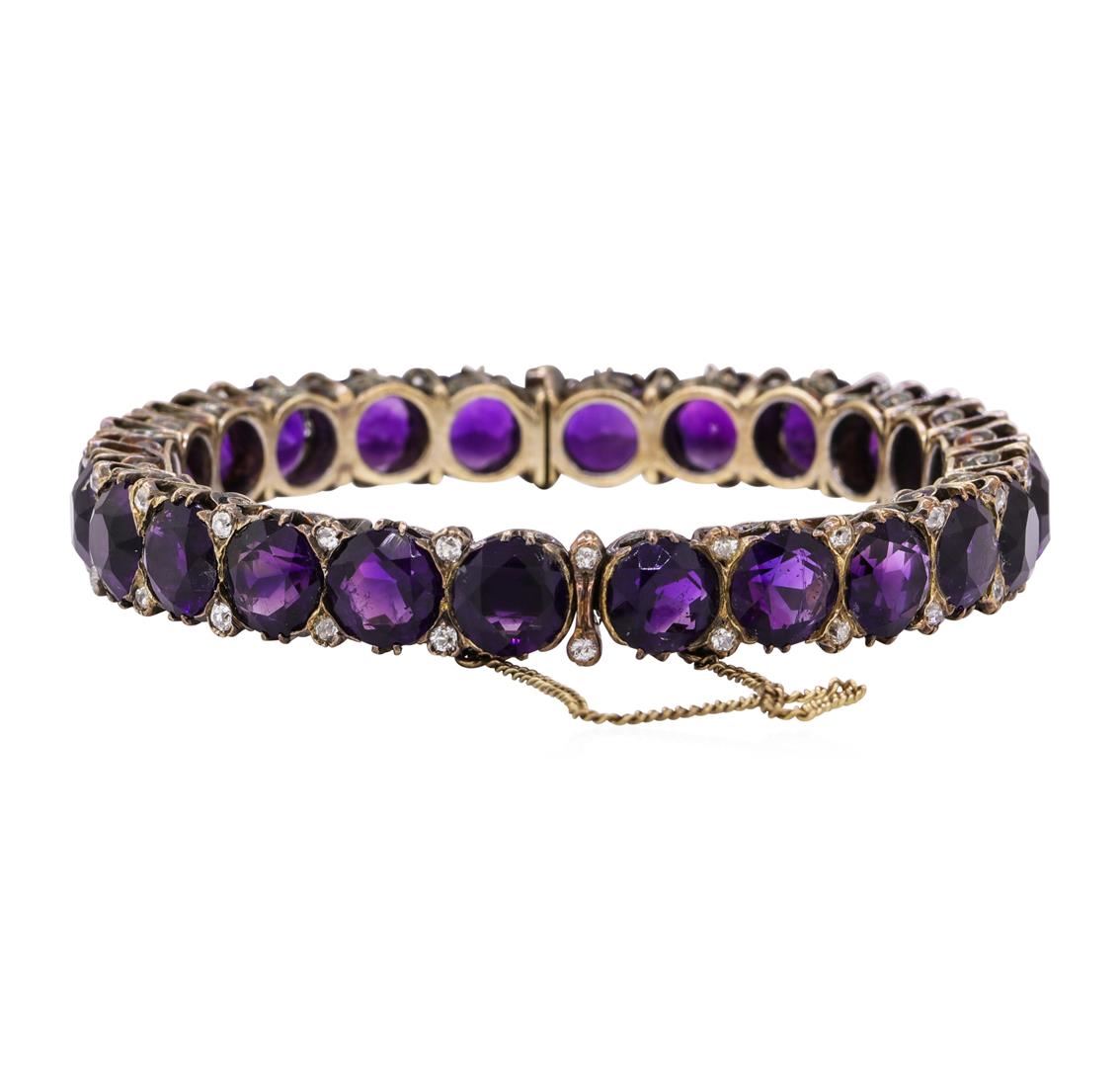 One vintage style bangle bracelet with black antiquing featuring: 14KT yellow gold weighing 41.3 grams containing amethysts weighing 40.00ctw and diamonds weighing 1.20ctw. The bracelet measures approximately six and a half inches in circumference.