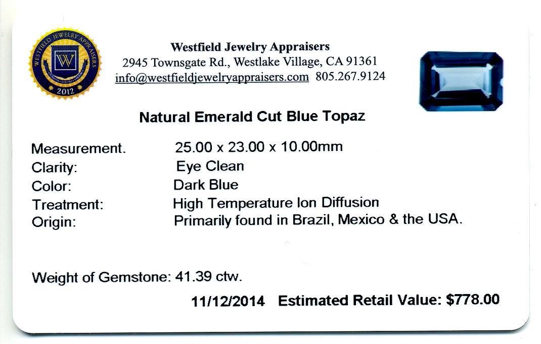 41.39ctw. Natural Emerald Cut Blue Topaz. Westfield Appraised at $778.00.
