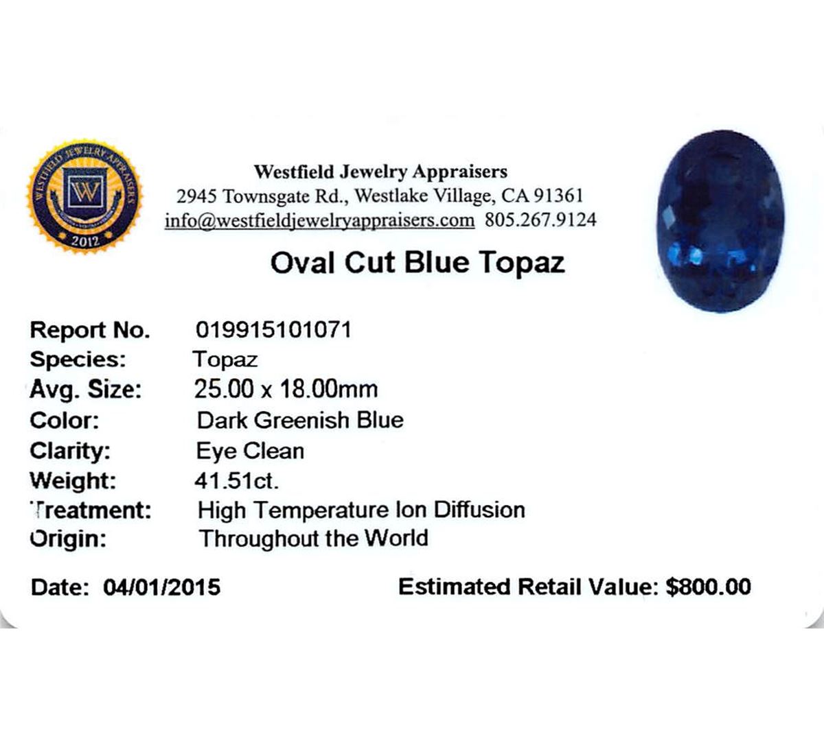 One oval cut natural blue topaz exact weight 41.51ct., clarity is eye clean, type I, dark, very slightly grayish, greenish blue color, (GIA gB 7/3), cut is good. Westfield Appraised at $800.00.