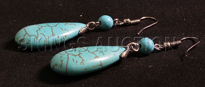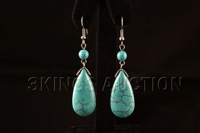 41.97ctw Dangling Blue Turquoise Silver Earring **|**|** 2" Natural Flat Blue Turquoise Teardrop Design Silver Earring; pear size: 28.82x14.28x7.40mm; round size: 5.91mm ; MSRP: $300