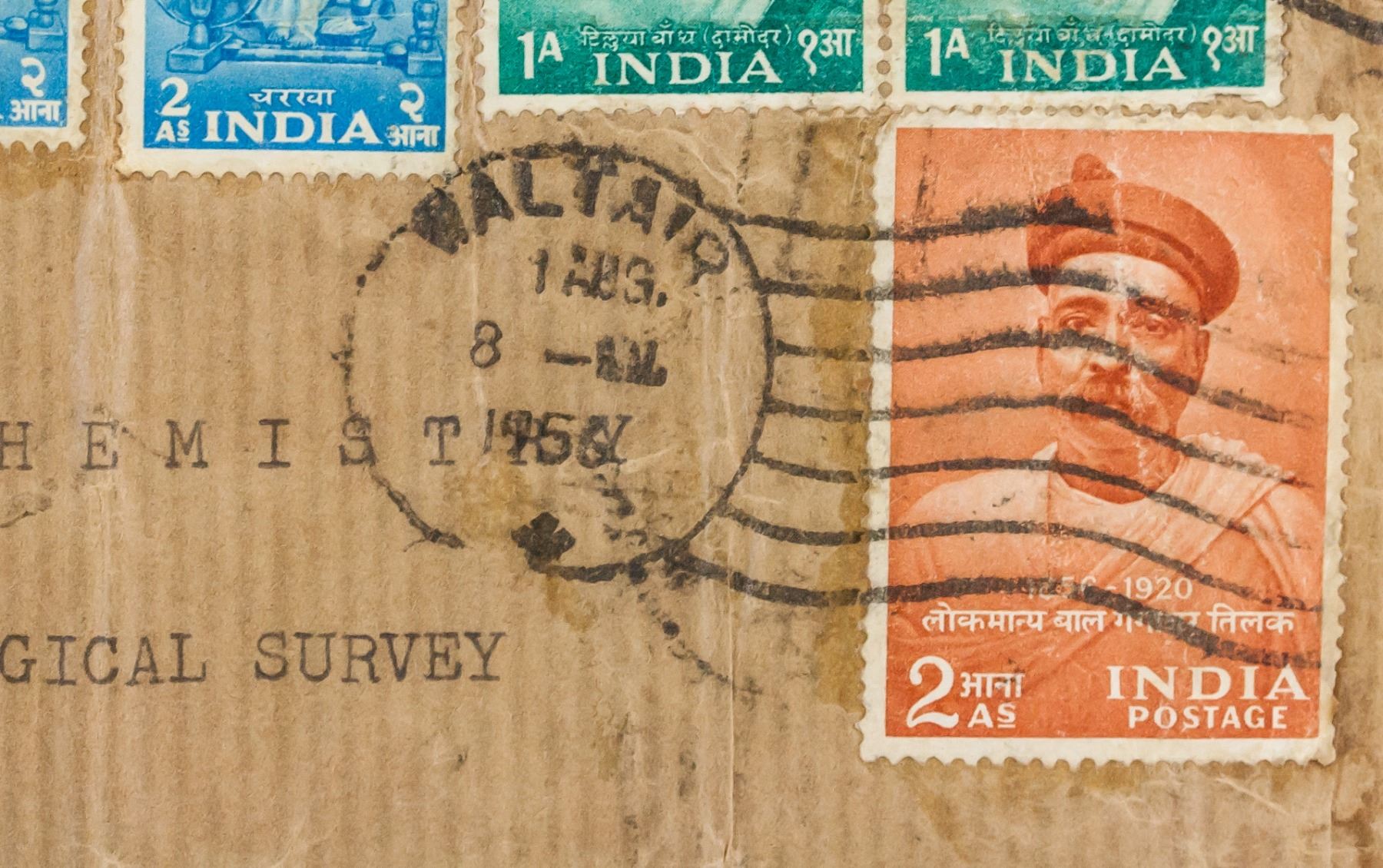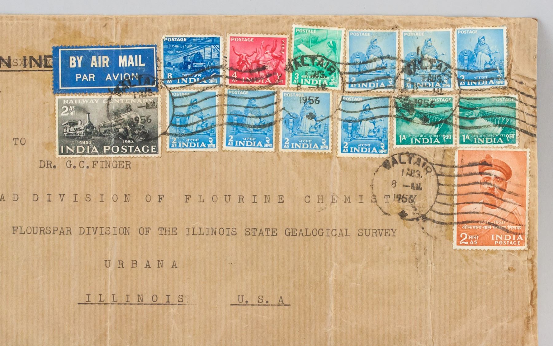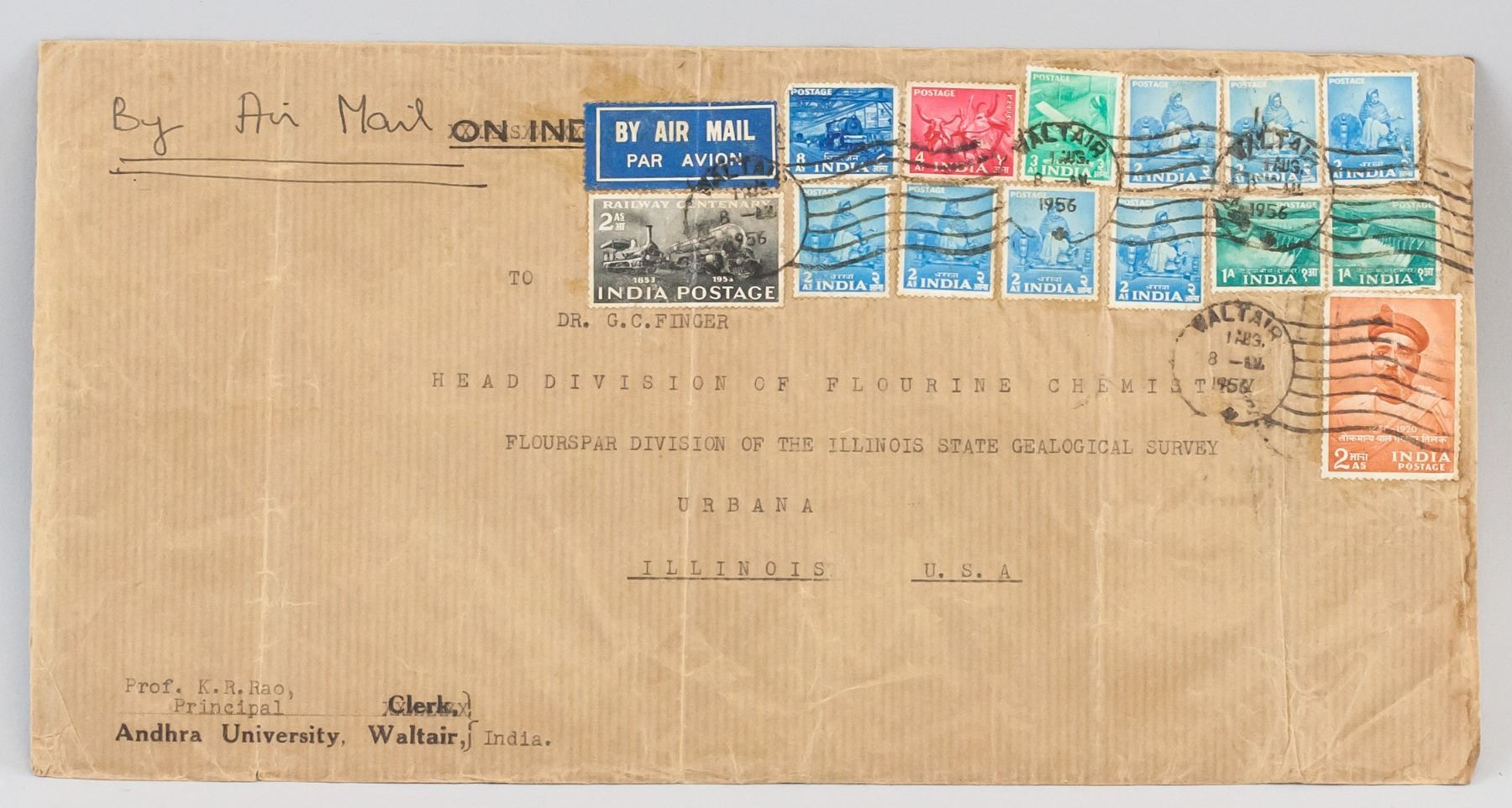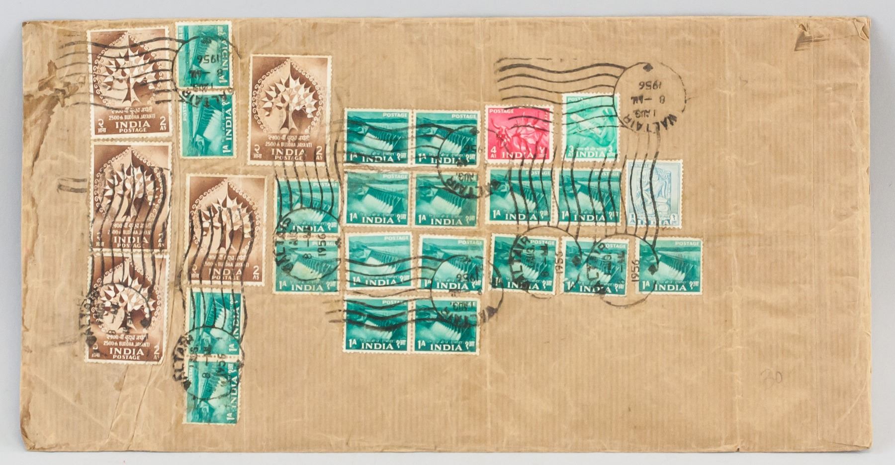 Fourty-one (41) assorted Indian stamps. On envelope stamped 1956. 15 x 29.5 cm