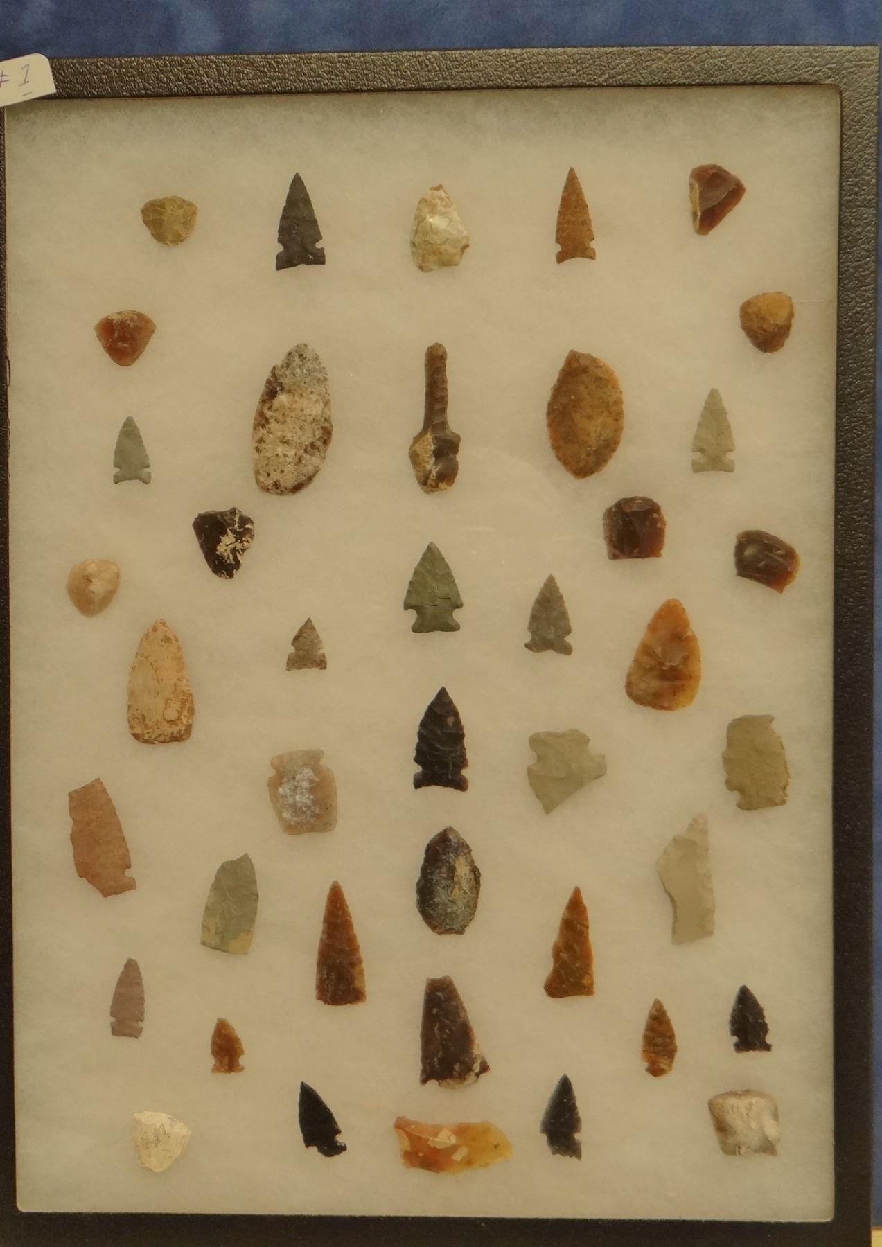 41 artifacts in 12”x 16”x1” frame, includes 11 scrapers, 22 arrowheads, 1 awl, 7 knives