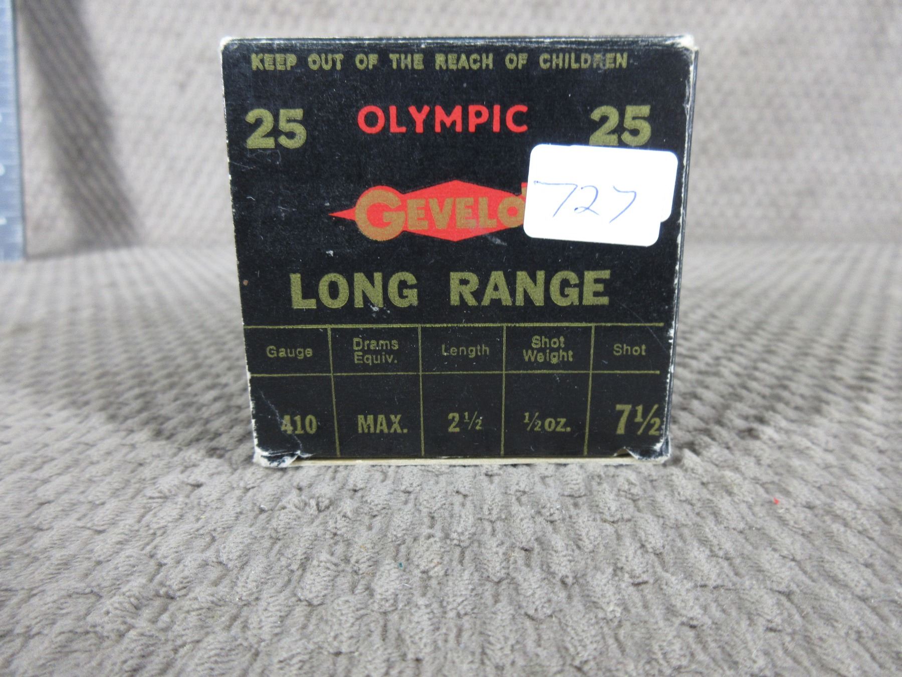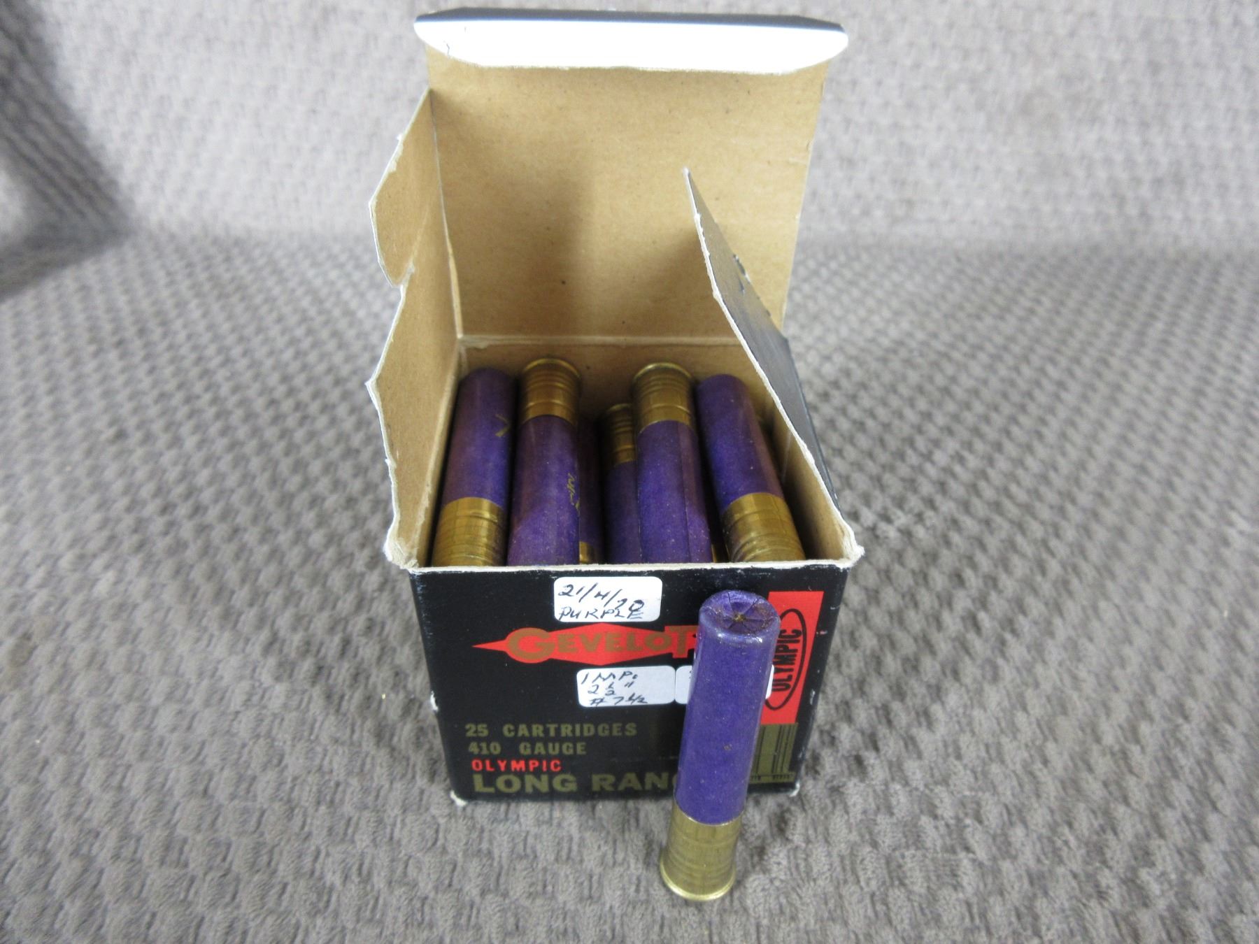 410 Ga 2 1/2" Box of 25 Gevelot Vintage Collector Ammo - Gevelot Olympic Long Range #7 1/2, Purple Star Crimp, made in Canada