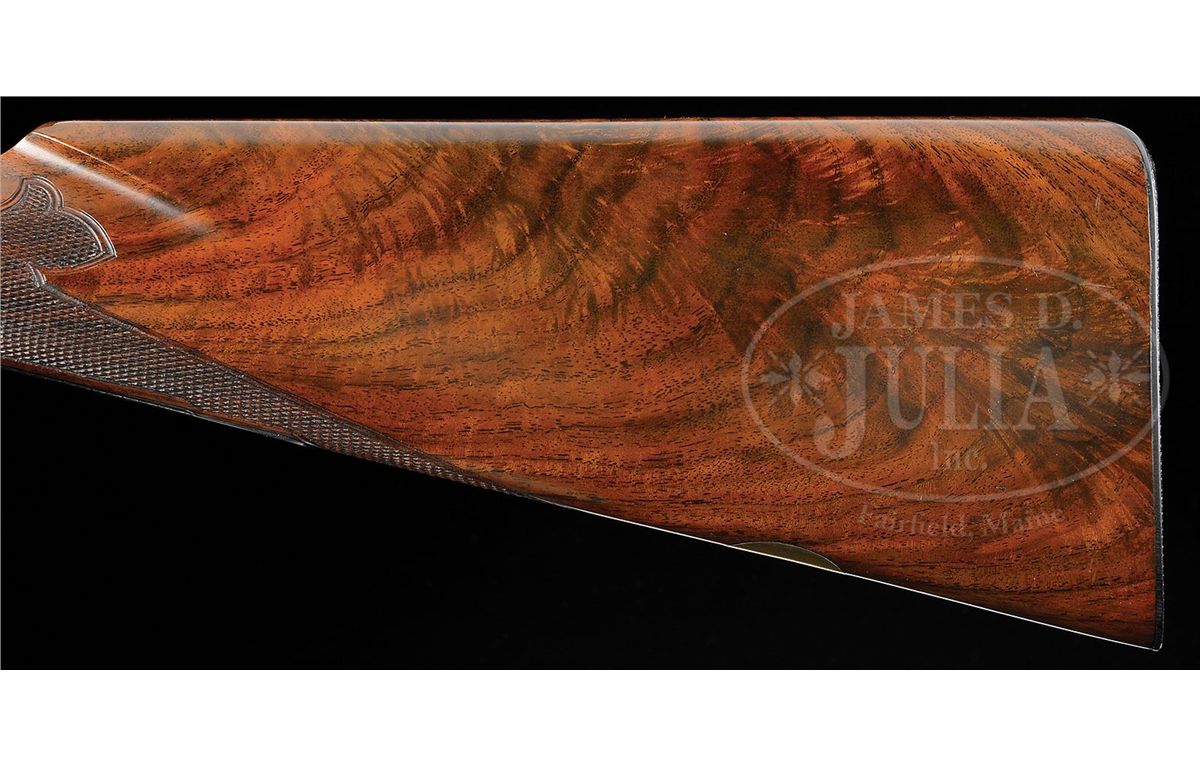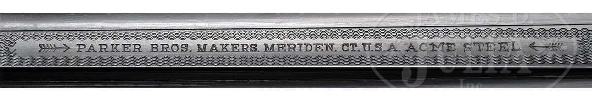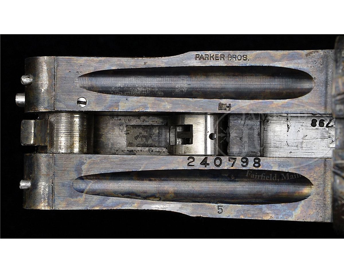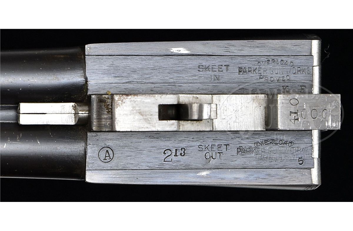 SN 240798. Cal. .410. 3" Chambers. 000 Frame. 26" Bbls. Starting with a VHE single trigger in .410, this attractive little gun was created by changing "steel" designation on rib to "Acme", changing stamp on bottom to an "A" within circle, changing marks on water table to "BH" and "5", filing in chevron on top lever, and filing in single bead around fences. Action is engraved in typical "B" style with medium scroll, two dogs on each side of action. Interesting scene of setters in hilly open prairie is on trigger plate, and "Parker" on bottom of action. Very fine, flame crotch figured American walnut buttstock measures 14-5/16" over skeleton steel buttplate. Checkered side panels have fleur-di-lis drop points. Checkering at grip is a faithful copy of typical "B" pattern with fancy mullered borders. A vacant gold oval is on toe line. Matching beavertail ejector forend does not have reinforcing bolt. Bore diameter at muzzles: left-.404, right -.405. Wall thickness: left -.033, right -.029. Drop at heel: 2-1/4", drop at comb: 1-1/2". Weight: 6 lbs. 5 oz. LOP: 14-5/16". CONDITION: Excellent, essentially new, as upgraded and refinished. Wood and metal retain essentially all of their new finishes. There are some minor light spots at breech end of left bbl. Color hardening is at essentially 100%. There are one or two light marks in finish of stocks. Bores are excellent. Action is tight. Ejectors are in time. Trigger works. These upgraded guns represent a considerable value in today's market, usually available at a fraction of their cost of production. 4-48975 MGM114